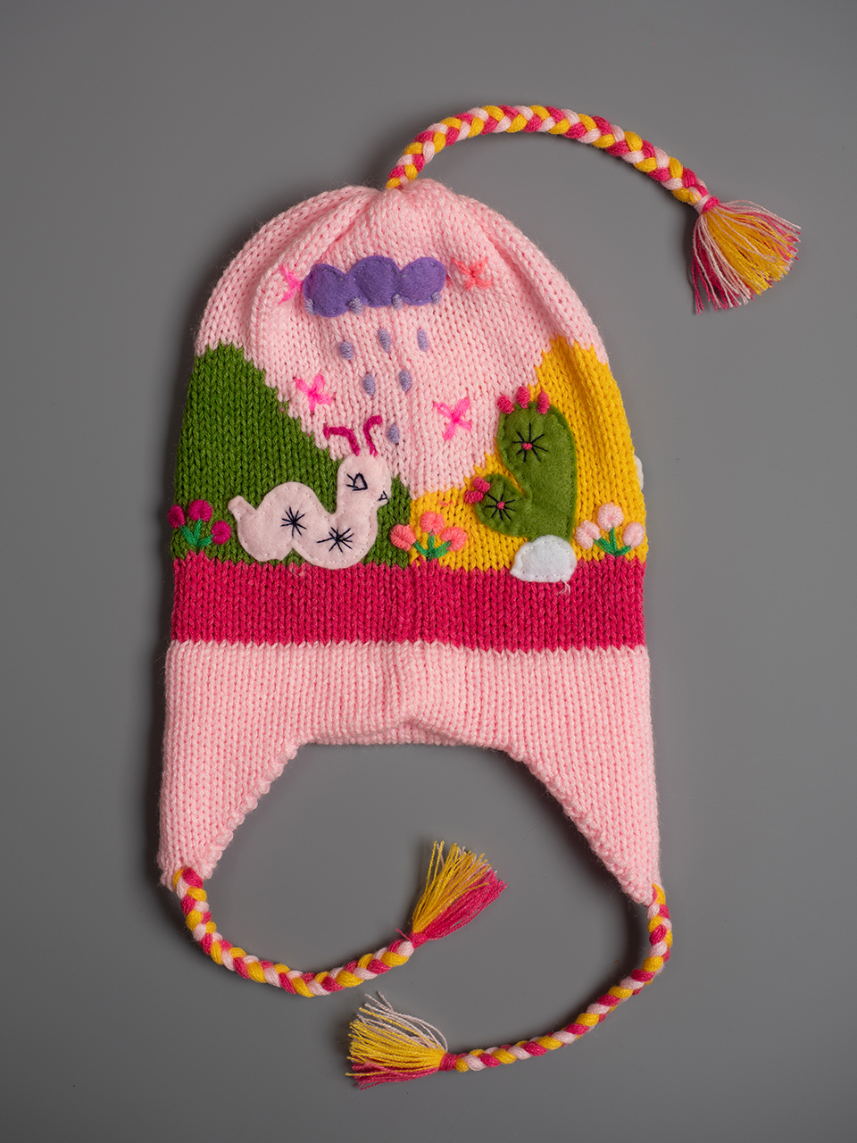 Детска шапка розова 2 - 8 години 15.34 € Перуанска детска зимна шапка със сцени от андинската природа, както отпред, така и отзад. Всеки детайл е ръчно зашит и завършен, за да се създаде 3-D ефект. Подходяща за деца от 2 до 8 години. « предходен продукт следващ продукт » Добави в кошницата