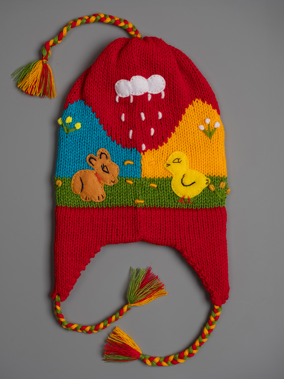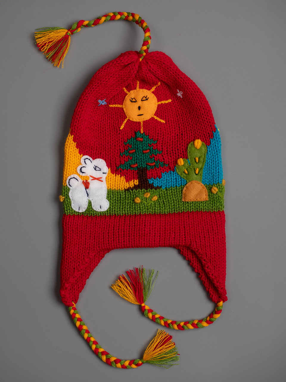 Детска шапка червена 2 - 8 години 15.34 € Перуанска детска зимна шапка със сцени от андинската природа, както отпред, така и отзад. Всеки детайл е ръчно зашит и завършен, за да се създаде 3-D ефект. Подходяща за деца от 2 до 8 години. « предходен продукт следващ продукт » Добави в кошницата
