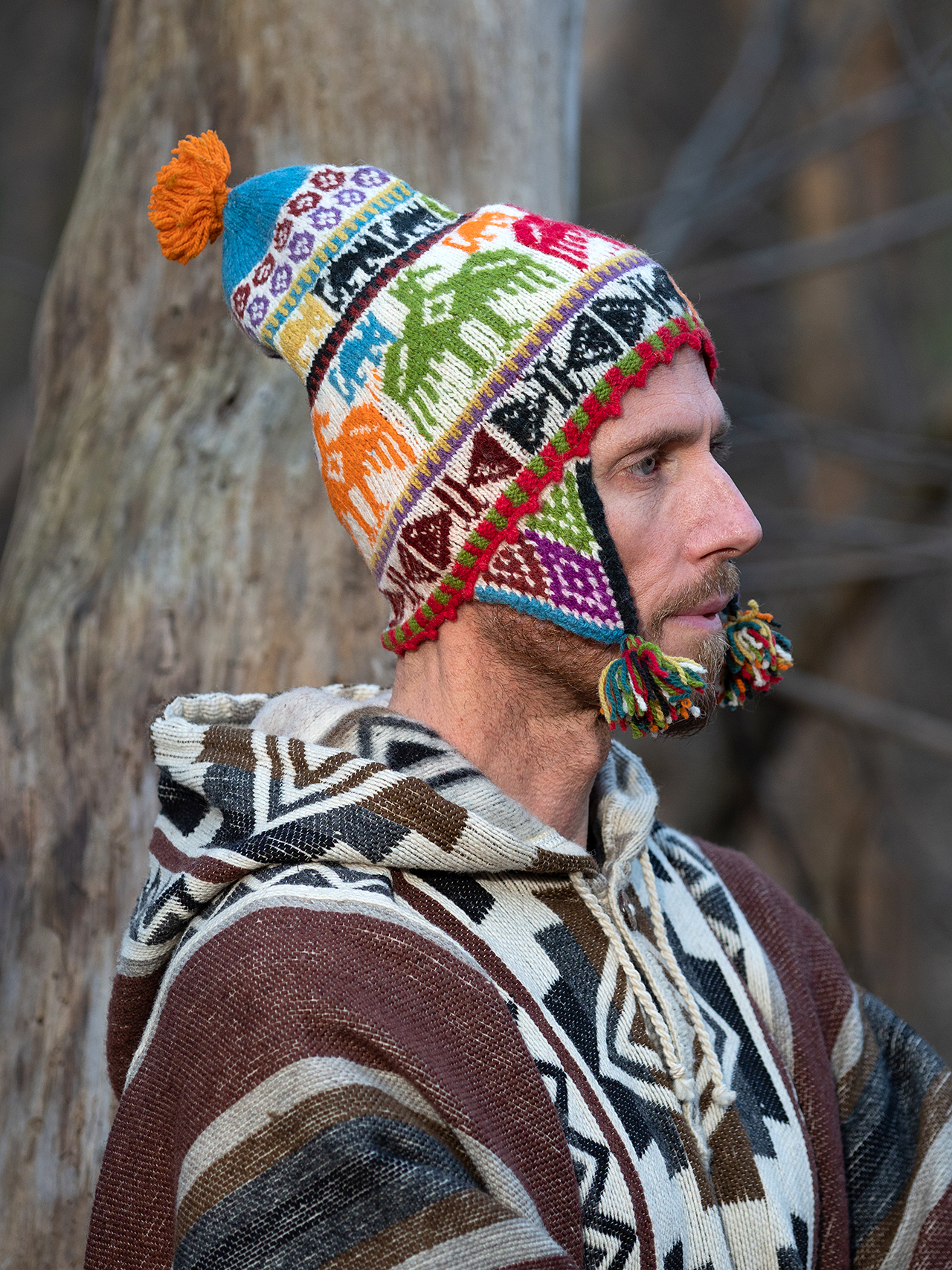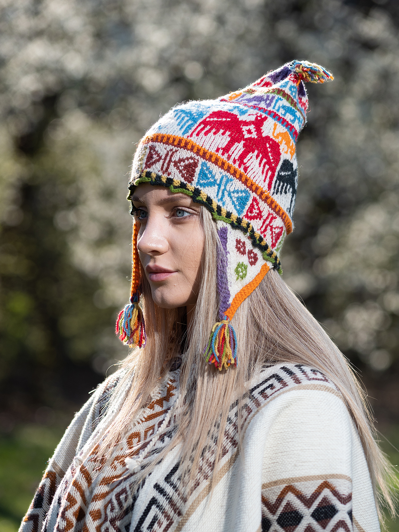 Автентична ръчно плетена на пет куки шапка Chullo от овча вълна. Вълната е боядисана с растителни бои в различни цветове и нюанси. Шапките са изработени в общността Chulloruwana Wasi, Sicuani, Cusco. Цветовете символизират Планината на Седемте Цвята, която е близо до Куско.