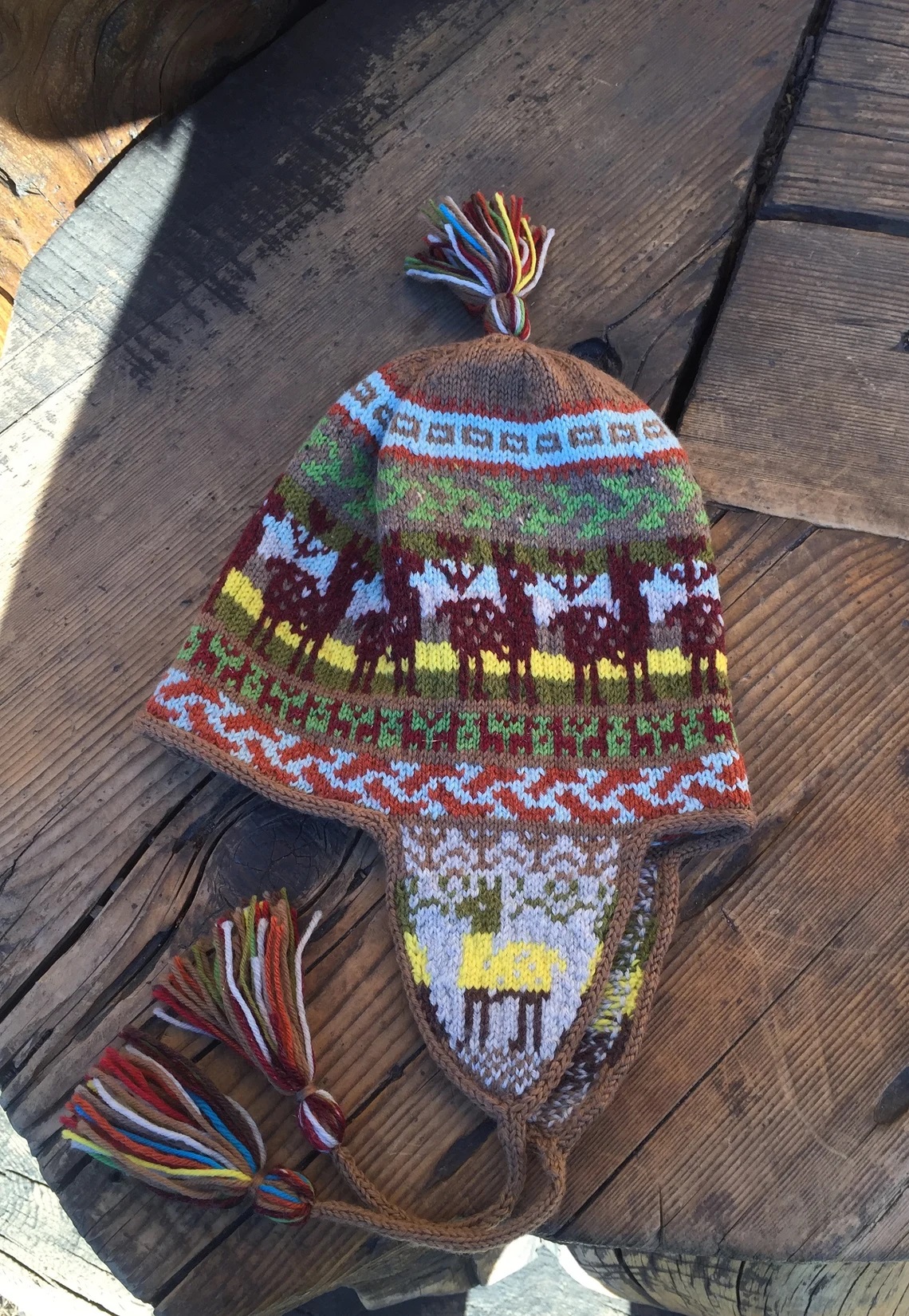 Автентична ръчно плетена на пет куки шапка Chullo от вълна на алпака. Шапките са изработени в общността Chulloruwana Wasi, Sicuani, Cusco.