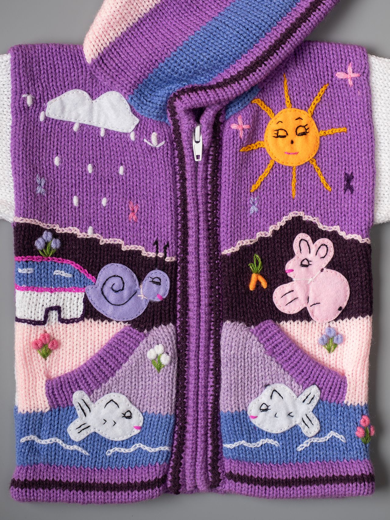 Известни в Перу с името Chompas Arpilleras, жилетките са ръчно изработени от занаятчии от коренното население на перуанските Анди, от древните култури Аймара и Кечуа. Изобразяват сцени от перуанската природа както отпред, така и отзад на дрехата. Слънцето свети в планините, а лами и пилета се хранят в подножието. Всеки детайл е ръчно зашит и завършен, за да се създаде 3-D ефект. Можем да Ви предложим широка гама от цветове за момчета и момичета, както и избор от размери от 0 до 7 години.
