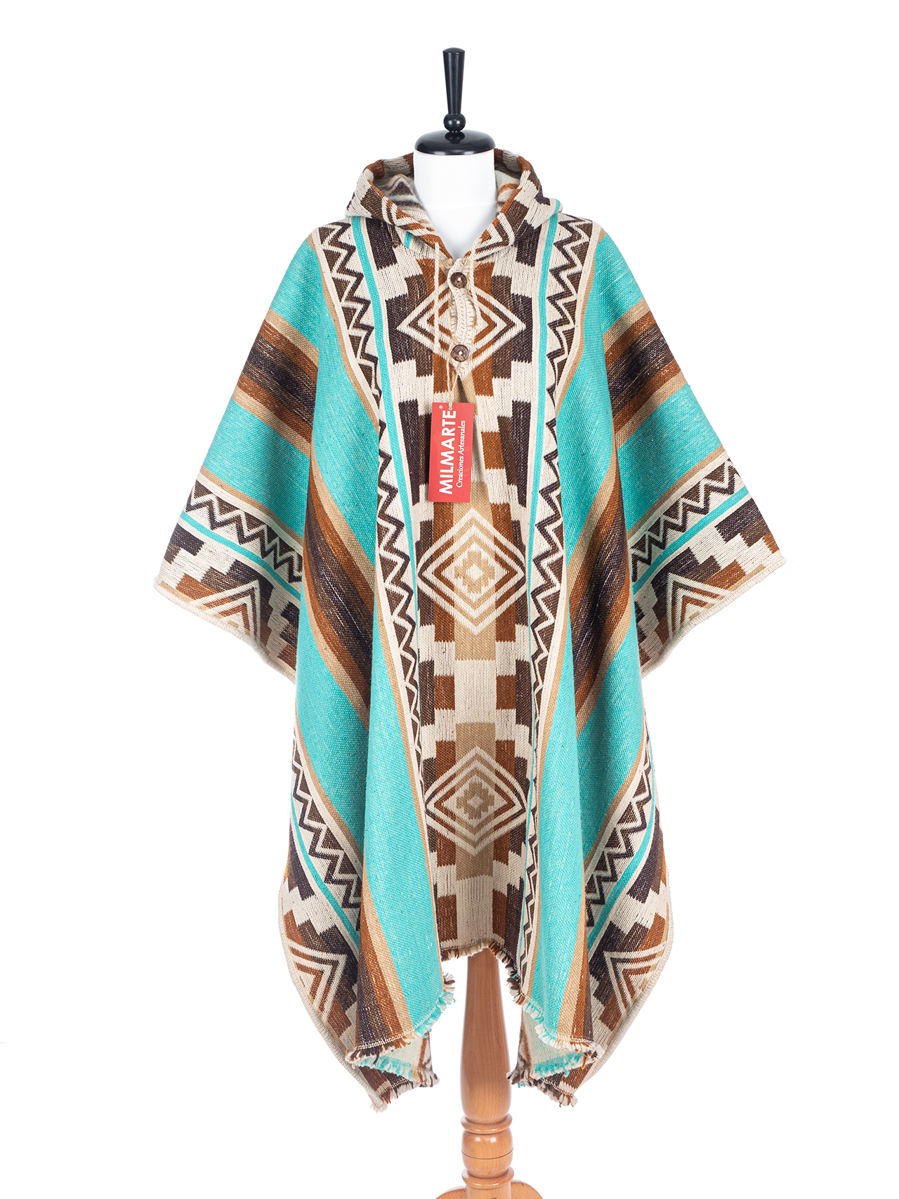 Пончо Mapuche, унисекс, тюркоазено синьо 127.82 € Представяме ви пончотата модел Mapuche, 100% овча вълна, тъкани на стан, невероятно плътни, и тежки, теглото на едно пончо е 1.400 кг. « предходен продукт следващ продукт » Добави в кошницата