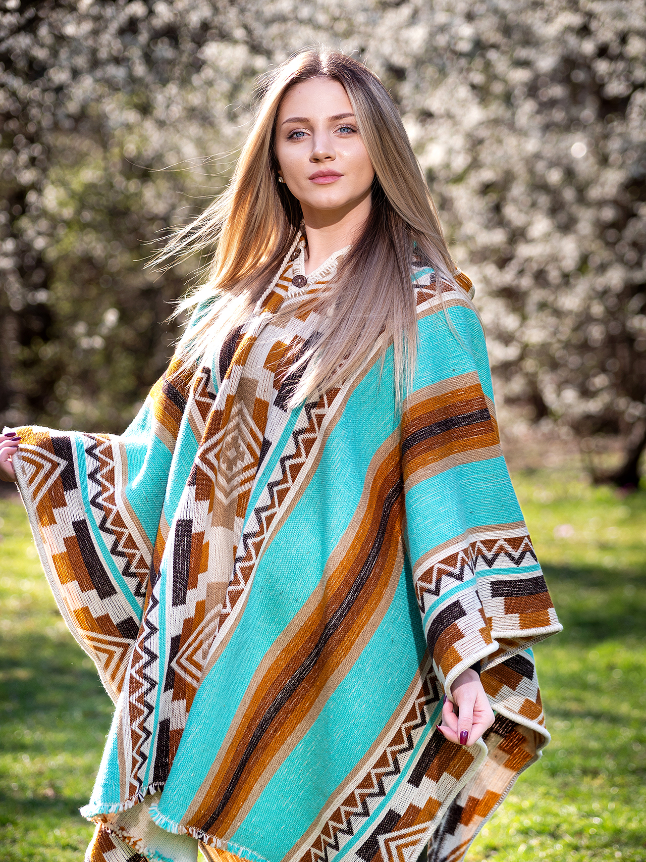 Пончо Mapuche, унисекс, тюркоазено синьо 127.82 € Представяме ви пончотата модел Mapuche, 100% овча вълна, тъкани на стан, невероятно плътни, и тежки, теглото на едно пончо е 1.400 кг. « предходен продукт следващ продукт » Добави в кошницата