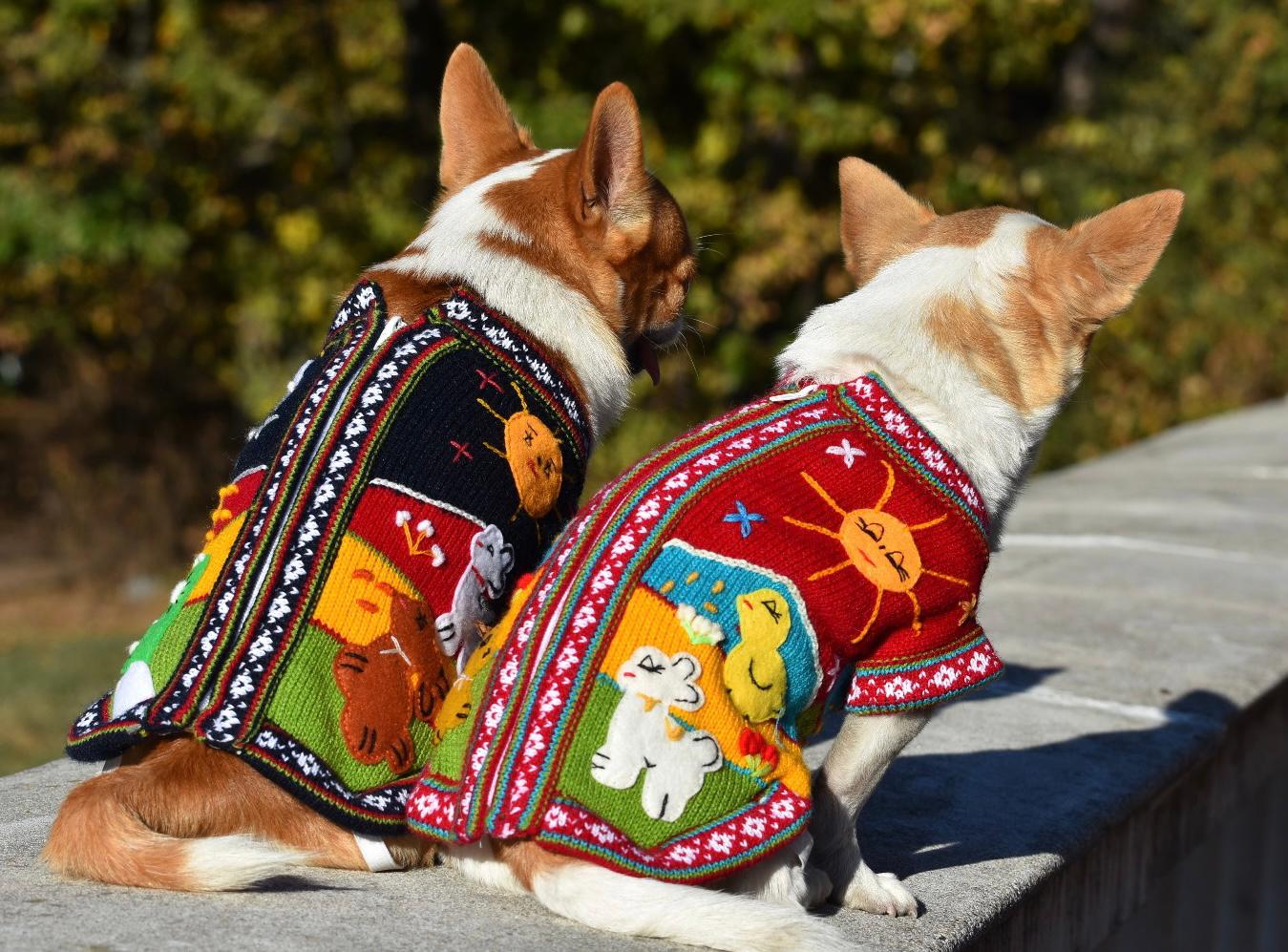 Дрешка за куче или коте, със сцени от андинската природа както отпред, така и отзад. Всеки детайл е ръчно бродиран и завършен, за да се създаде 3-D ефект. Дрешките са подходящи за кучета и котки между 1 и 15 кг.