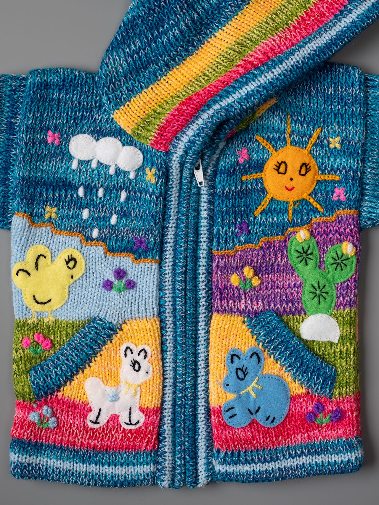 Известни в Перу с името Chompas Arpilleras, жилетките са ръчно изработени от занаятчии от коренното население на перуанските Анди, от древните култури Аймара и Кечуа. Изобразяват сцени от перуанската природа както отпред, така и отзад на дрехата. Слънцето свети в планините, а лами и пилета се хранят в подножието. Всеки детайл е ръчно зашит и завършен, за да се създаде 3-D ефект. Можем да Ви предложим широка гама от цветове за момчета и момичета, както и избор от размери от 0 до 7 години.