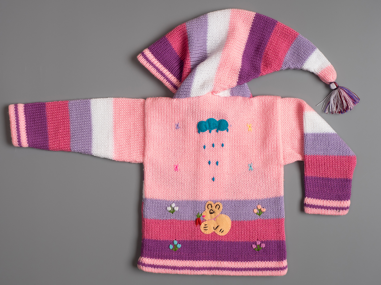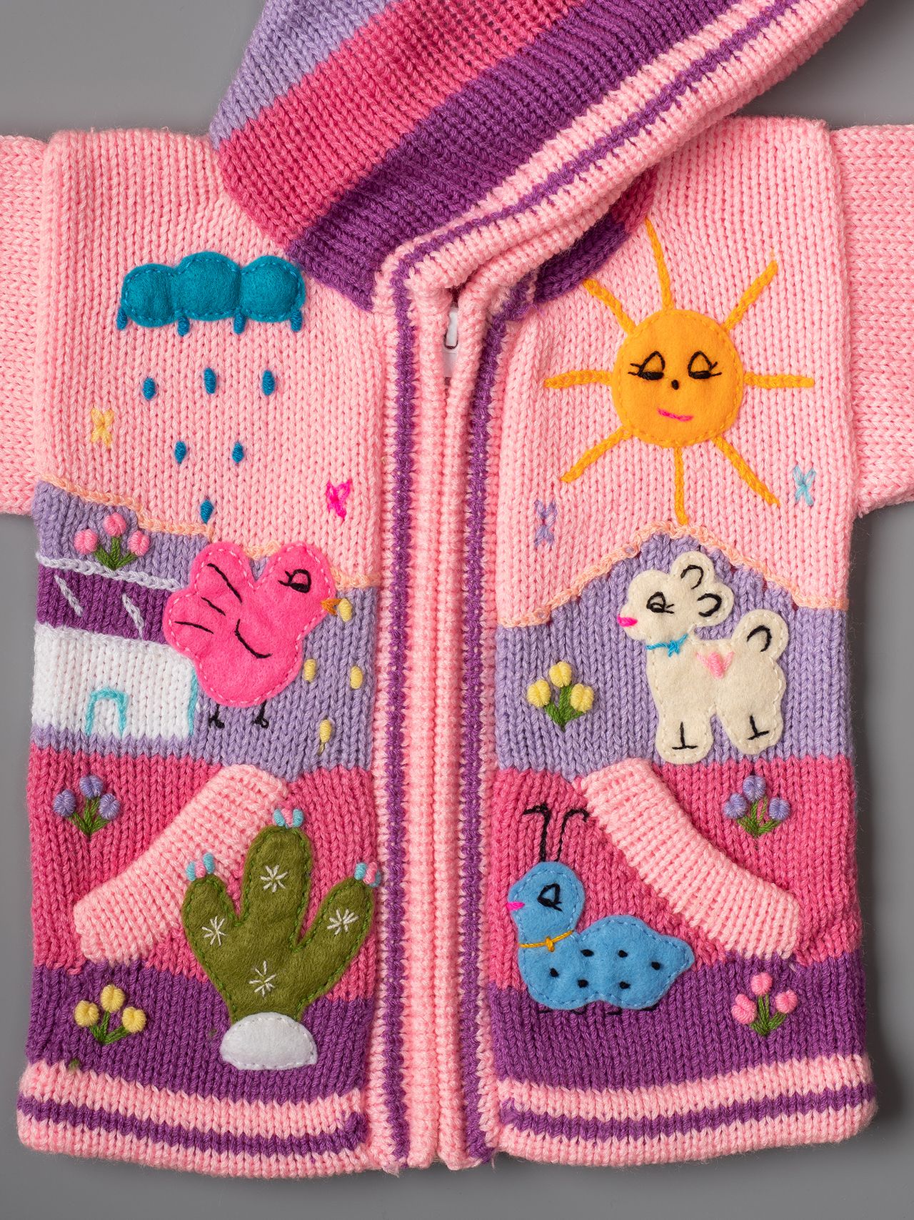 Известни в Перу с името Chompas Arpilleras, жилетките са ръчно изработени от занаятчии от коренното население на перуанските Анди, от древните култури Аймара и Кечуа. Изобразяват сцени от перуанската природа както отпред, така и отзад на дрехата. Слънцето свети в планините, а лами и пилета се хранят в подножието. Всеки детайл е ръчно зашит и завършен, за да се създаде 3-D ефект. Можем да Ви предложим широка гама от цветове за момчета и момичета, както и избор от размери от 0 до 7 години.