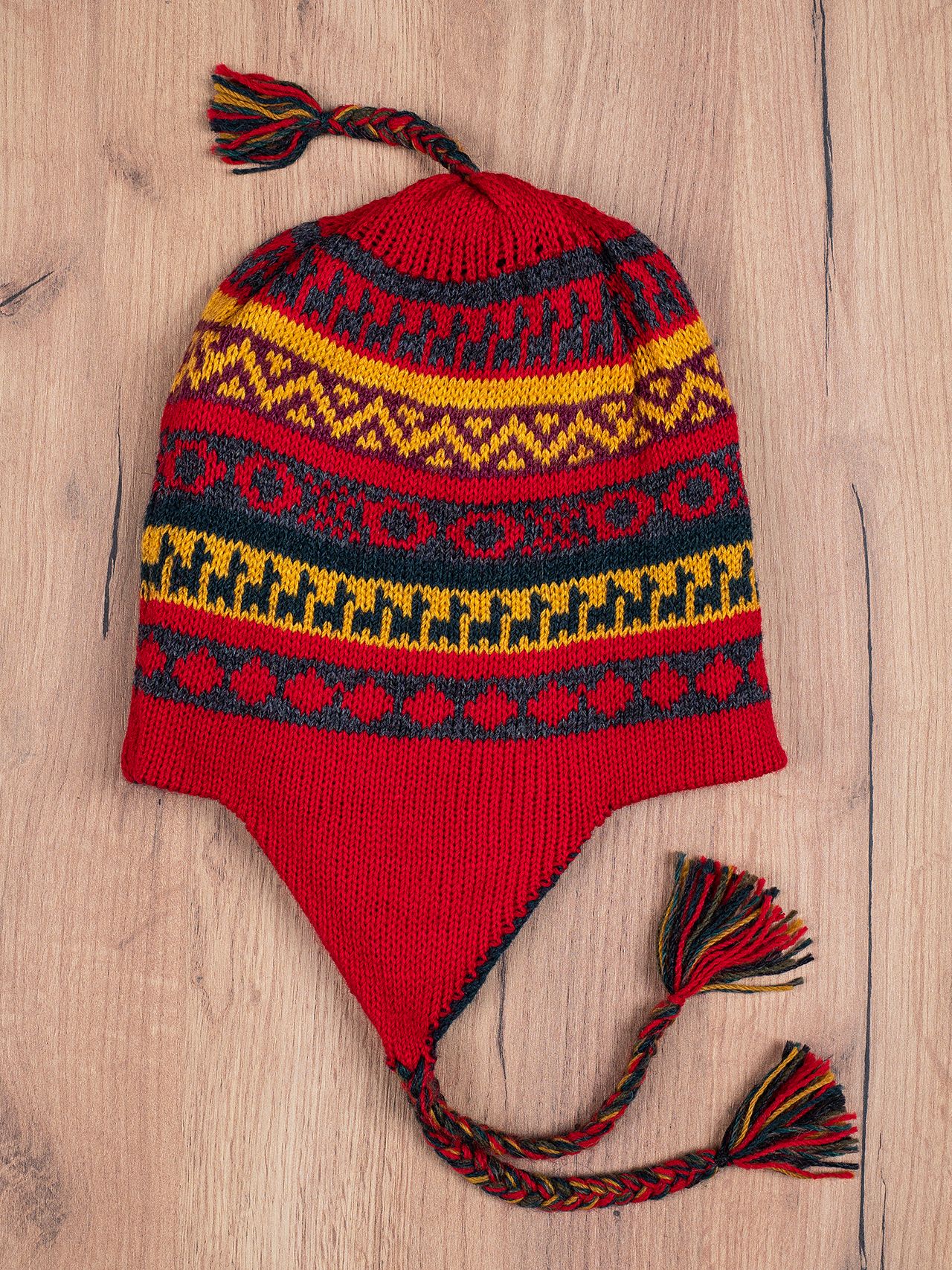 Authentic double-sided Peruvian Chullo hat with alpaca wool, in the typical Andean colors and shape.