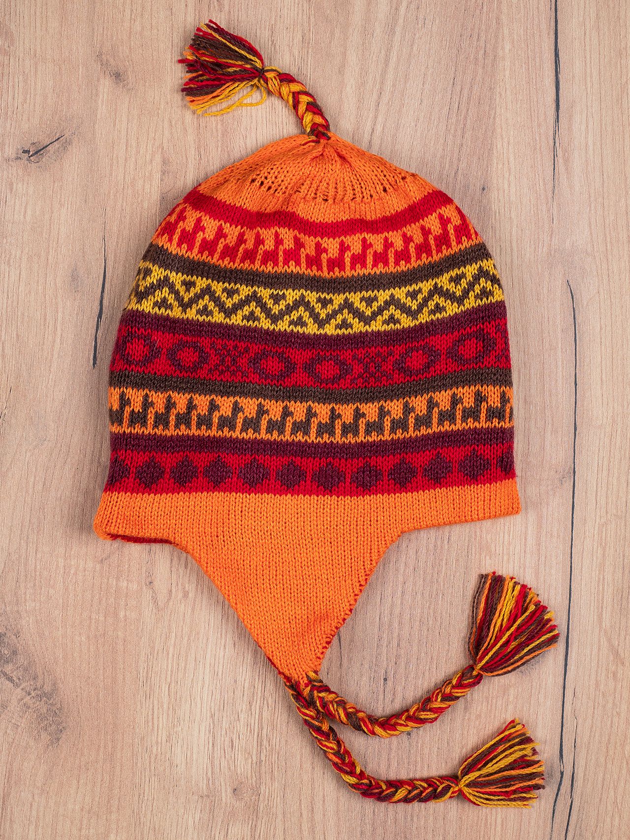 Authentic double-sided Peruvian Chullo hat with alpaca wool, in the typical Andean colors and shape.