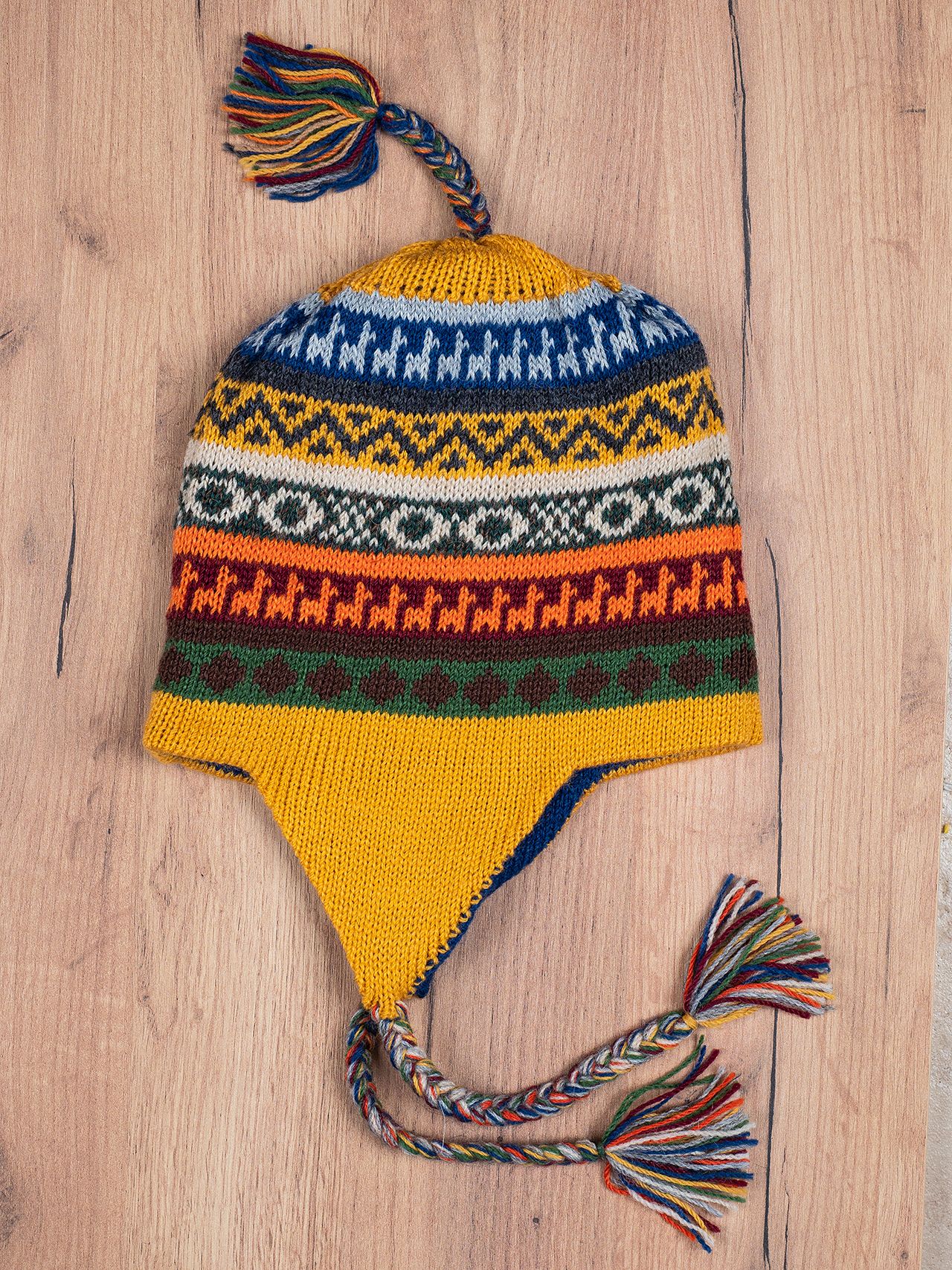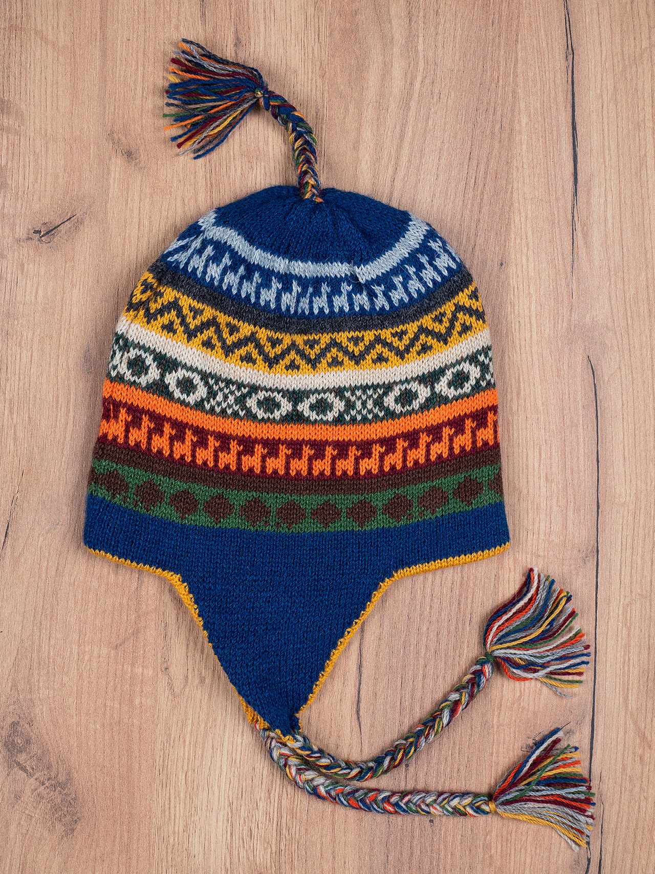 Authentic double-sided Peruvian Chullo hat with alpaca wool, in the typical Andean colors and shape.