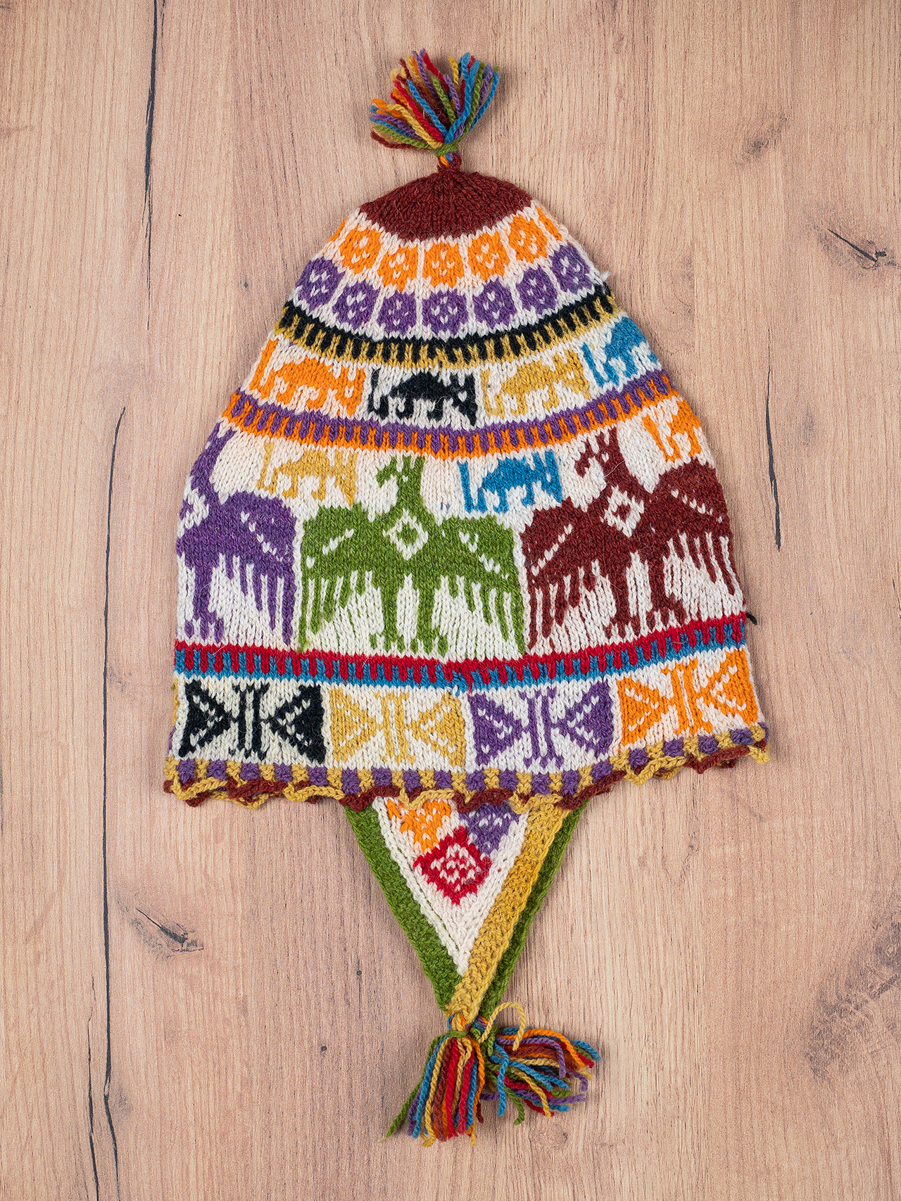 Authentic hand knitted sheep wool Chullo hat. The wool is dyed with plant-based dyes in different colors and shades. The Chullos are made in the Chulloruwana Wasi community, Sicuani, Cusco. The colors represent the Mountain of Seven Colors near Cusco.
