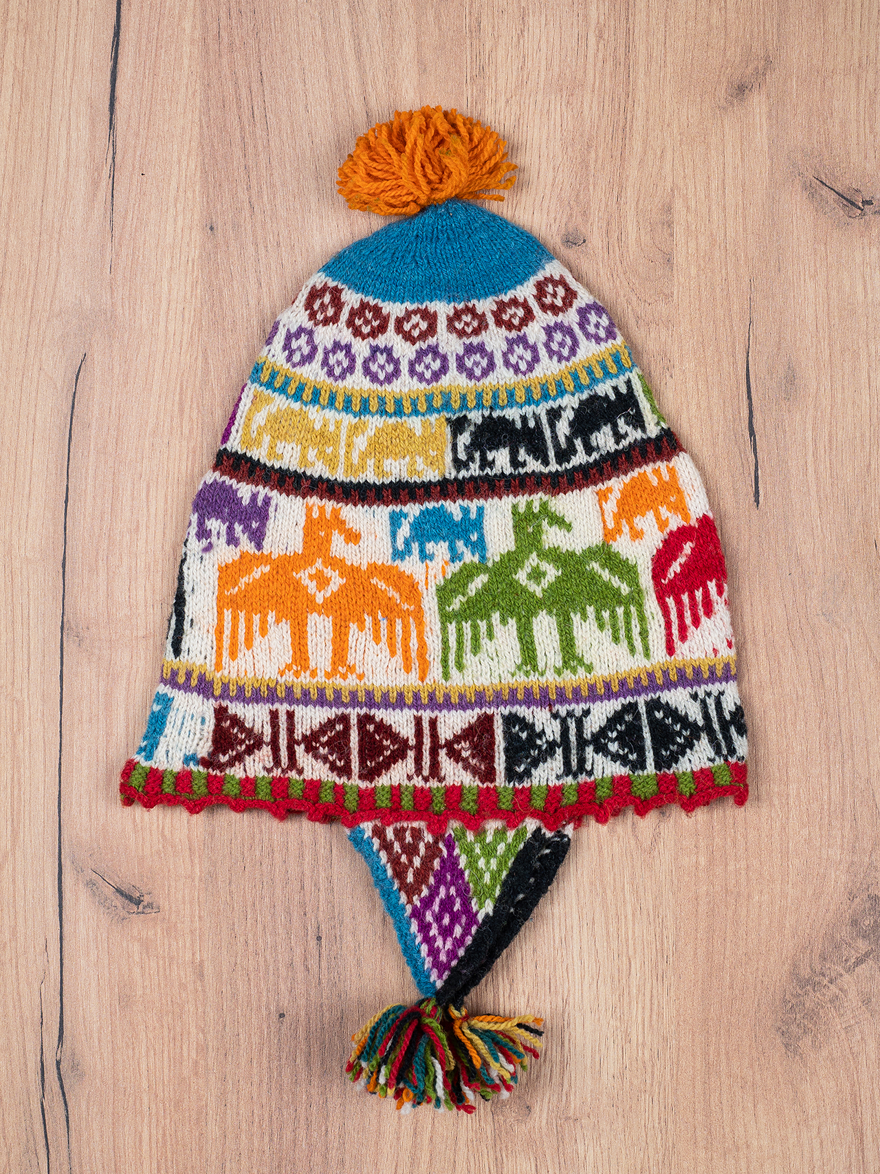 Authentic hand knitted sheep wool Chullo hat. The wool is dyed with plant-based dyes in different colors and shades. The Chullos are made in the Chulloruwana Wasi community, Sicuani, Cusco. The colors represent the Mountain of Seven Colors near Cusco.