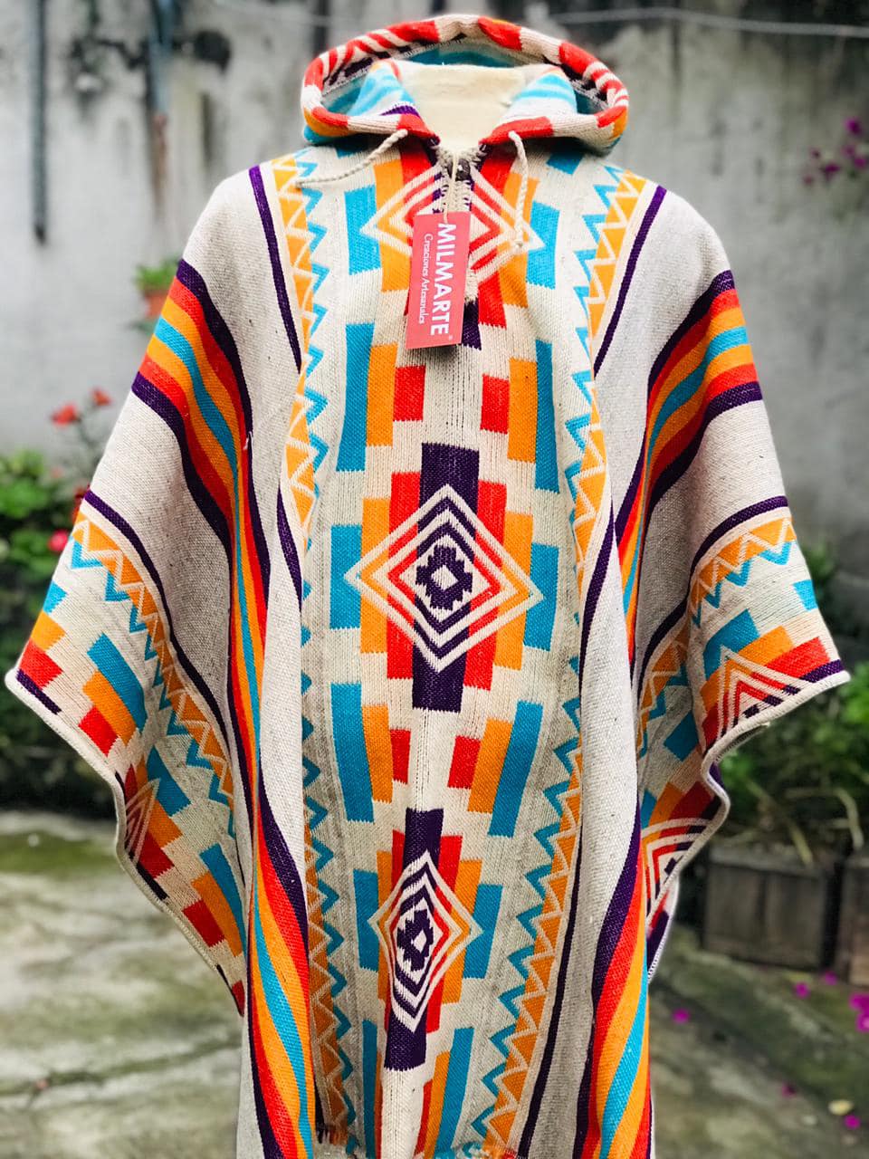 Mapuche poncho unisex beige 127 € We present you the Mapuche ponchos, 100% sheep wool, woven on a loom, incredibly thick and heavy, the weight of a poncho is 1,400 kg. « previous product next product » 0