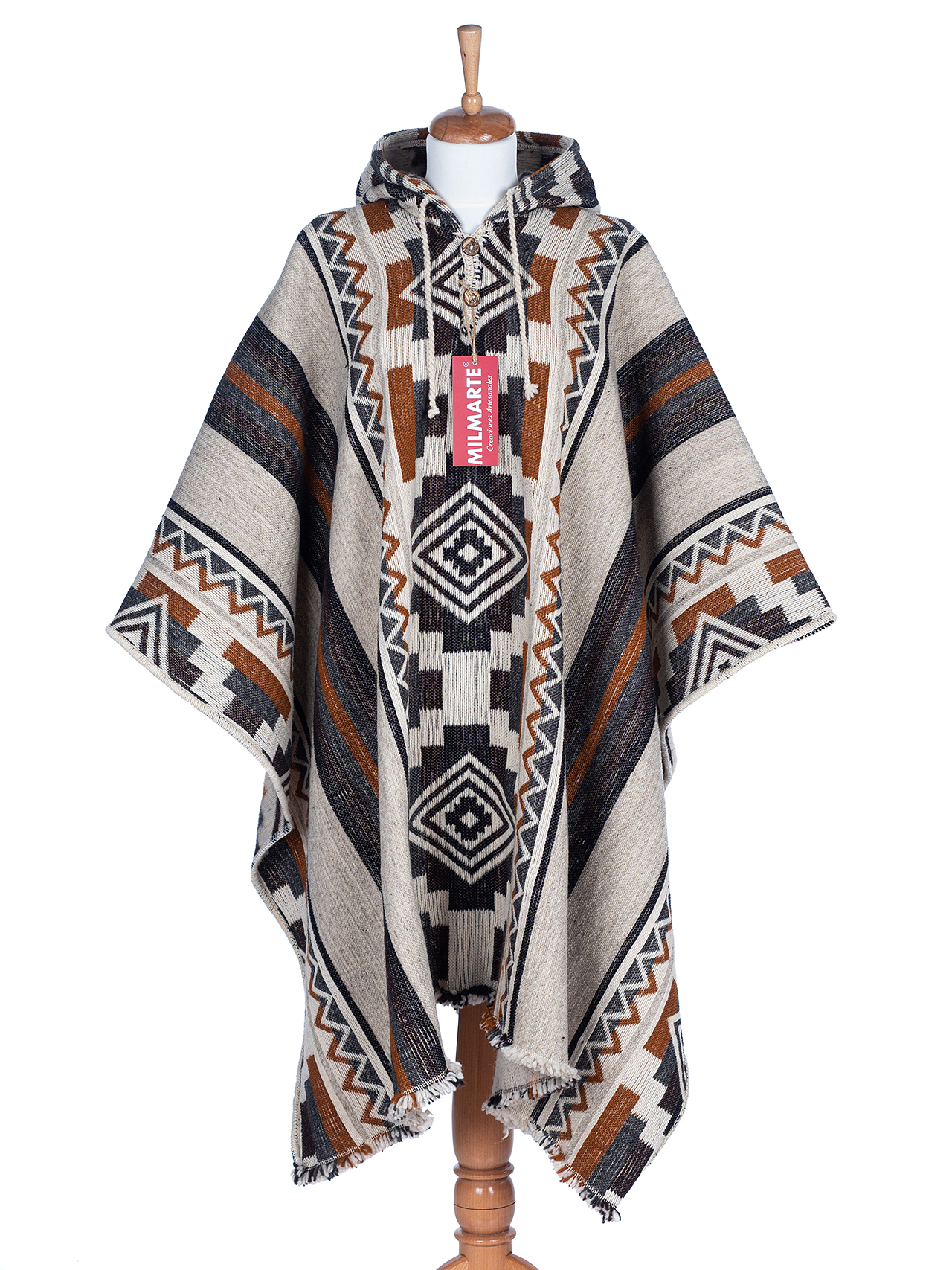 Mapuche poncho unisex beige 127 € We present you the Mapuche ponchos, 100% sheep wool, woven on a loom, incredibly thick and heavy, the weight of a poncho is 1,400 kg. « previous product next product » 0