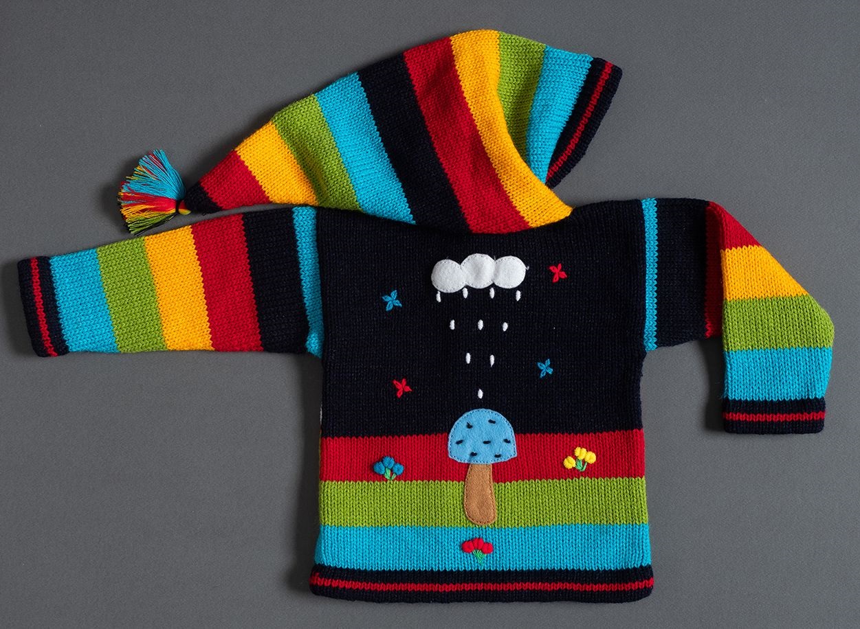 Known in Peru as Chompas Arpilleras, the cardigans are handmade by artisans from the Andes by the native cultures of Quechua and Aymara. They depict scenes of Peruvian nature both in front and behind the garment. The sun shines in the mountains and llamas and chickens feed at the foothills. Every detail is hand-embroderied and finished to create a 3-D effect. We can offer you a wide range of colors for boys and girls, as well as a choice of sizes from 0 to 7 years.