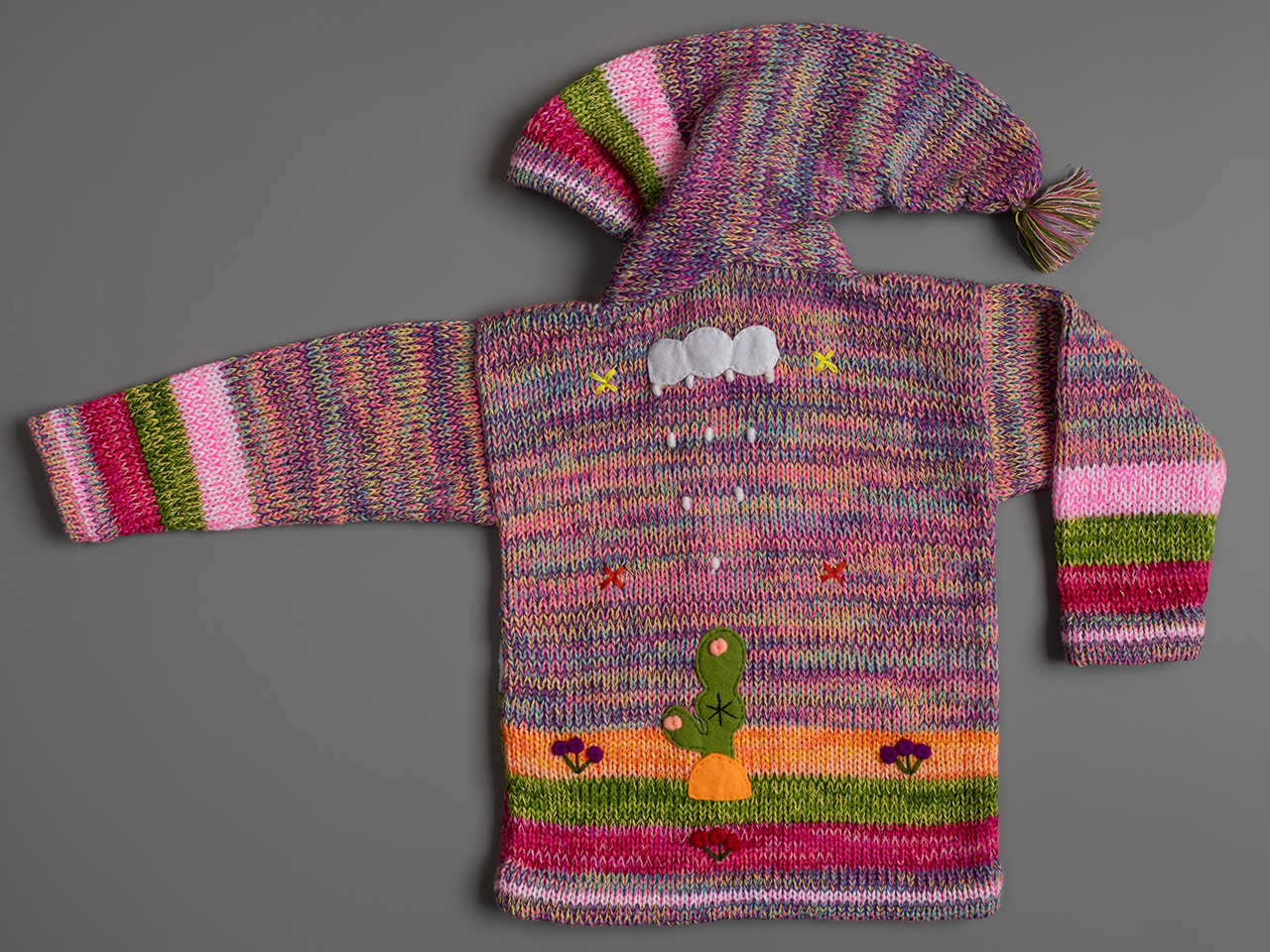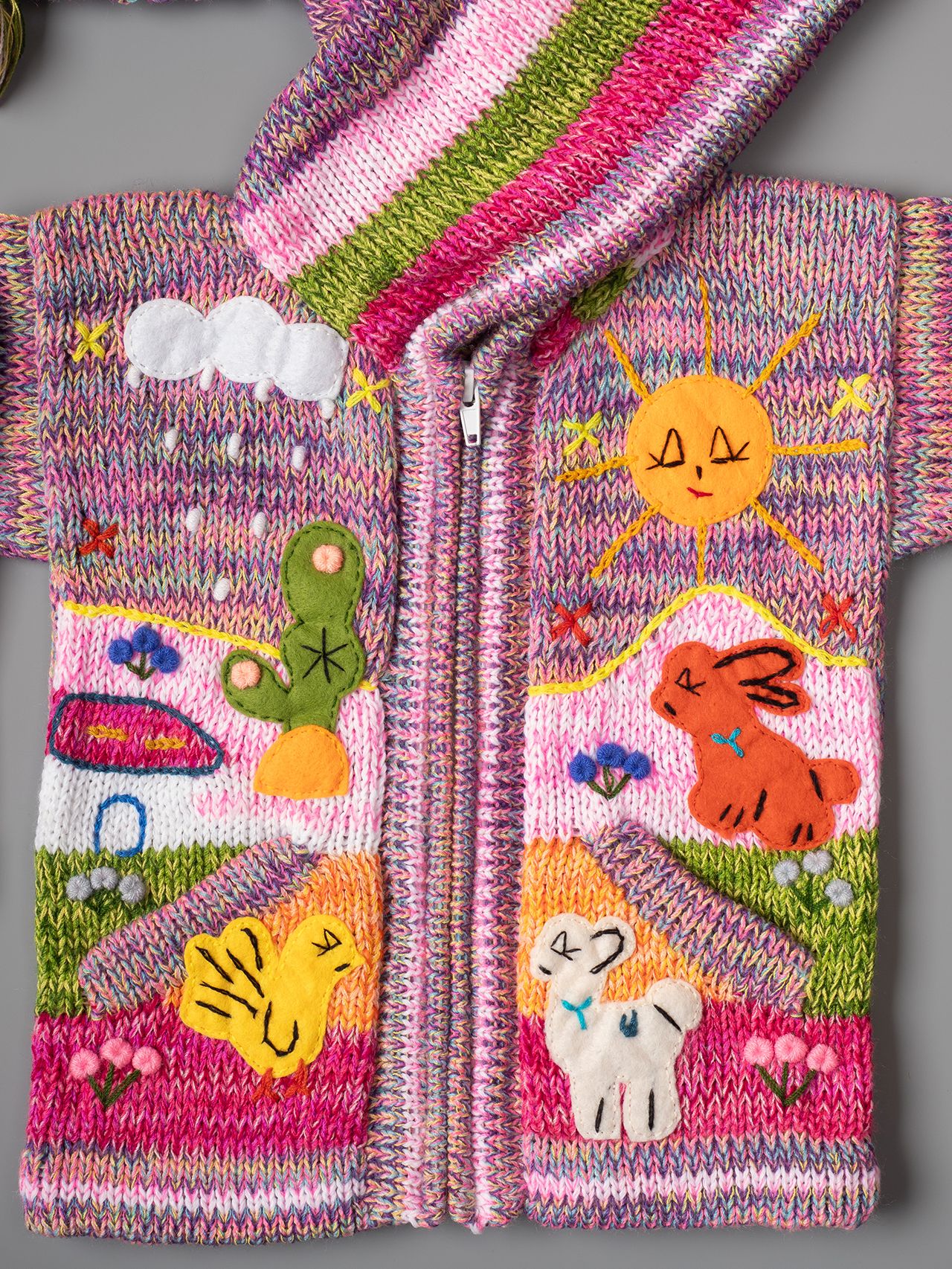 Known in Peru as Chompas Arpilleras, the cardigans are handmade by artisans from the Andes by the native cultures of Quechua and Aymara. They depict scenes of Peruvian nature both in front and behind the garment. The sun shines in the mountains and llamas and chickens feed at the foothills. Every detail is hand-embroderied and finished to create a 3-D effect. We can offer you a wide range of colors for boys and girls, as well as a choice of sizes from 0 to 7 years.