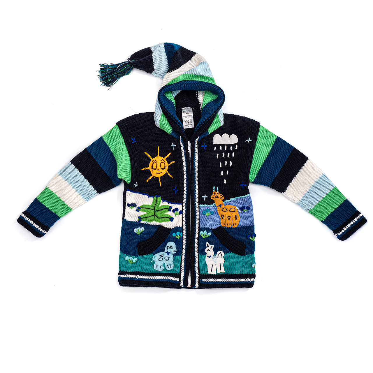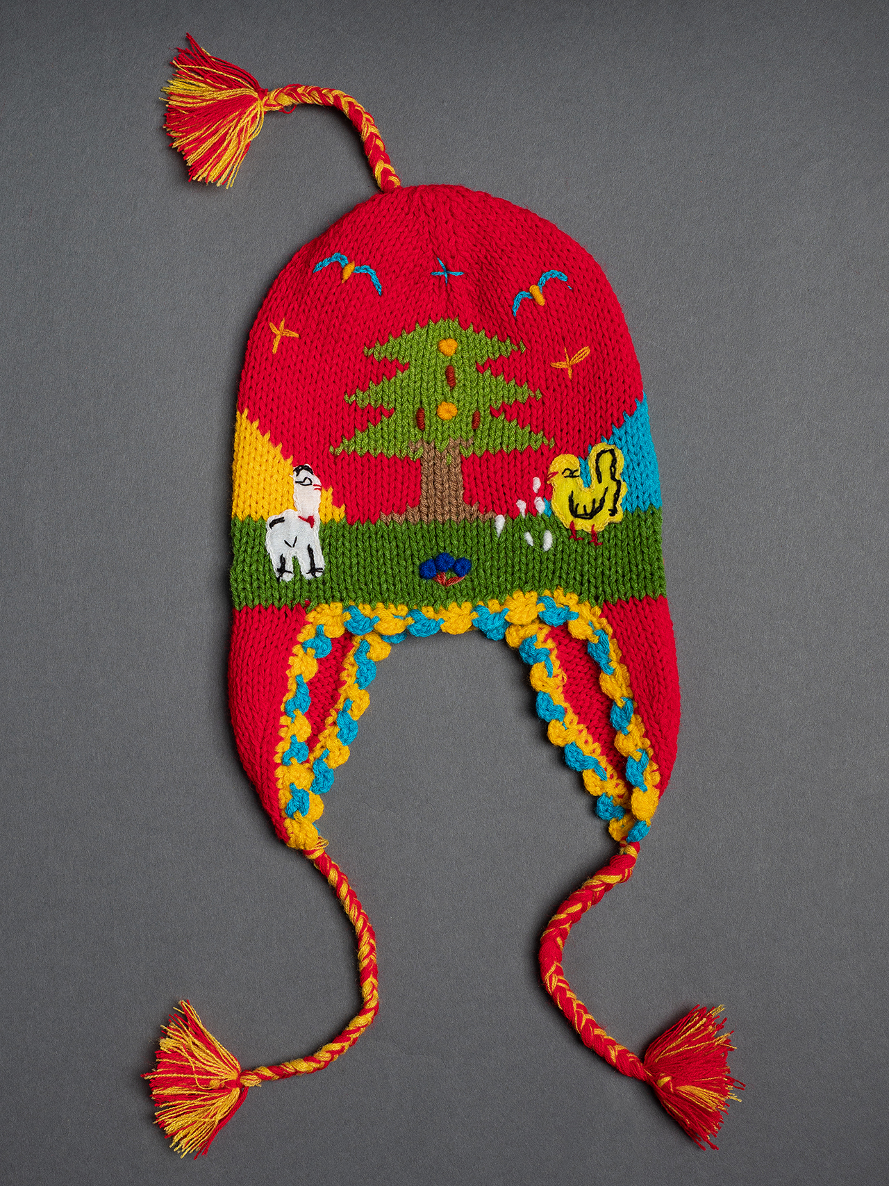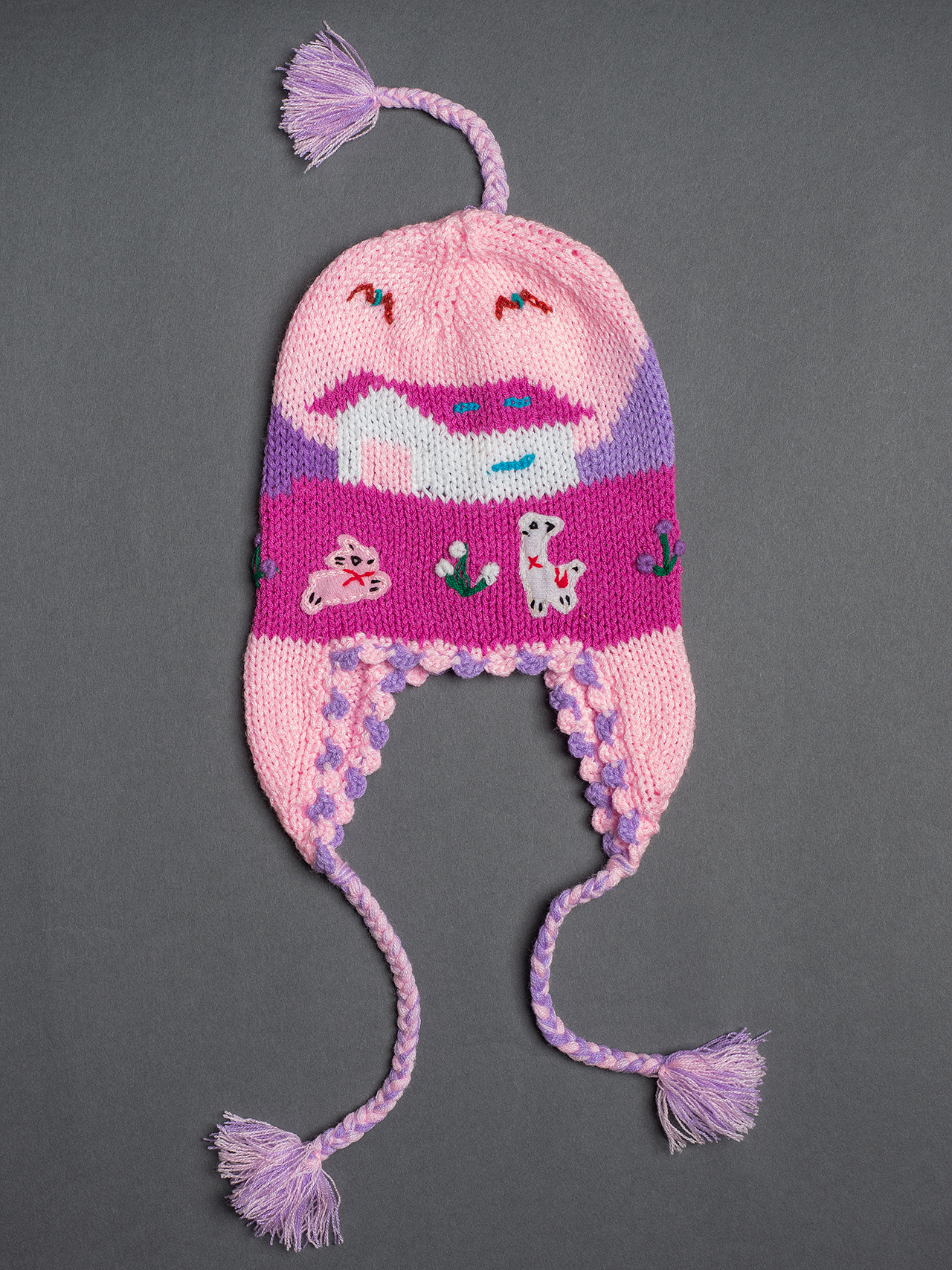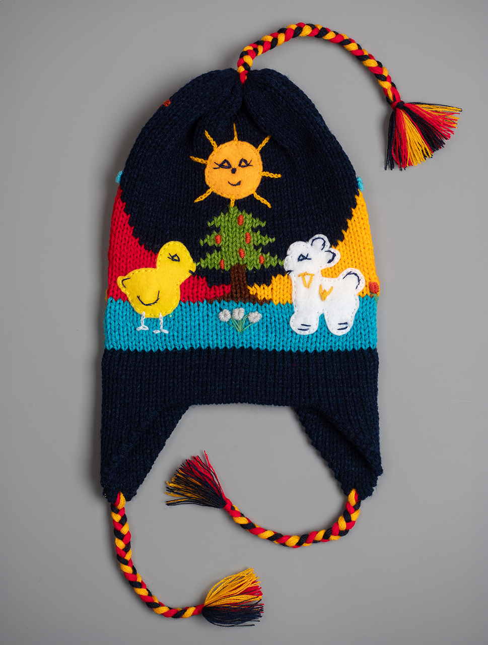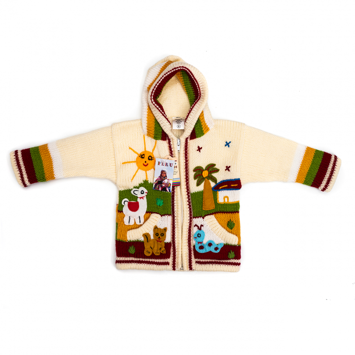 Peruvian children's winter hat with scenes from the Peruvian countryside both front and back. Every detail is hand embroidered and finished to create a 3-D effect. Suitable for children from 0 to 3 years.