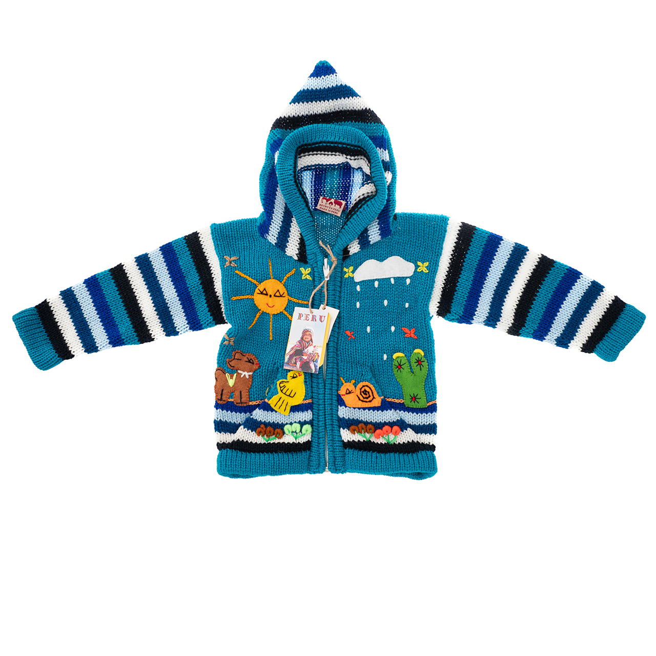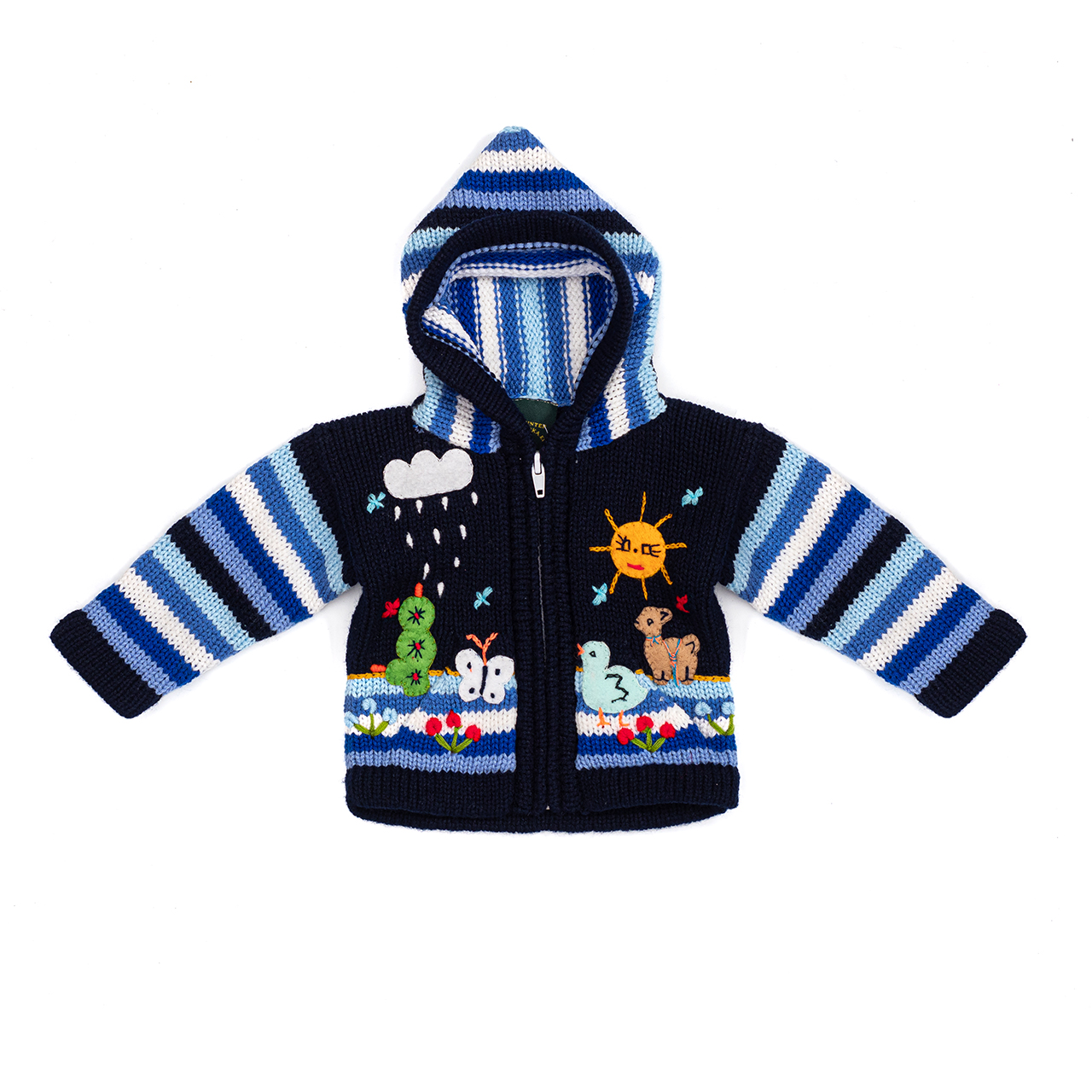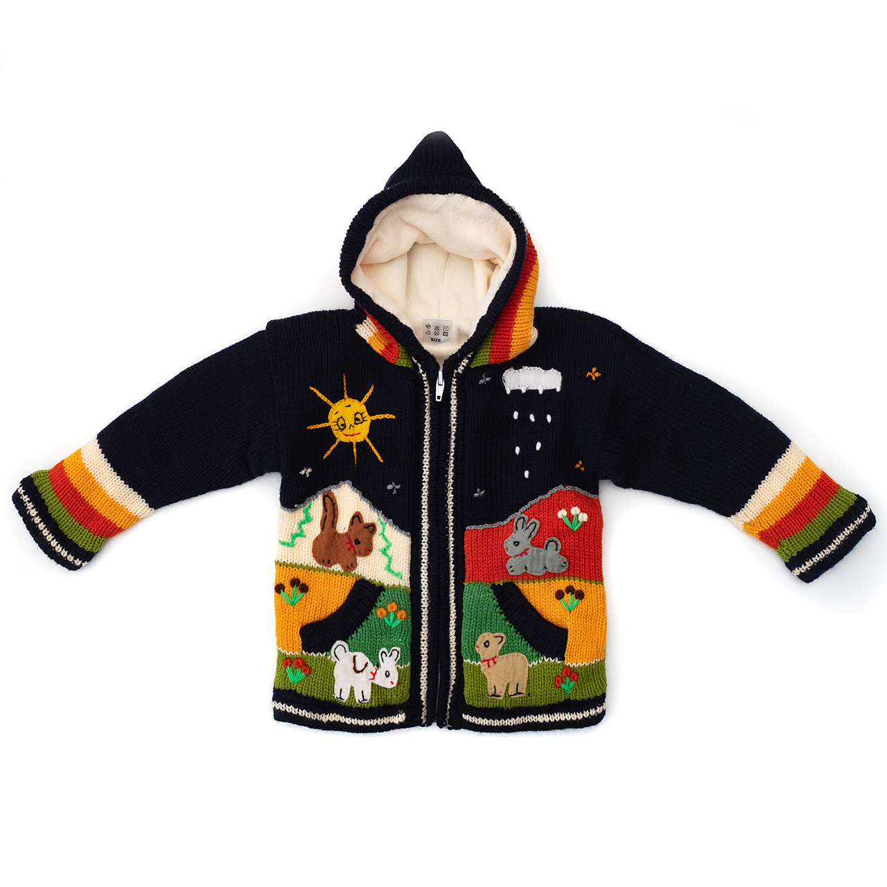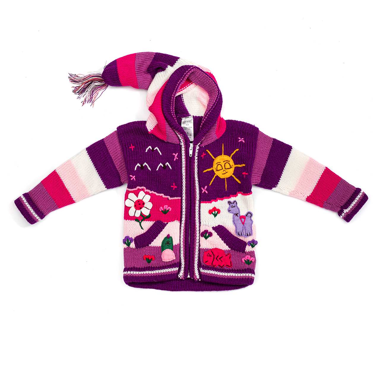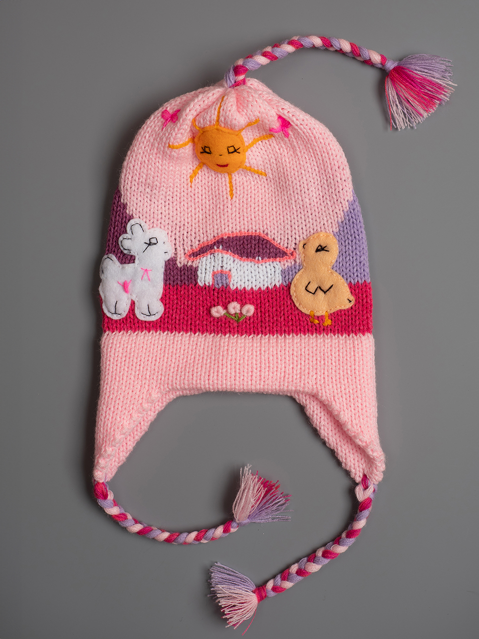 Peruvian children's winter hat with scenes from the Peruvian countryside both front and back. Every detail is hand embroidered and finished to create a 3-D effect. Suitable for children from 0 to 3 years.