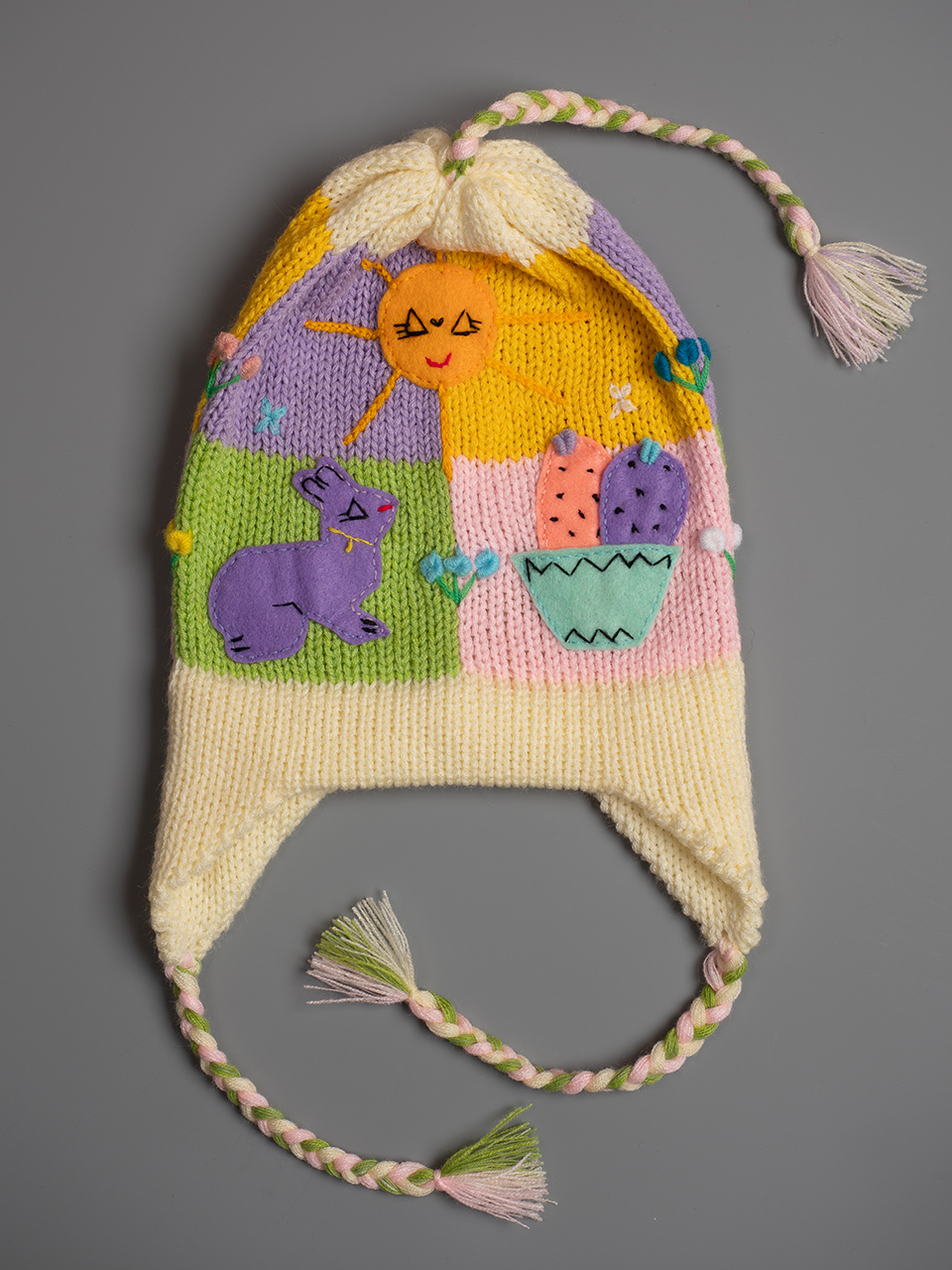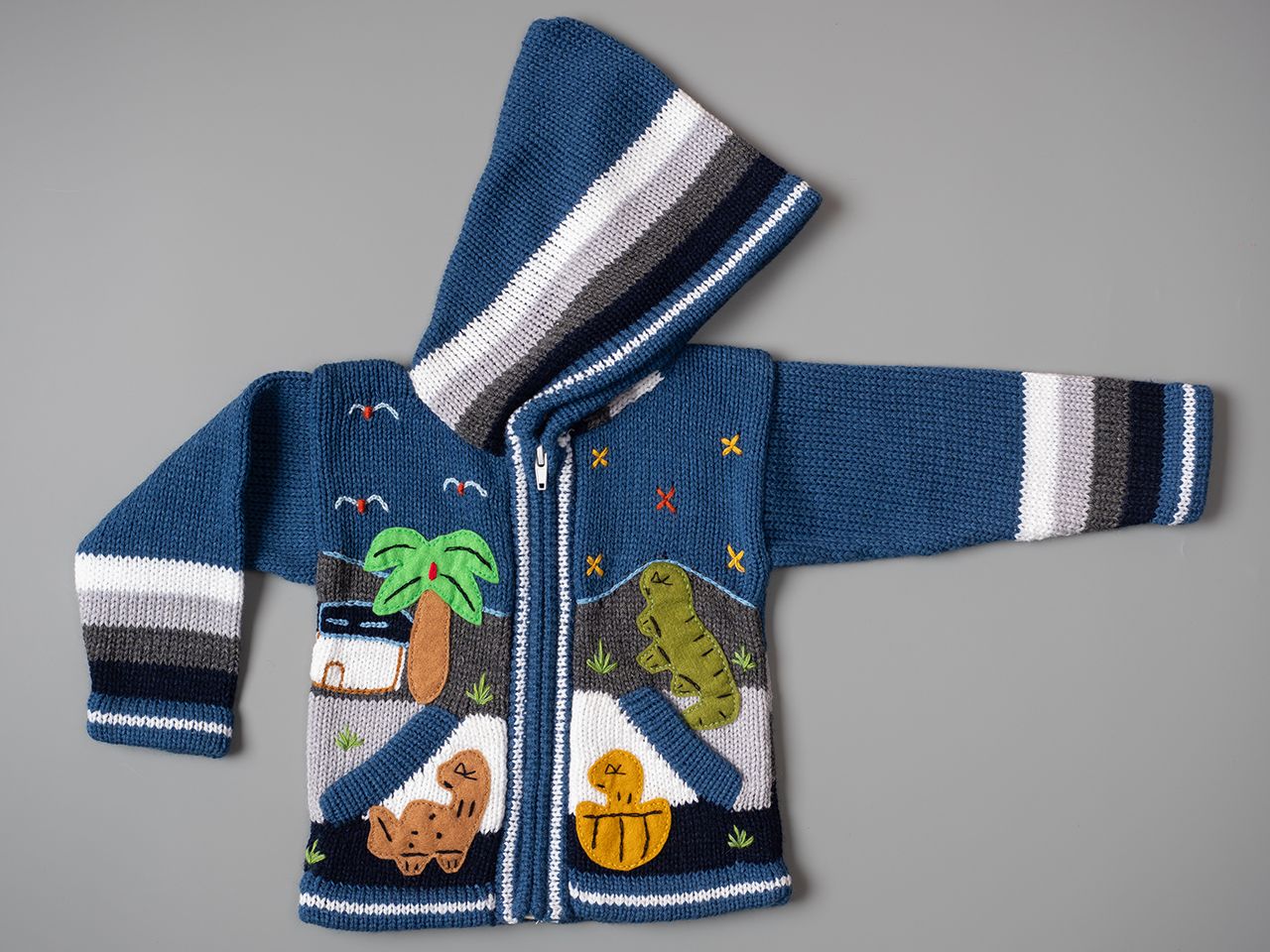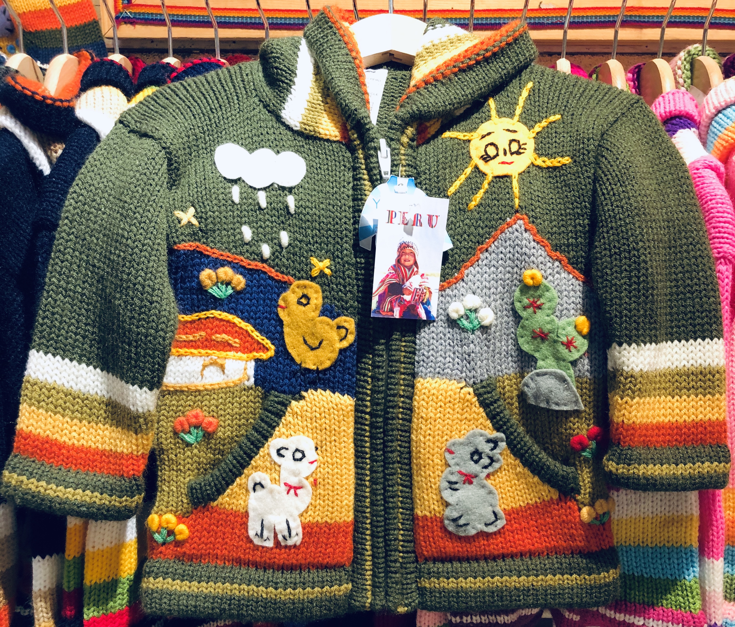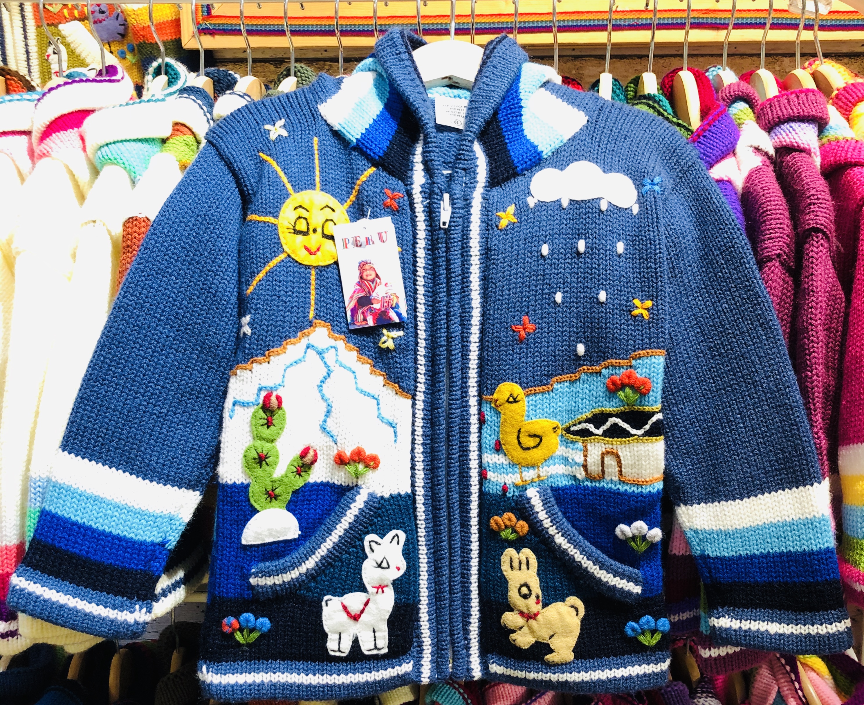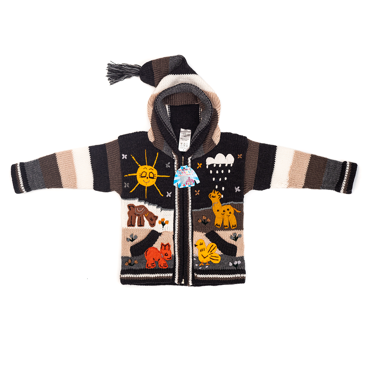 Peruvian children's winter hat with scenes from the Peruvian countryside both front and back. Every detail is hand embroidered and finished to create a 3-D effect. Suitable for children from 0 to 3 years.