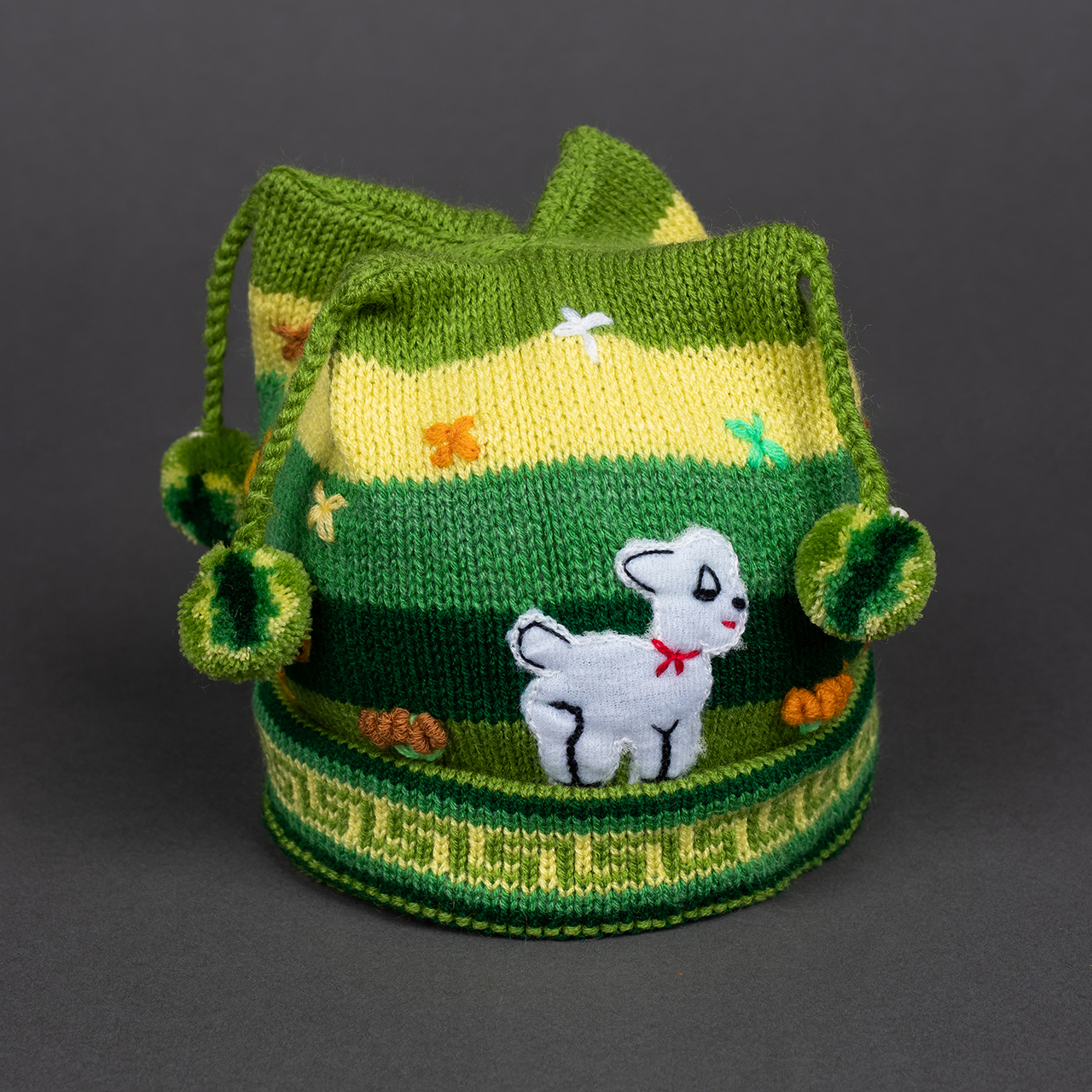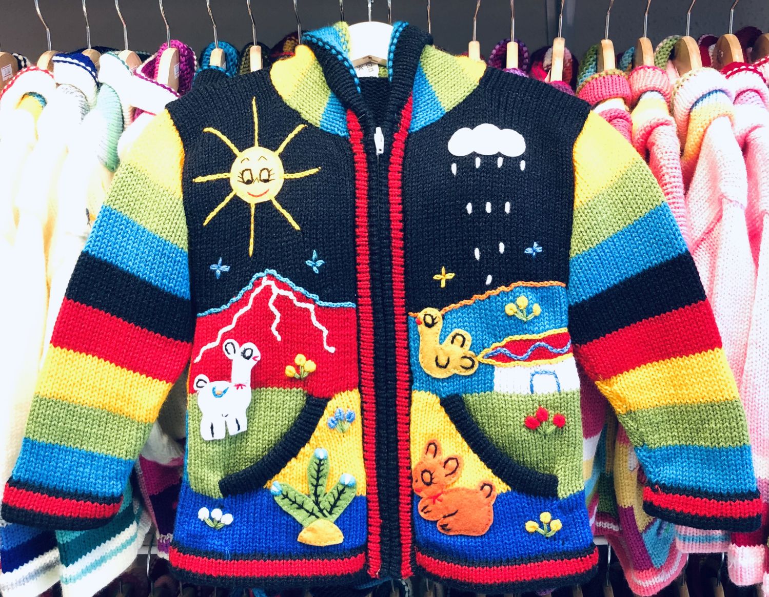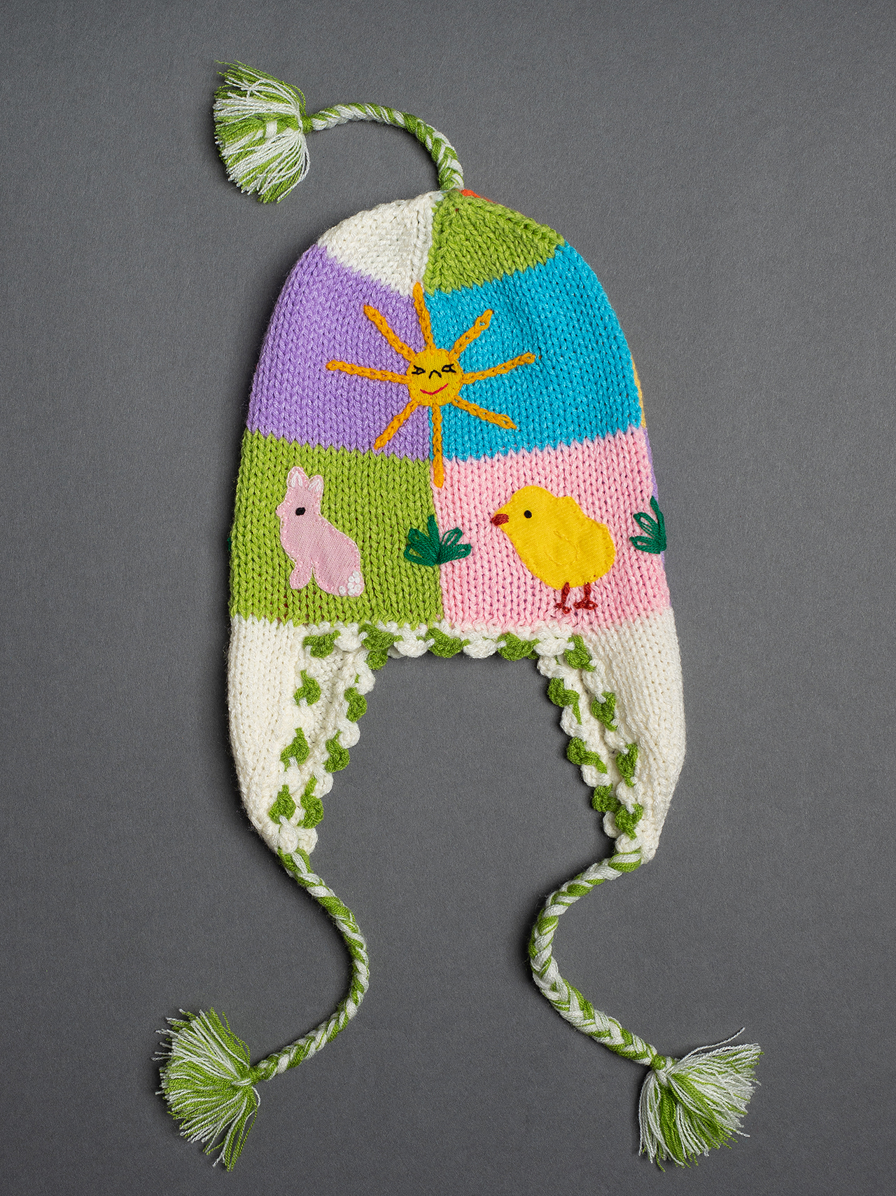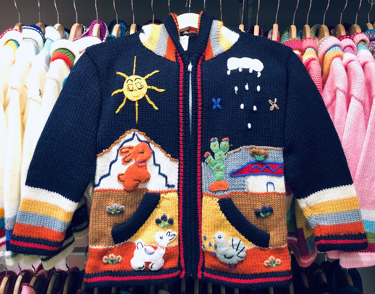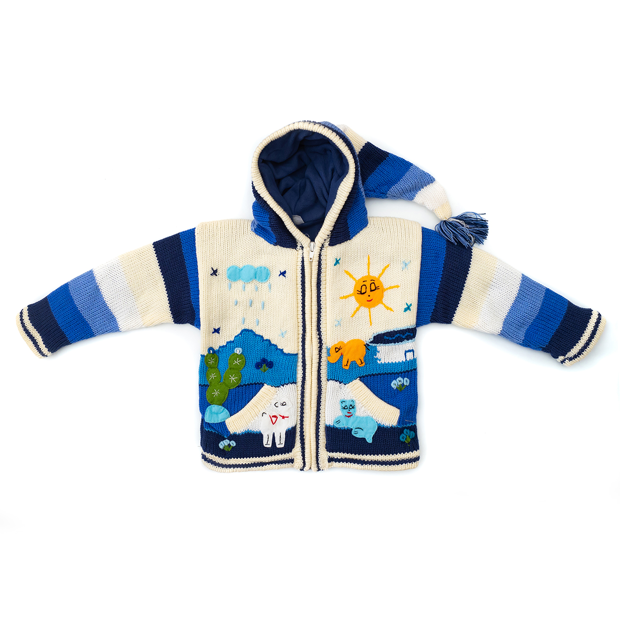 Peruvian children's winter hat with scenes from the Peruvian countryside both front and back. Every detail is hand embroidered and finished to create a 3-D effect. Suitable for children from 0 to 3 years.