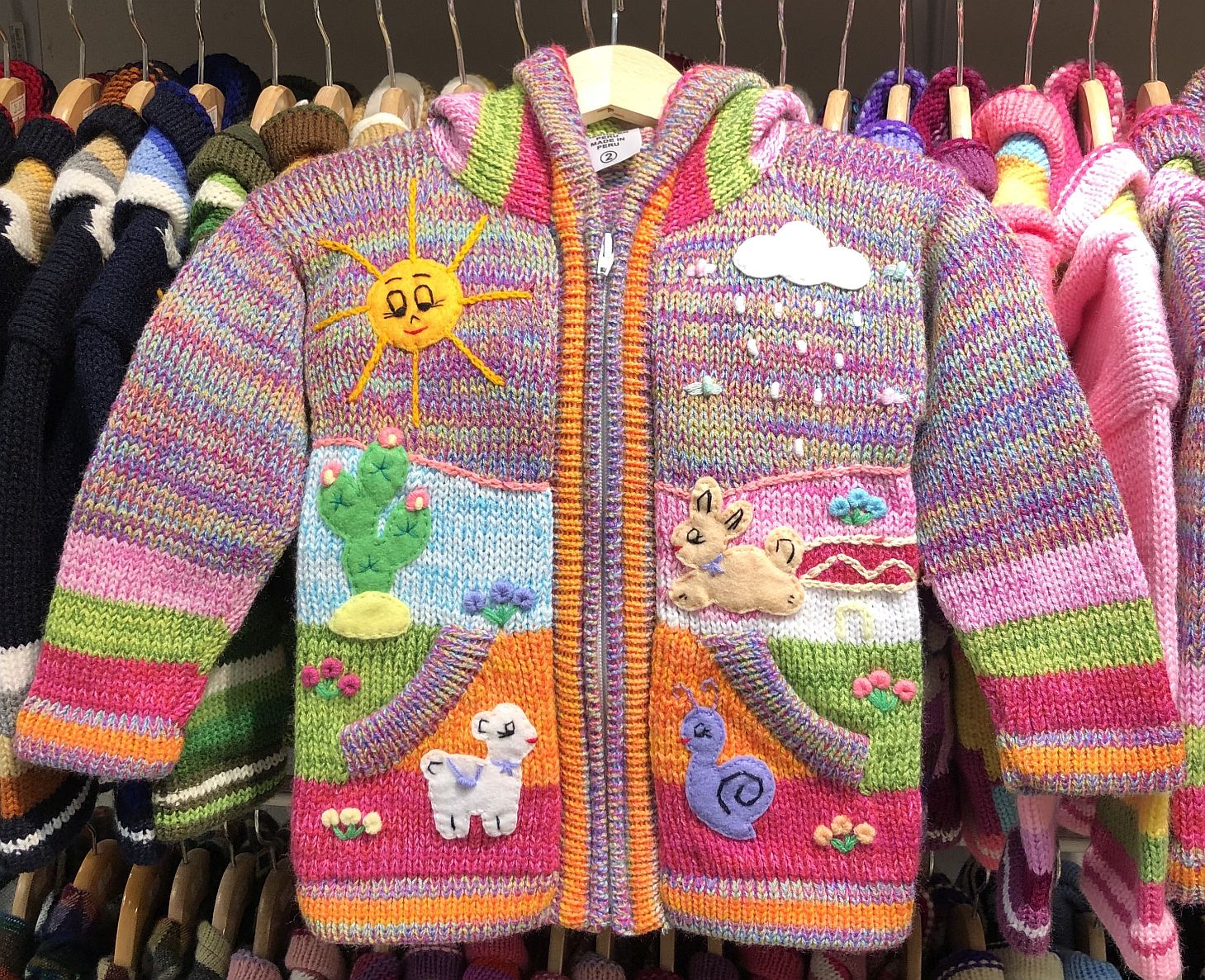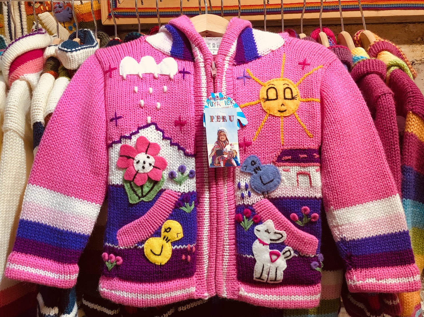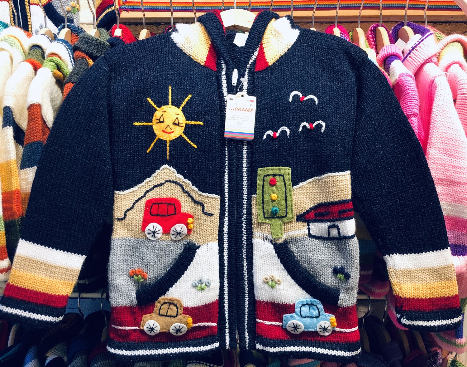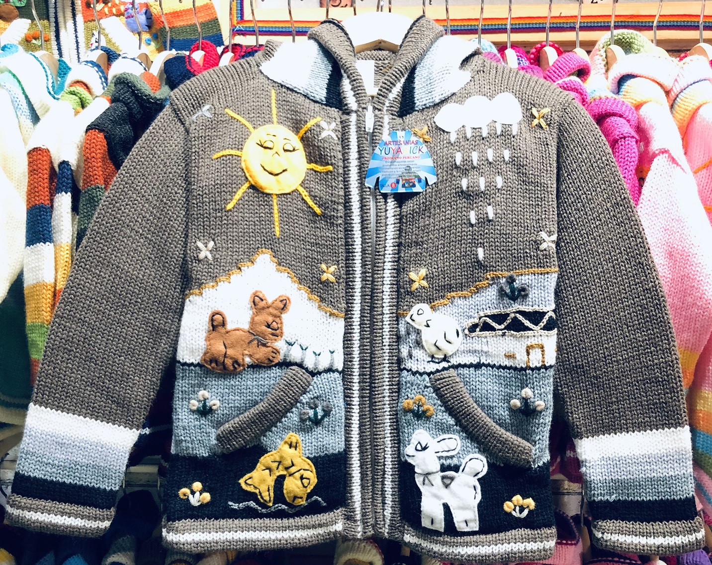 Peruvian children's winter hat with scenes from the Peruvian countryside both front and back. Every detail is hand embroidered and finished to create a 3-D effect. Suitable for children from 0 to 3 years.