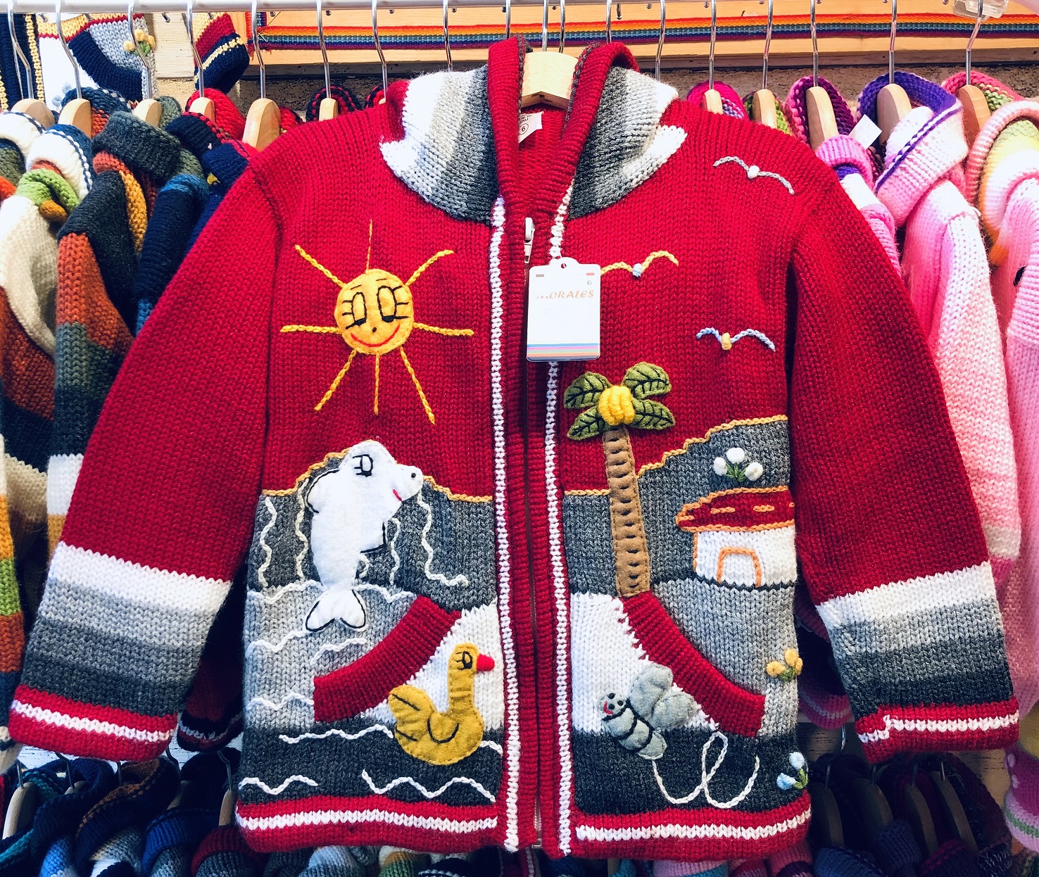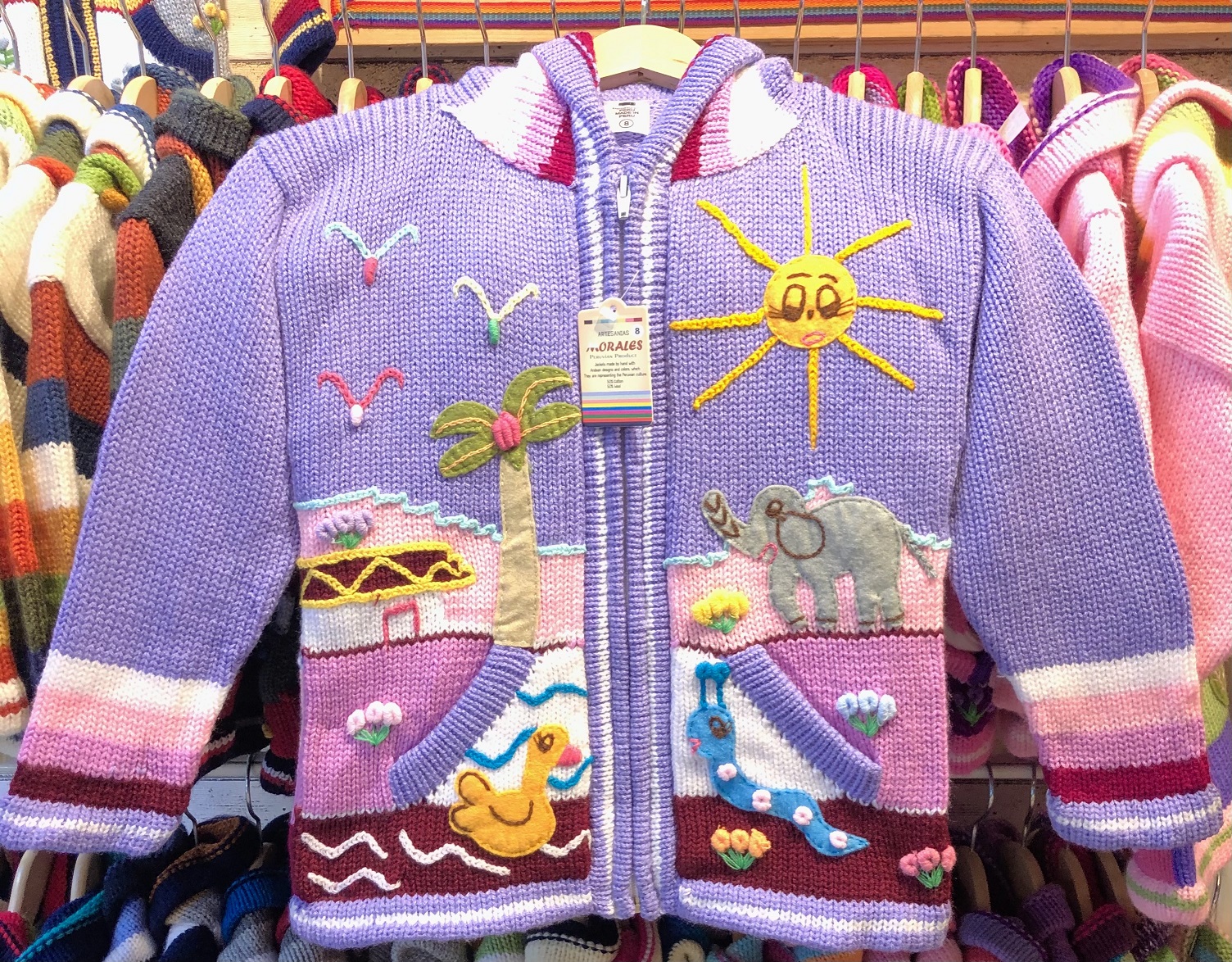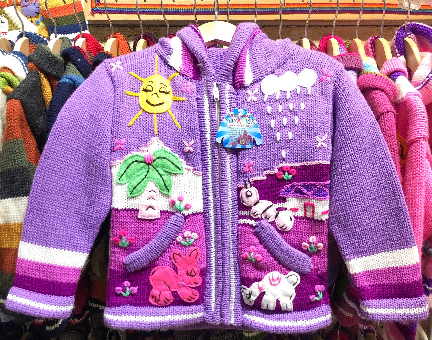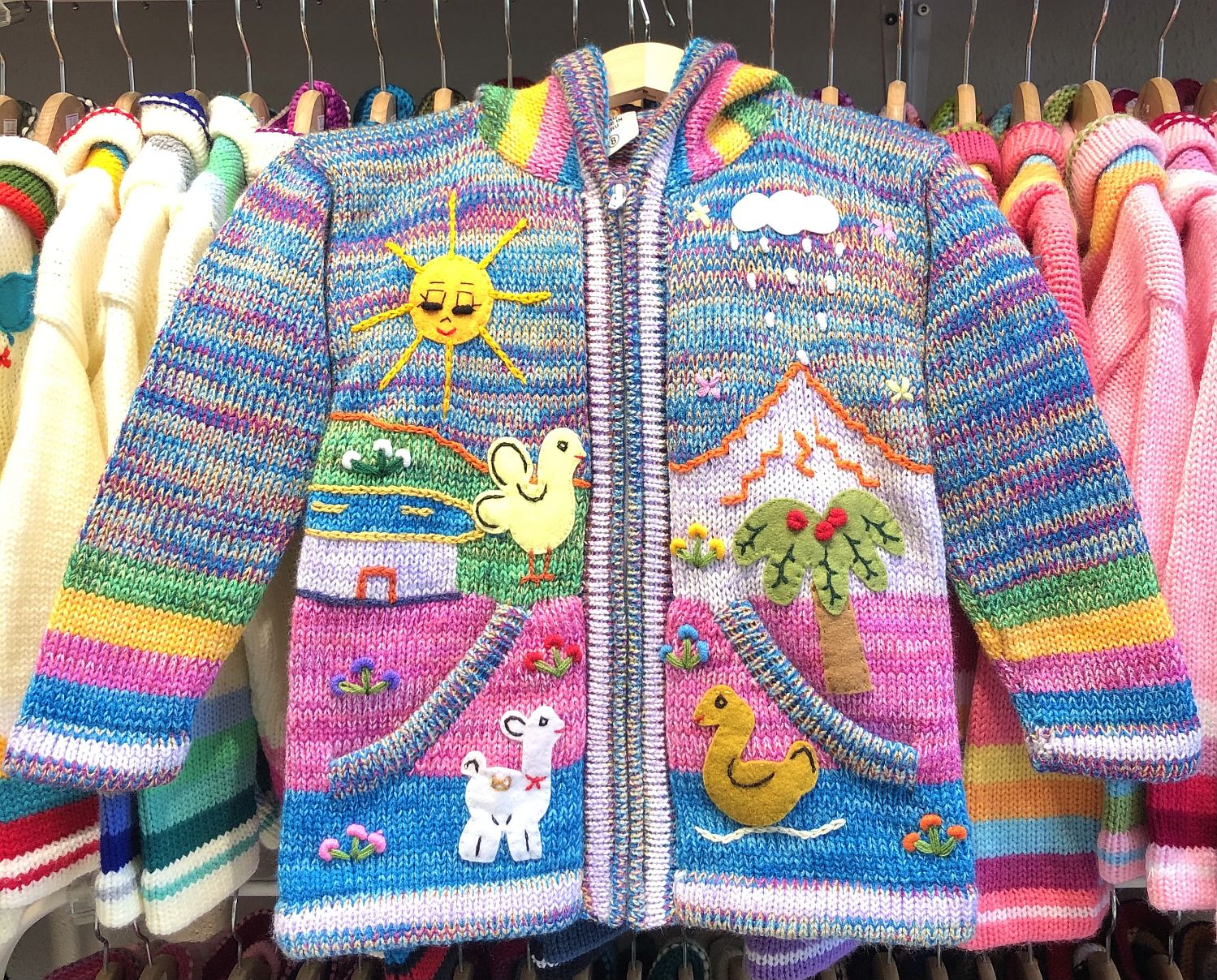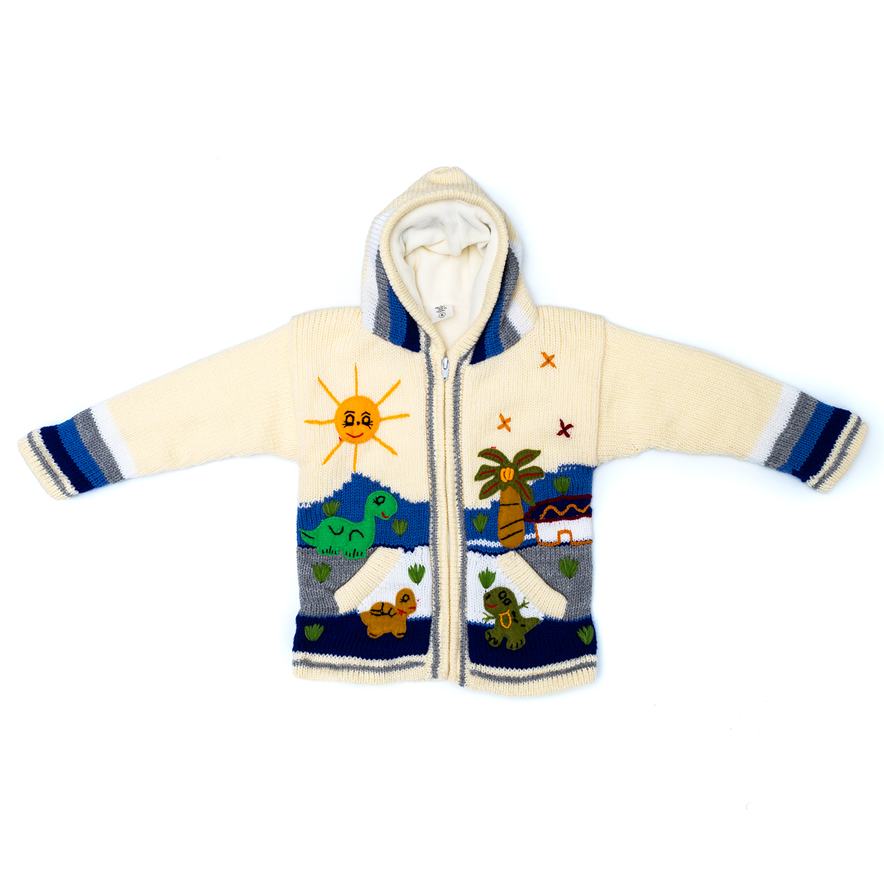 Peruvian children's winter hat with scenes from the Peruvian countryside both front and back. Every detail is hand embroidered and finished to create a 3-D effect. Suitable for children from 0 to 3 years.
