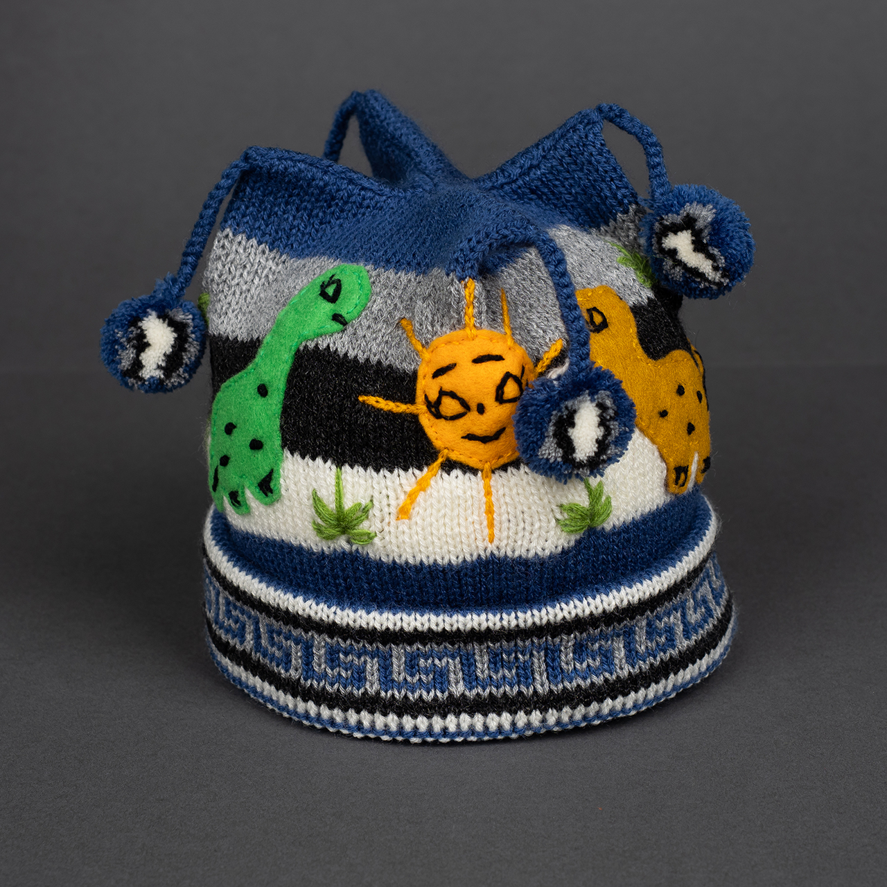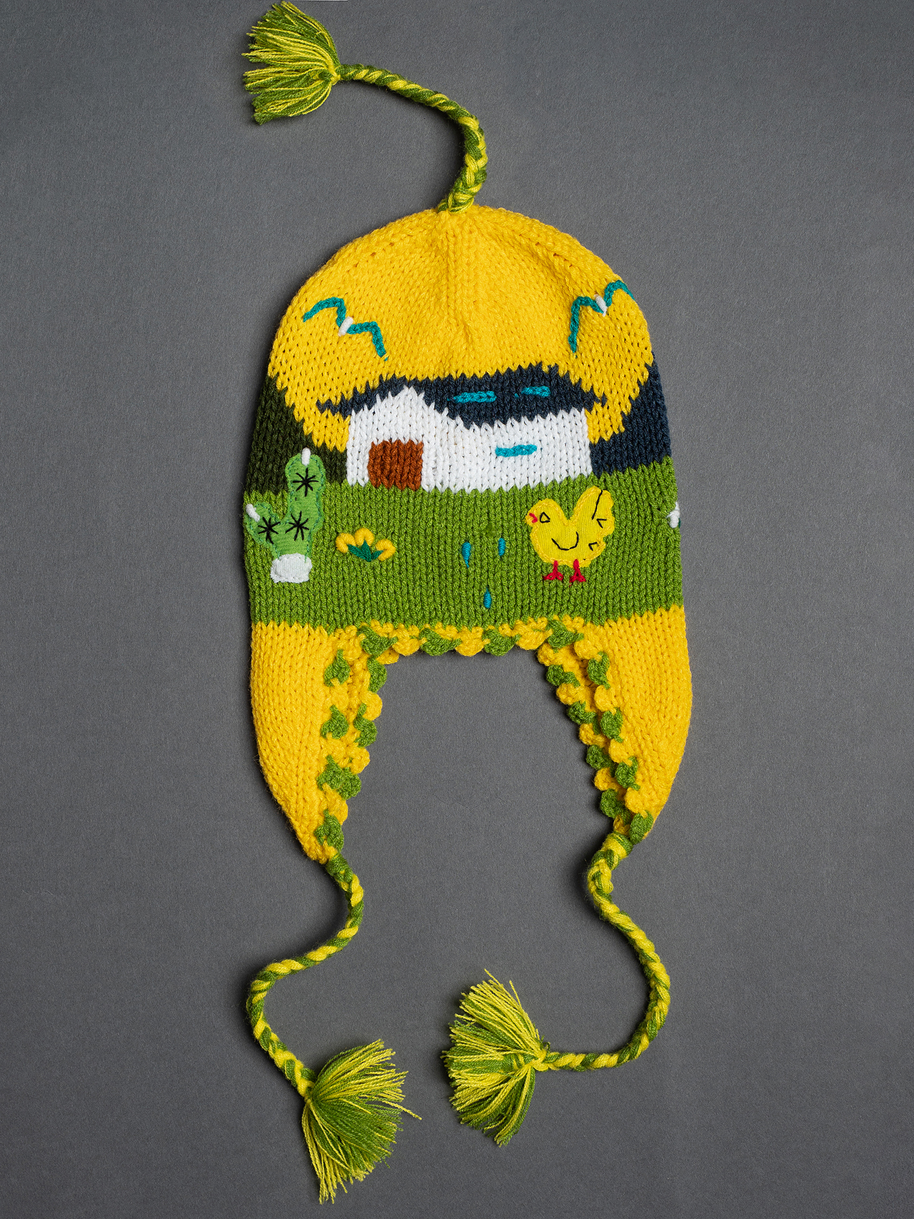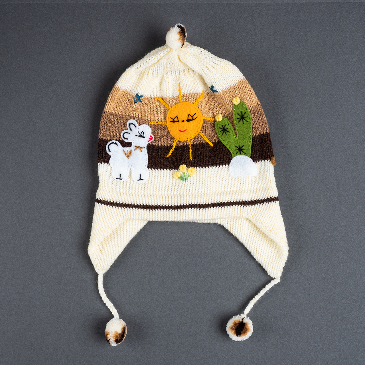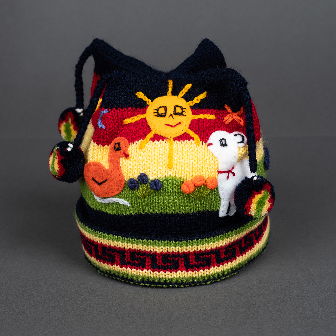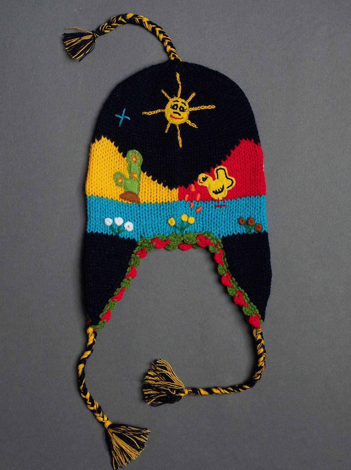 Peruvian children's winter hat with scenes from the Peruvian countryside both front and back. Every detail is hand embroidered and finished to create a 3-D effect. Suitable for children from 0 to 3 years.