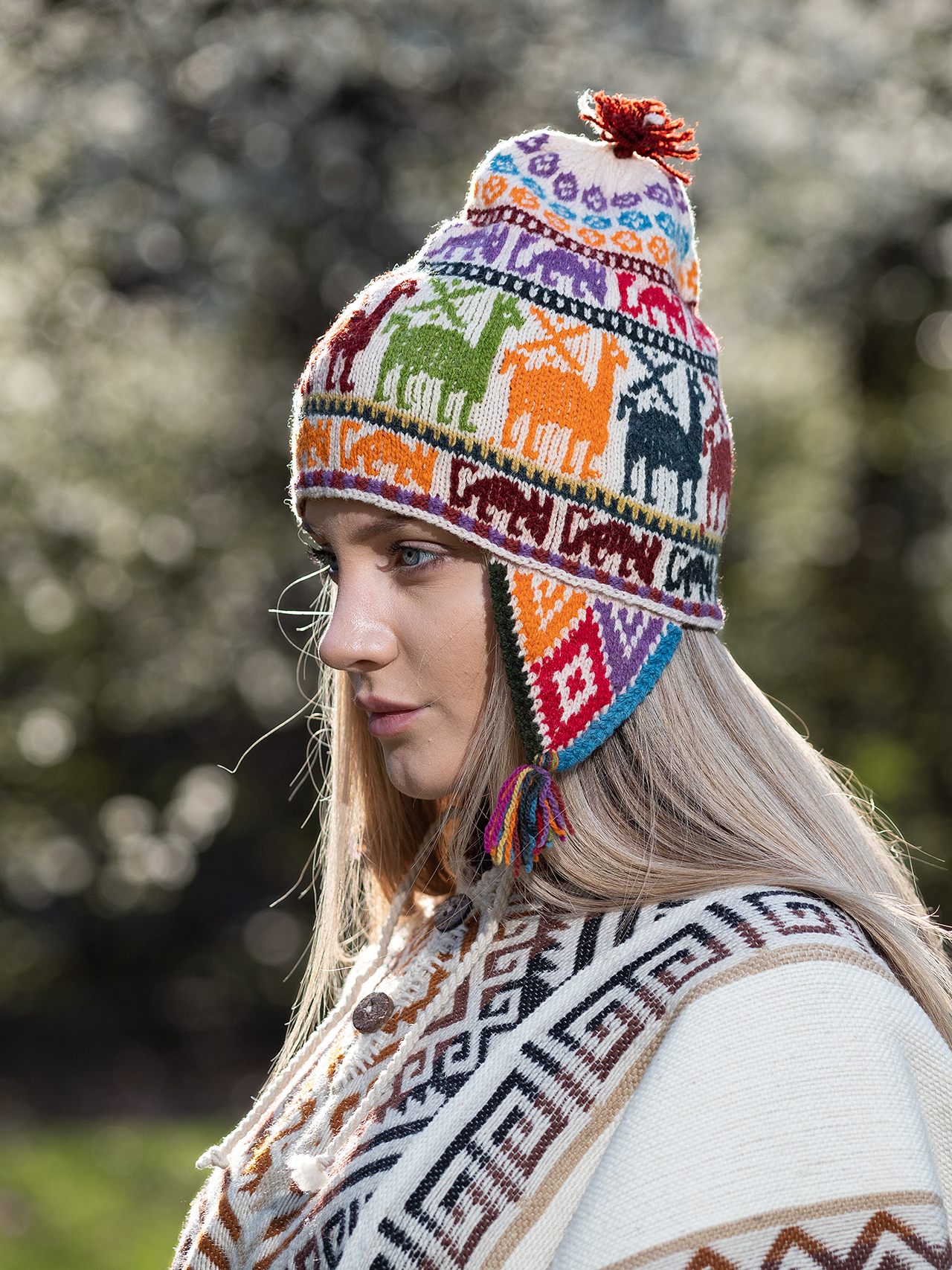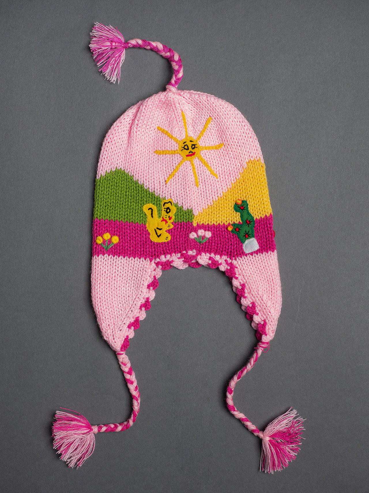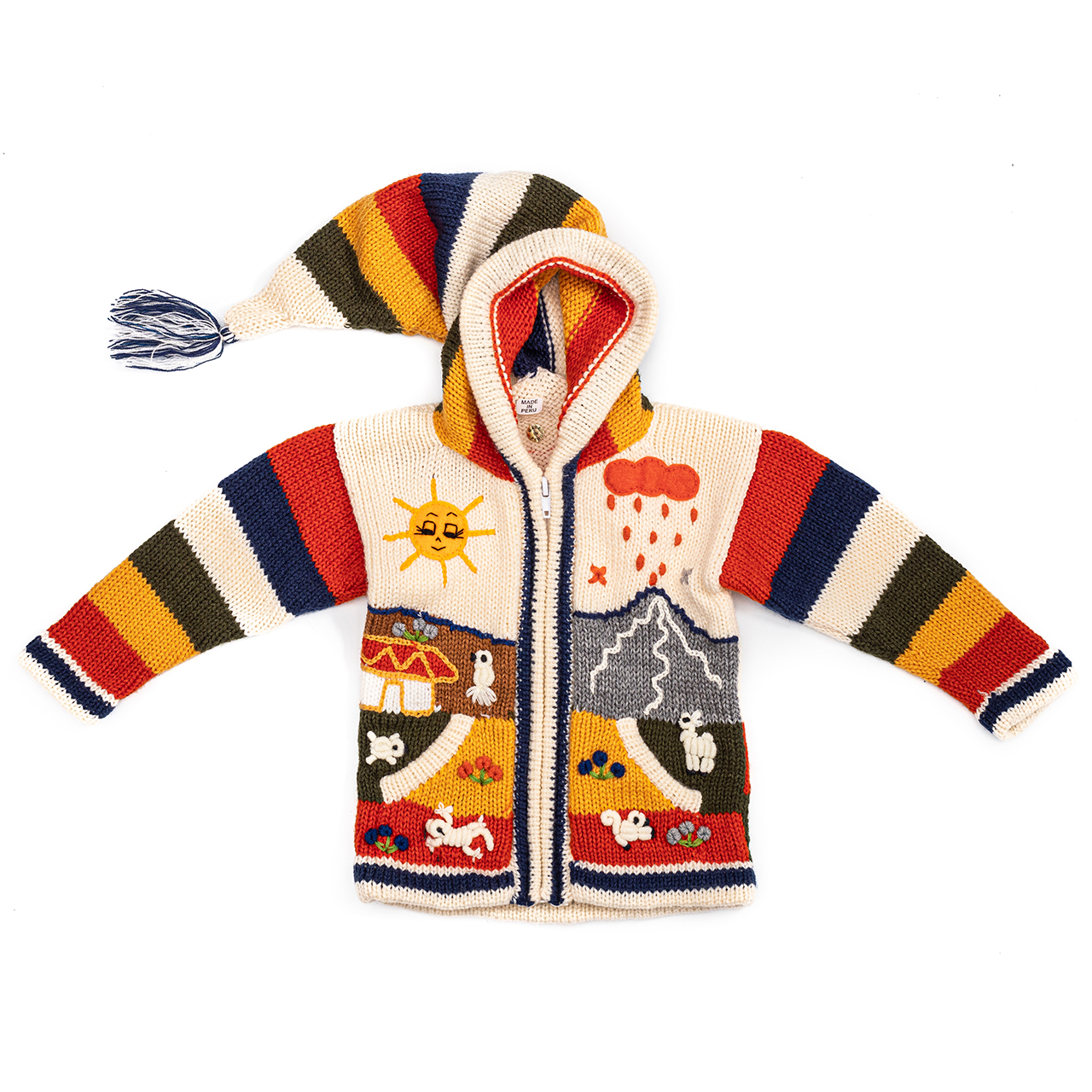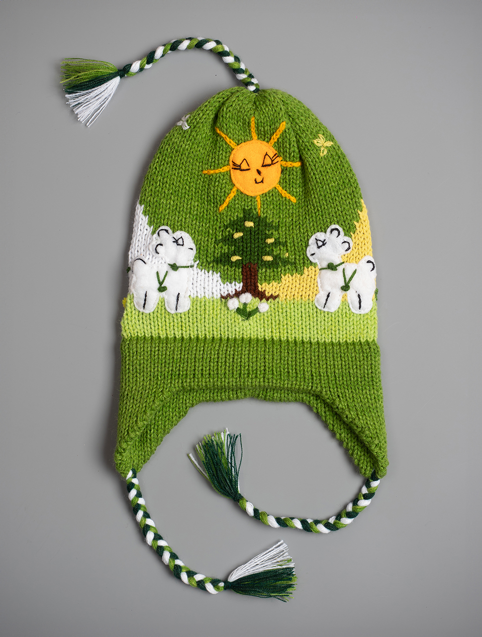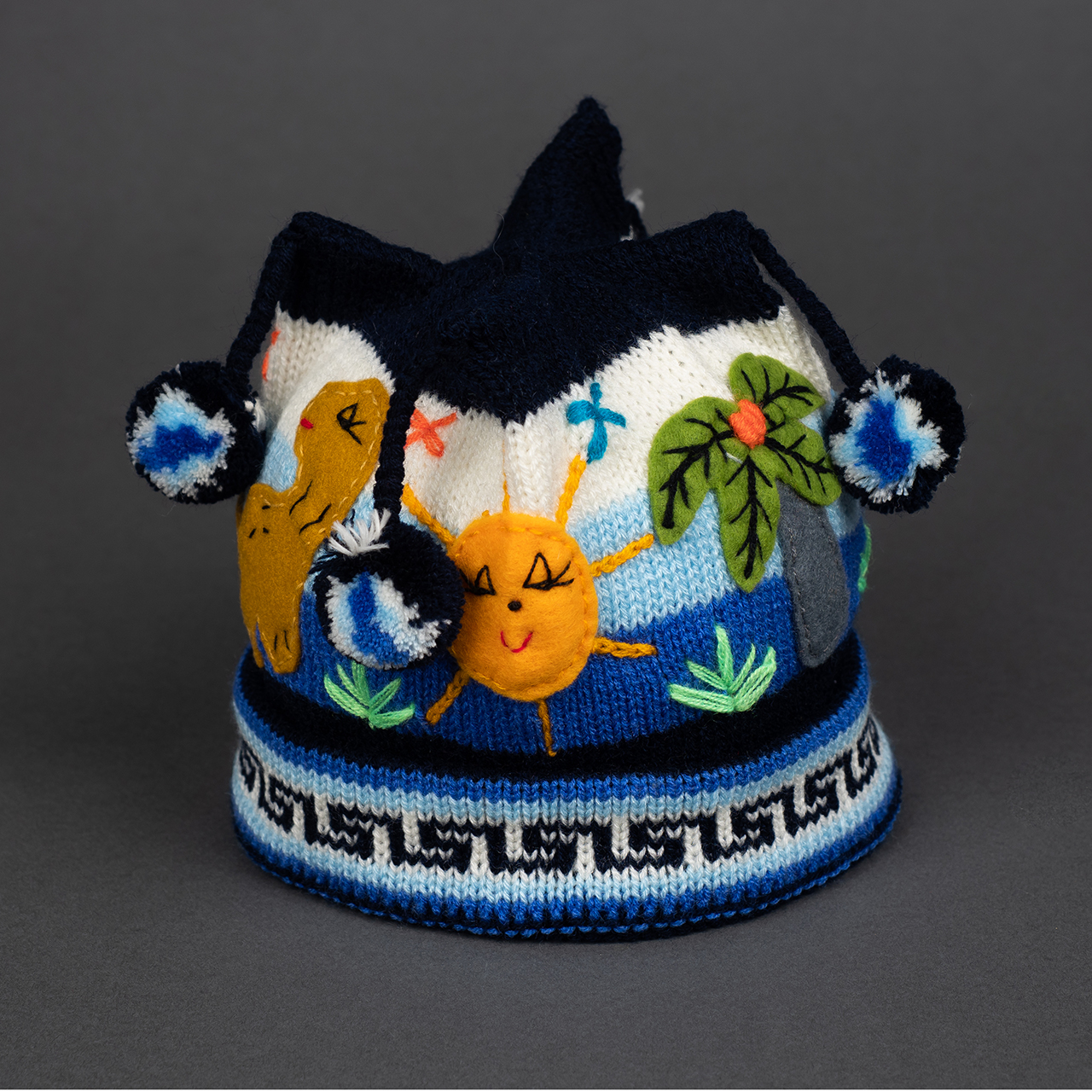 Peruvian children's winter hat with scenes from the Peruvian countryside both front and back. Every detail is hand embroidered and finished to create a 3-D effect. Suitable for children from 0 to 3 years.