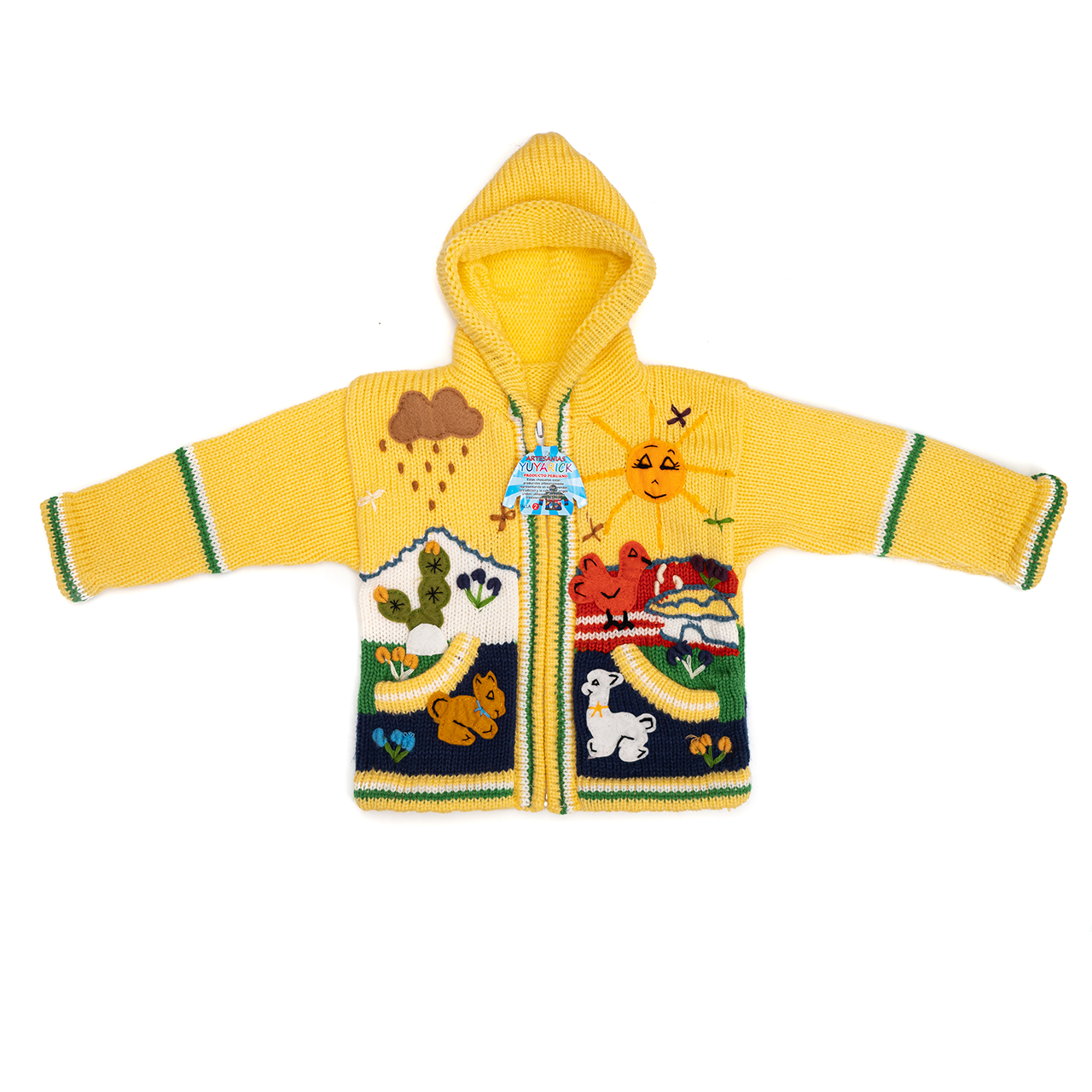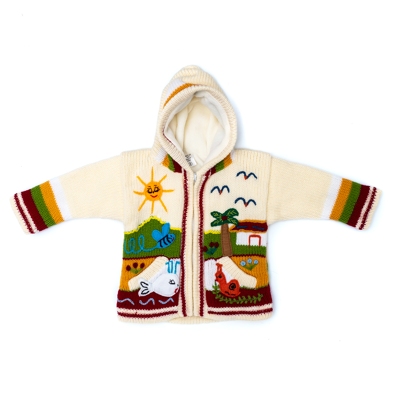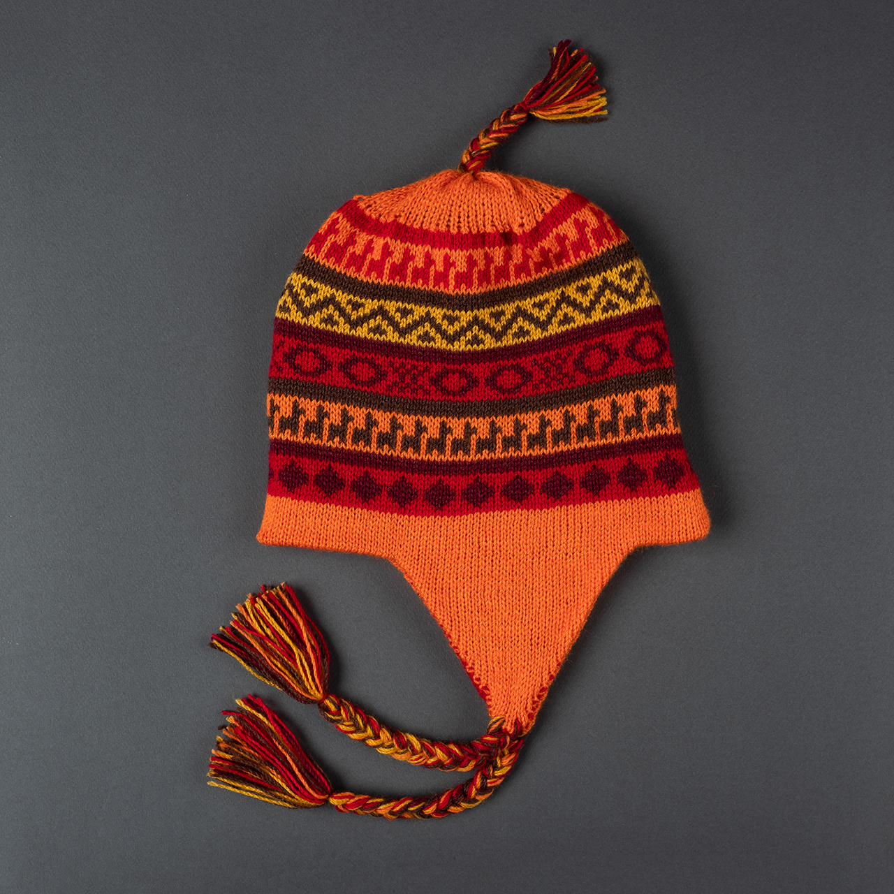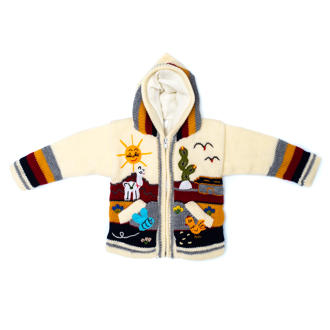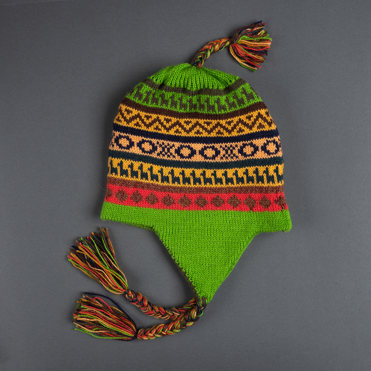 Peruvian children's winter hat with scenes from the Peruvian countryside both front and back. Every detail is hand embroidered and finished to create a 3-D effect. Suitable for children from 0 to 3 years.