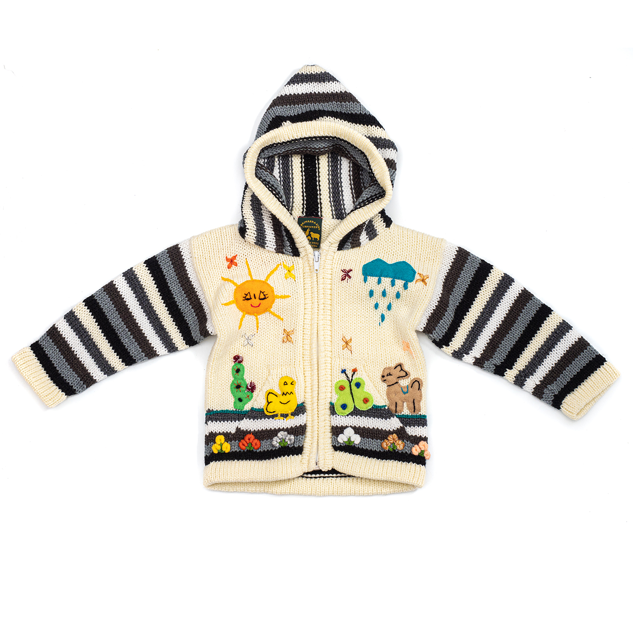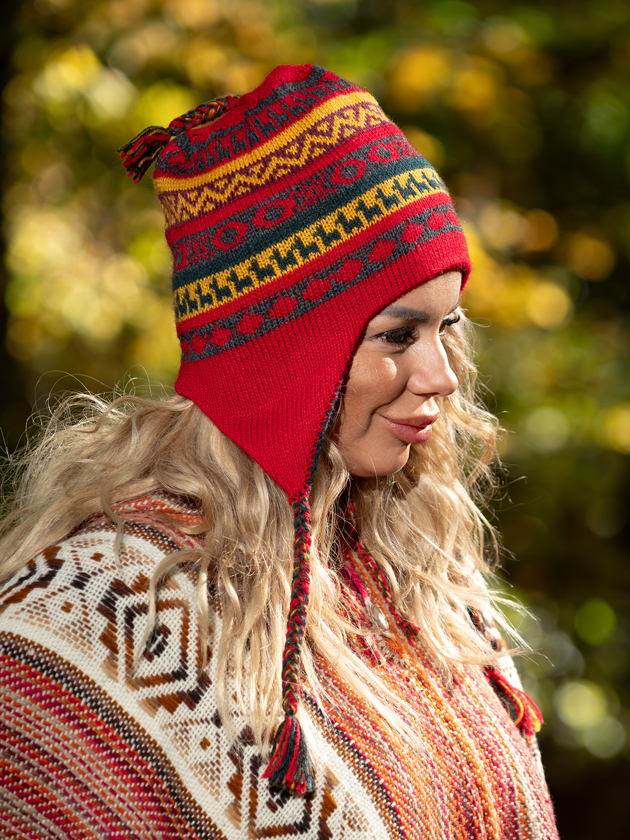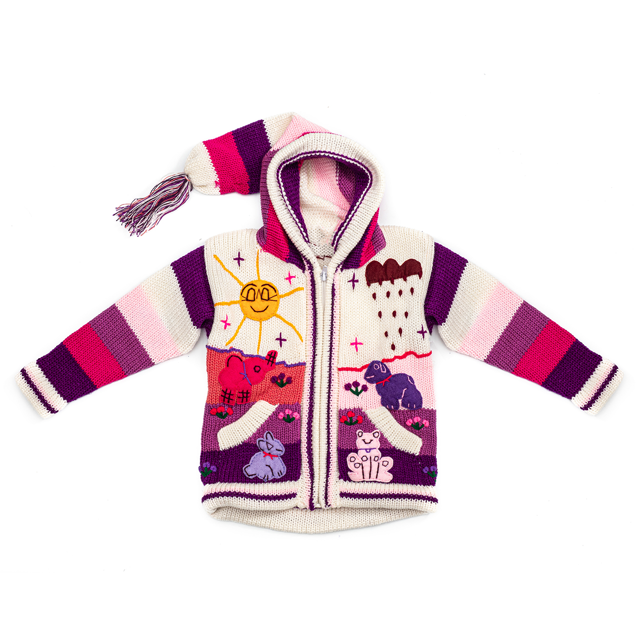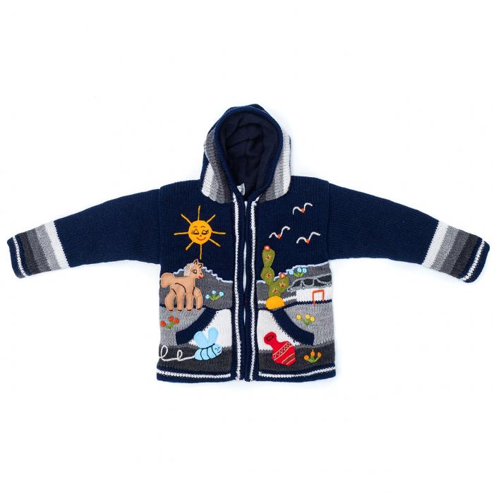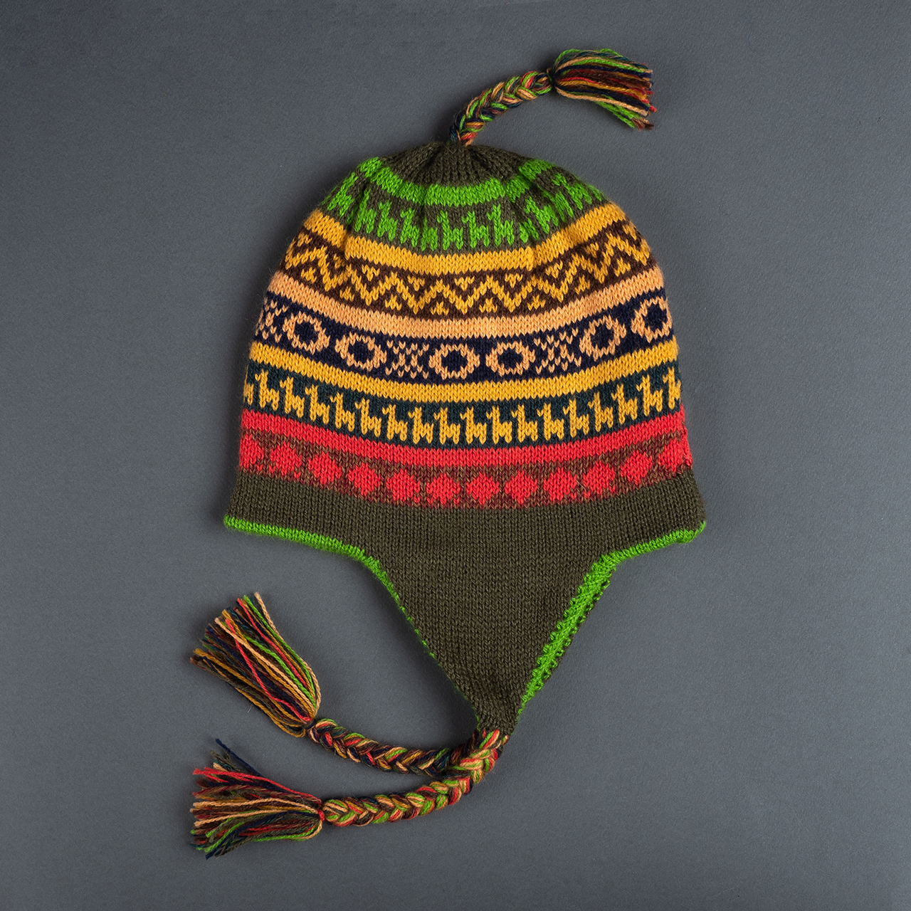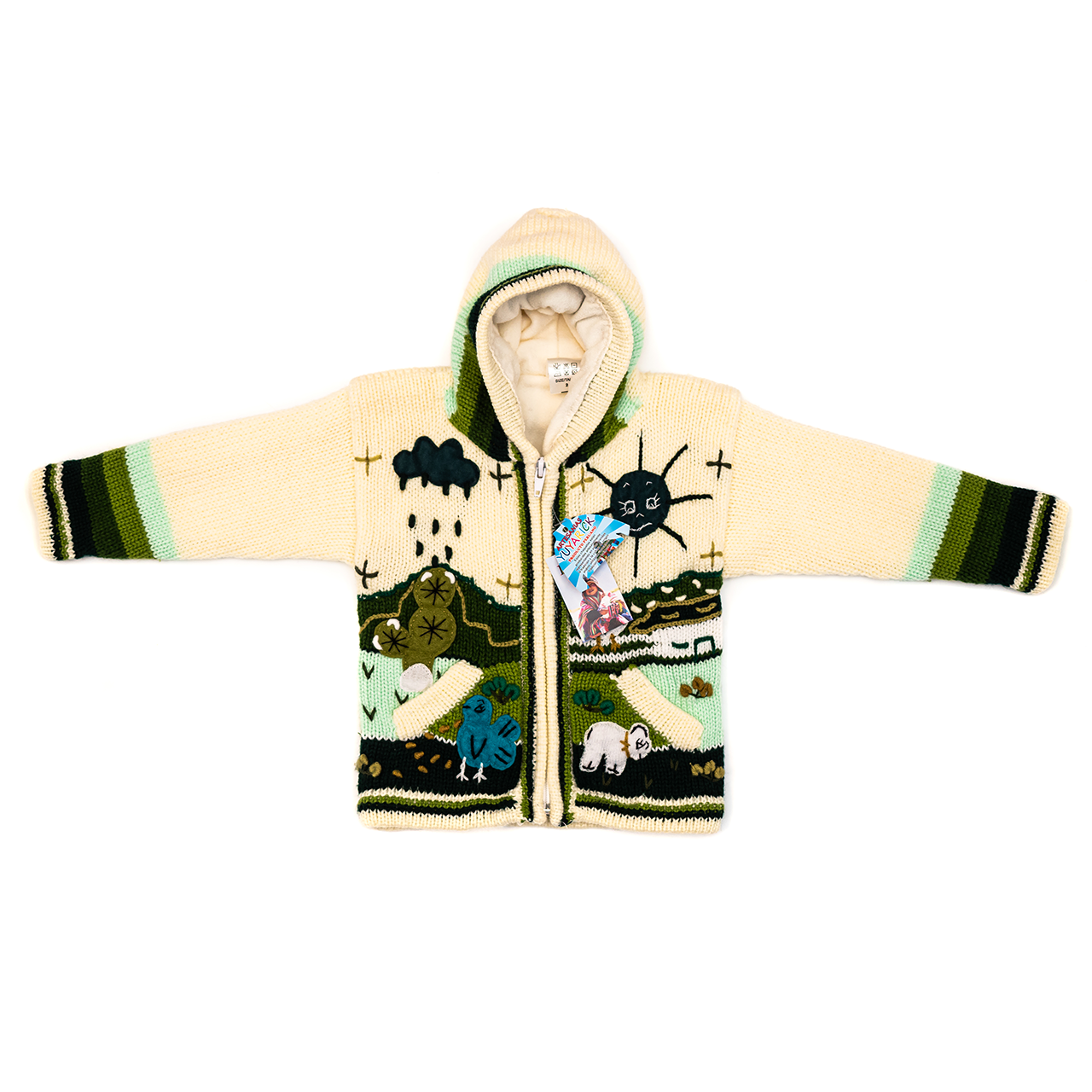 Peruvian children's winter hat with scenes from the Peruvian countryside both front and back. Every detail is hand embroidered and finished to create a 3-D effect. Suitable for children from 0 to 3 years.