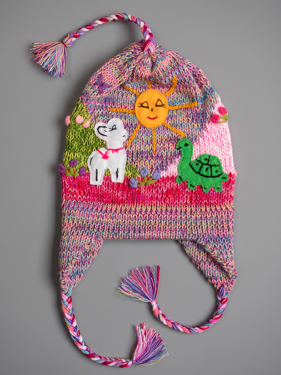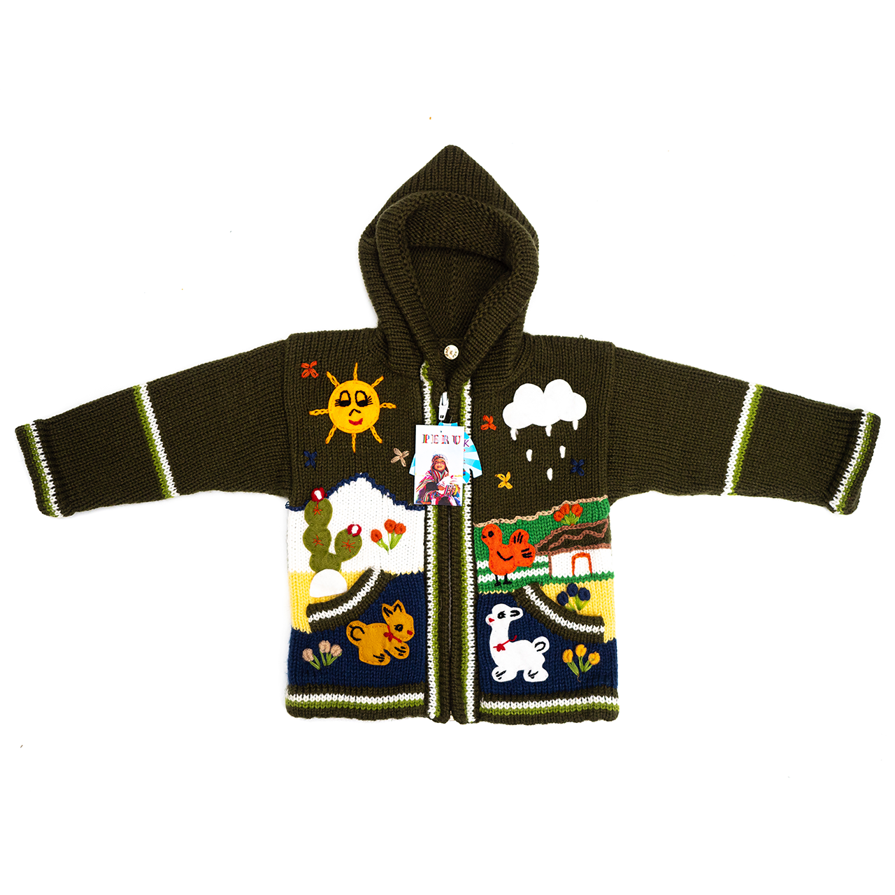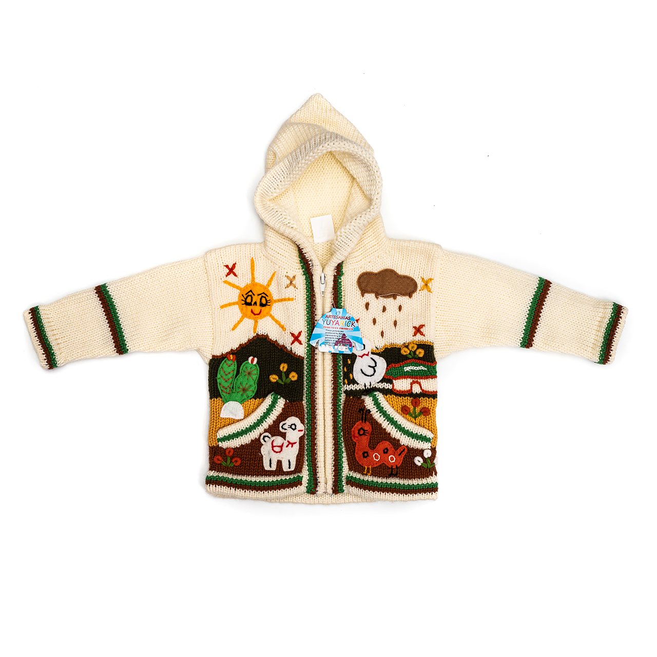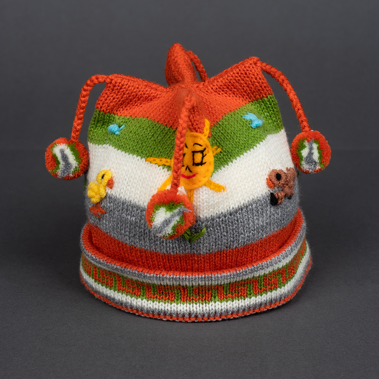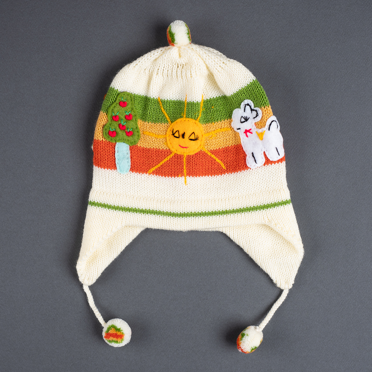 Peruvian children's winter hat with scenes from the Peruvian countryside both front and back. Every detail is hand embroidered and finished to create a 3-D effect. Suitable for children from 0 to 3 years.