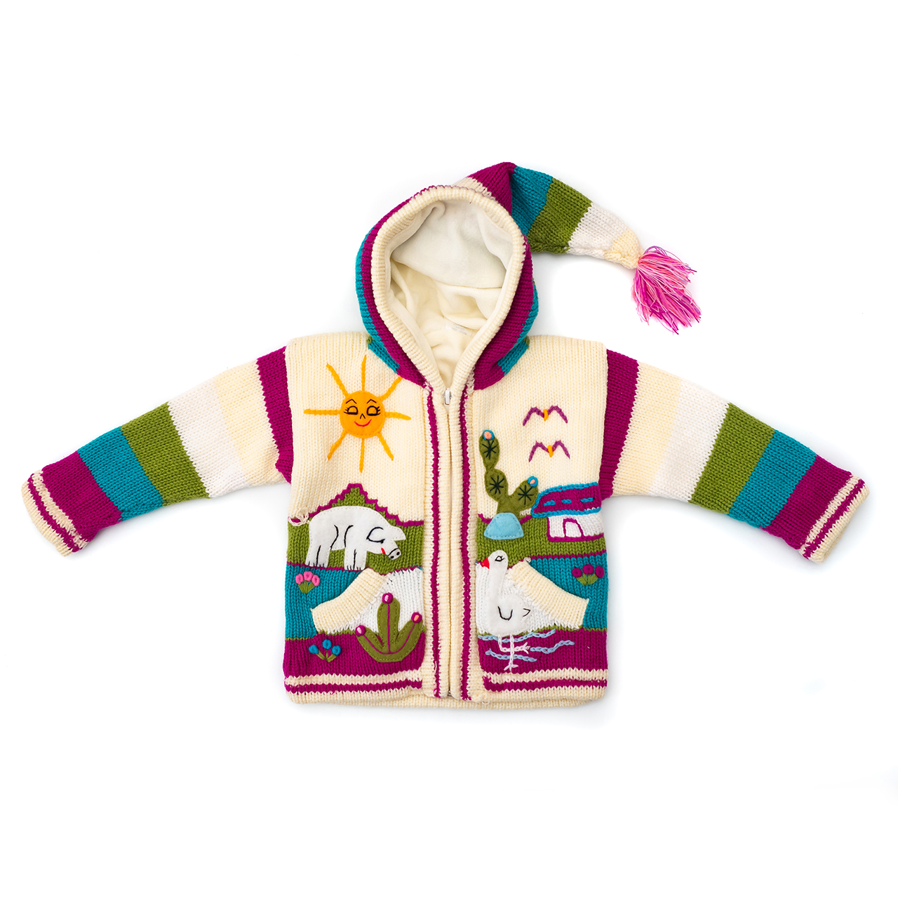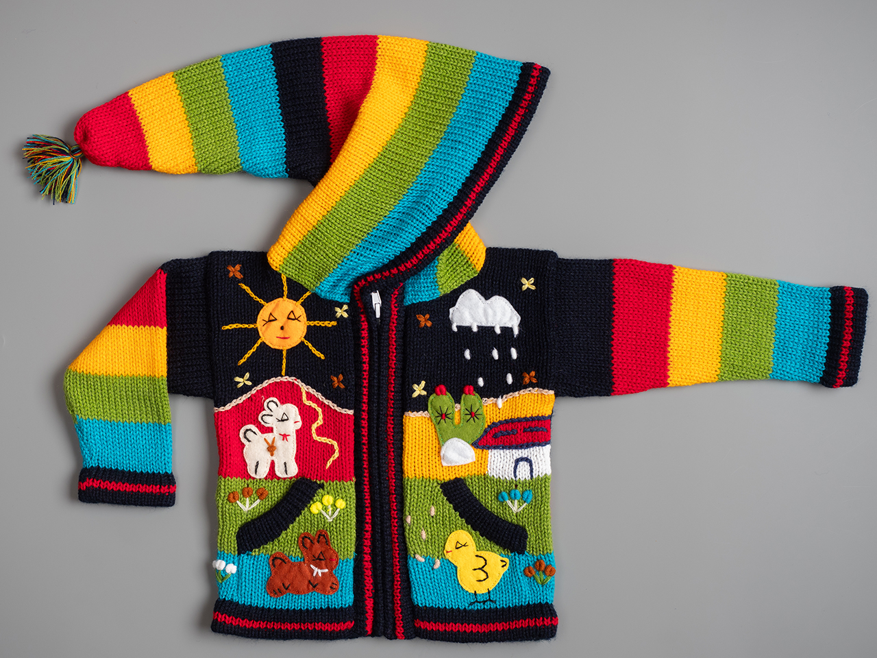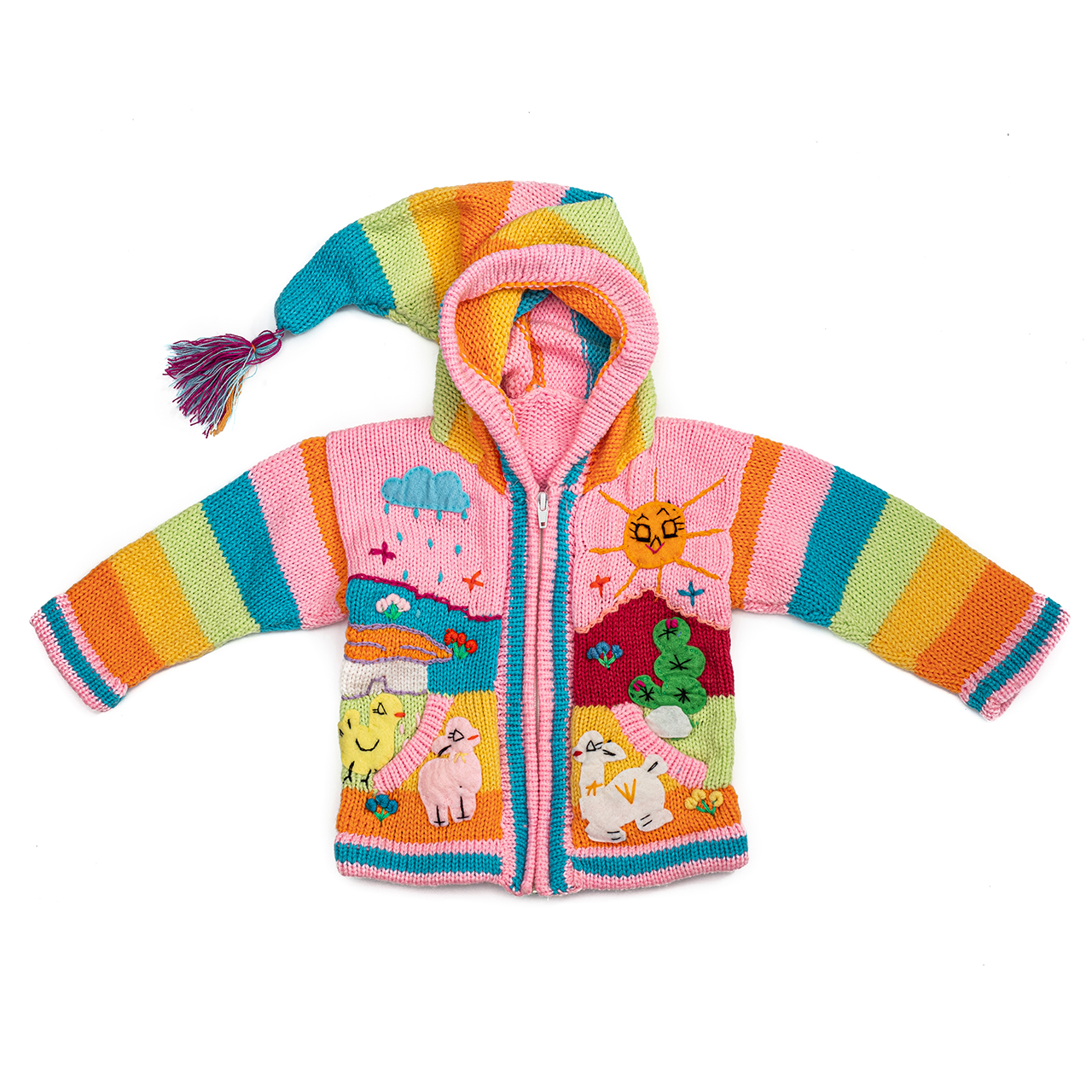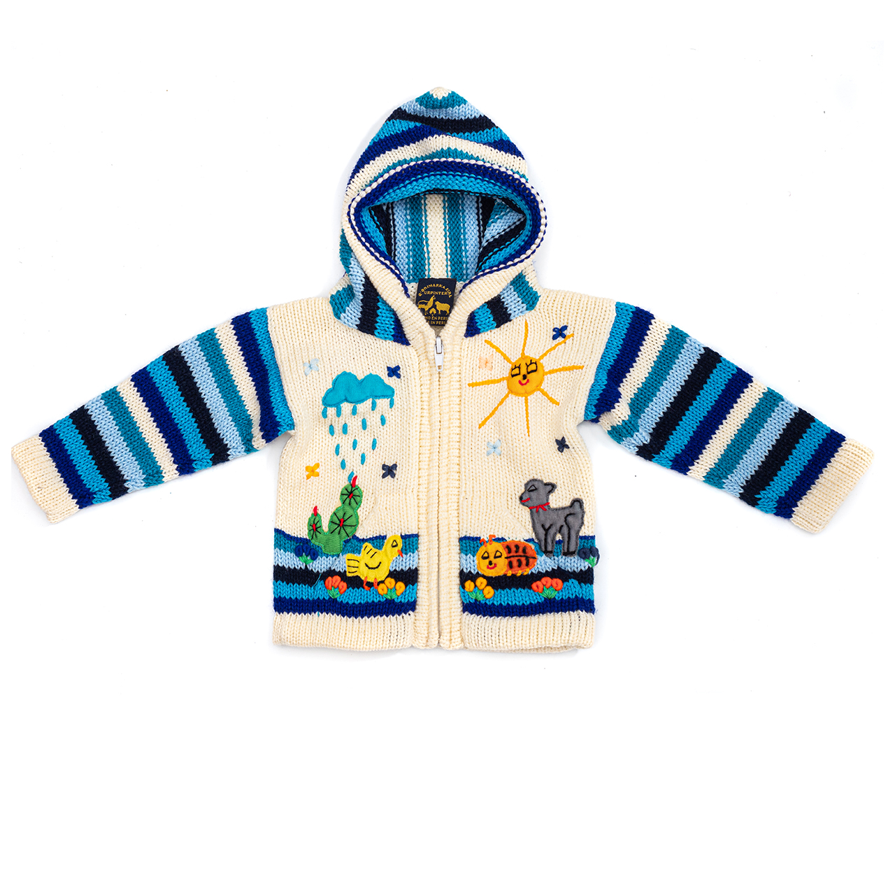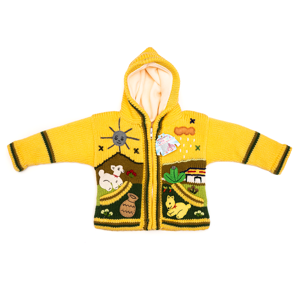 Peruvian children's winter hat with scenes from the Peruvian countryside both front and back. Every detail is hand embroidered and finished to create a 3-D effect. Suitable for children from 0 to 3 years.