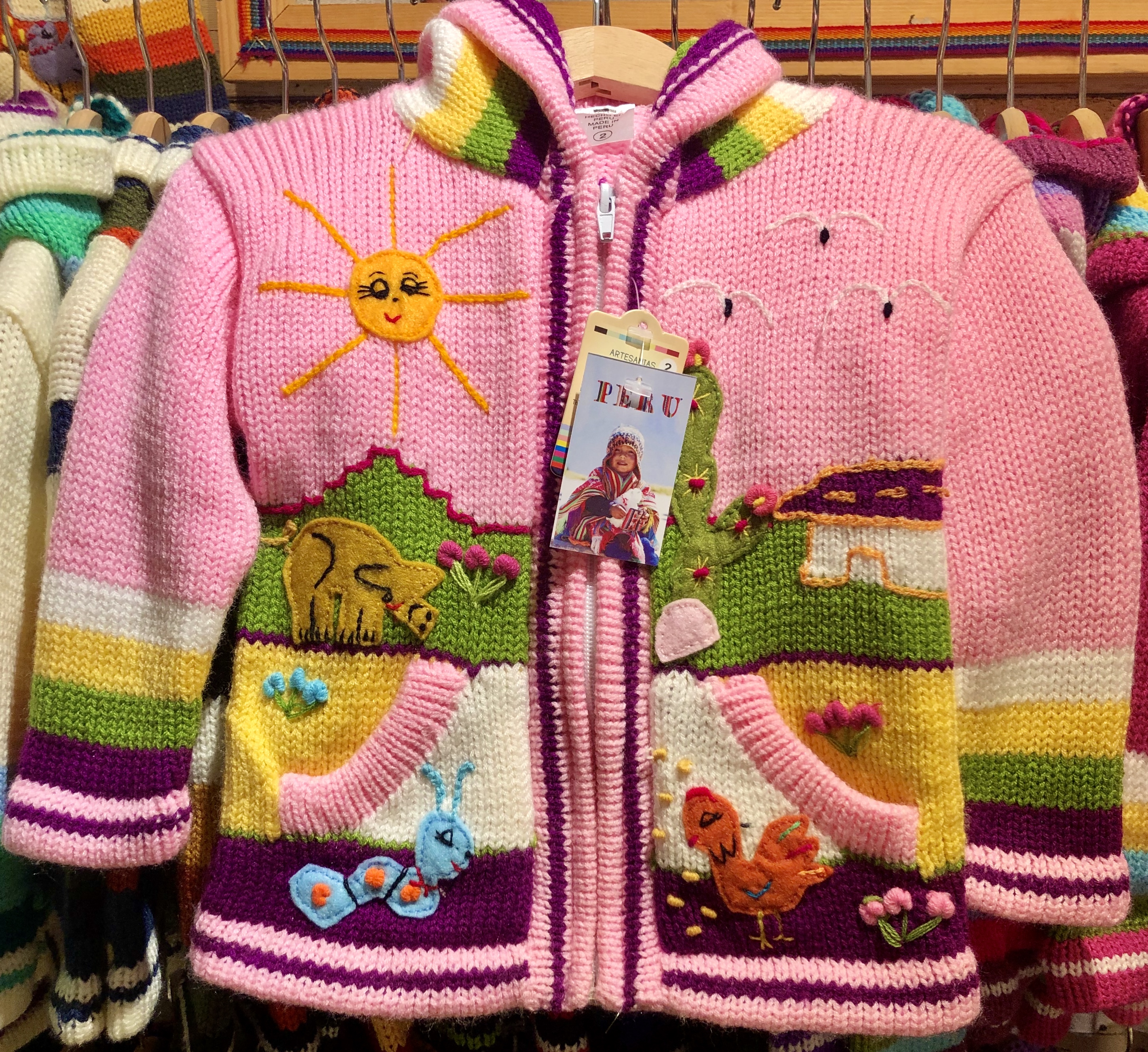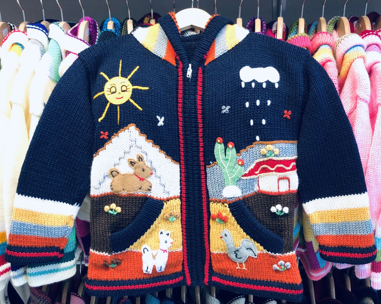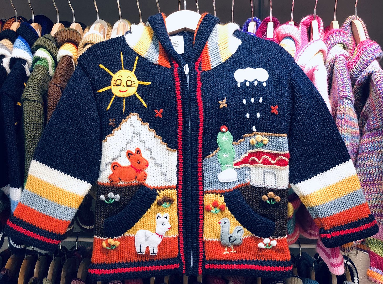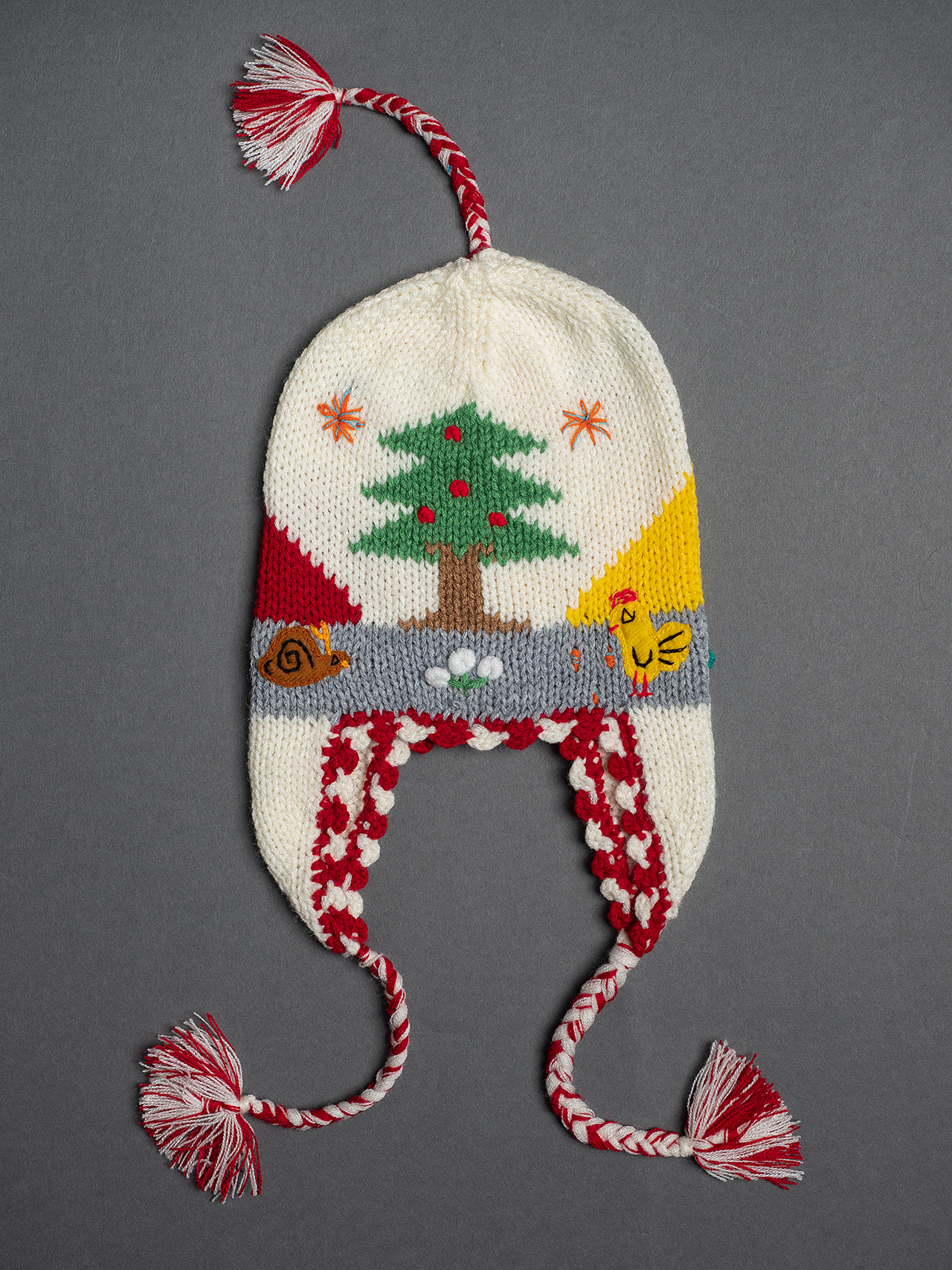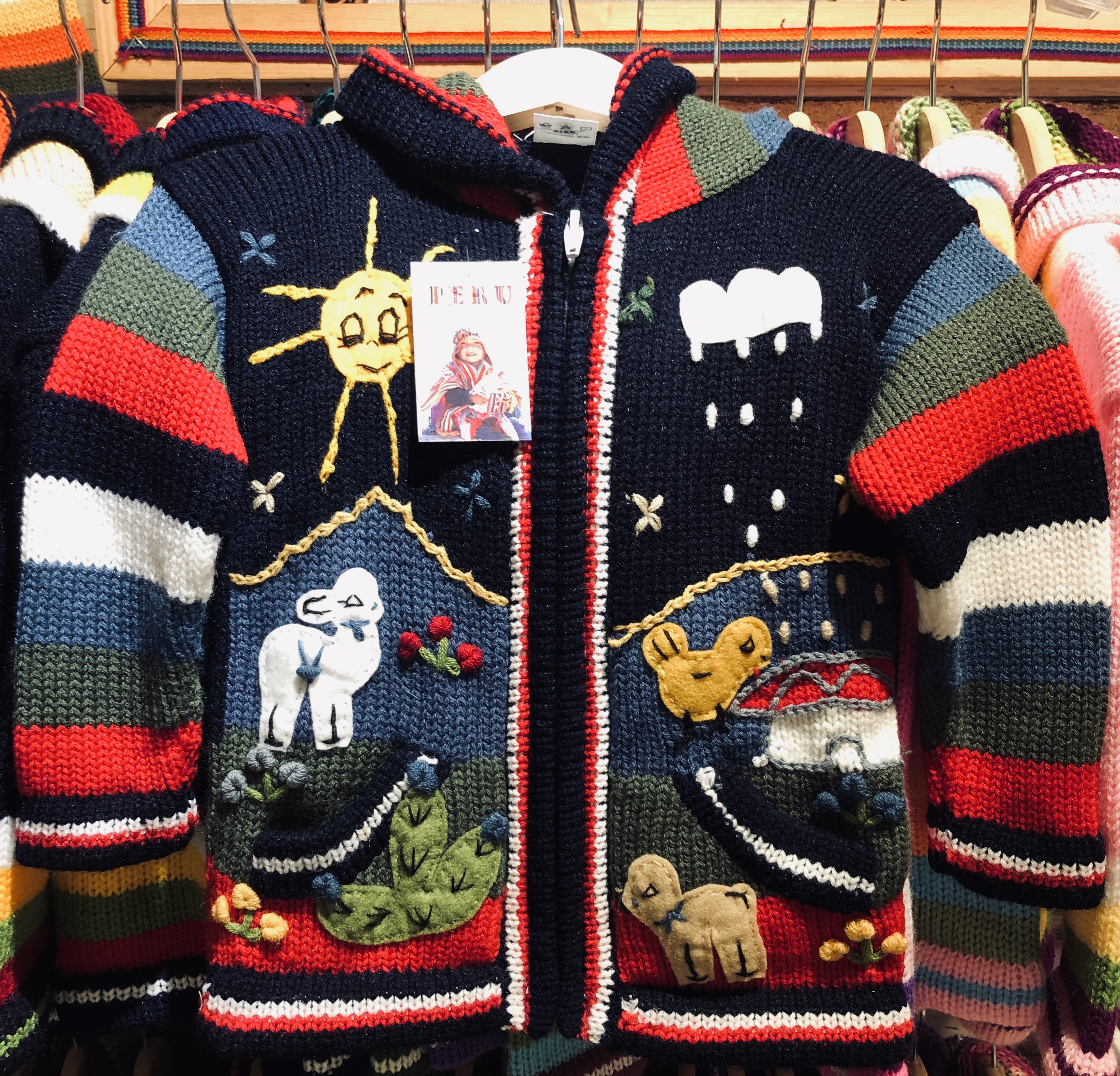Peruvian children's winter hat with scenes from the Peruvian countryside both front and back. Every detail is hand embroidered and finished to create a 3-D effect. Suitable for children from 0 to 3 years.