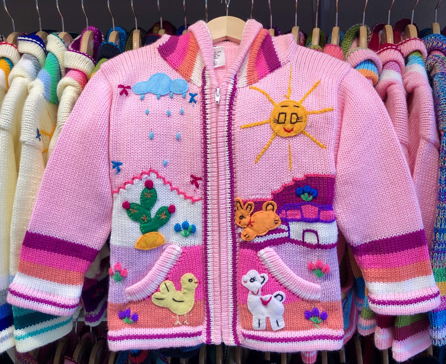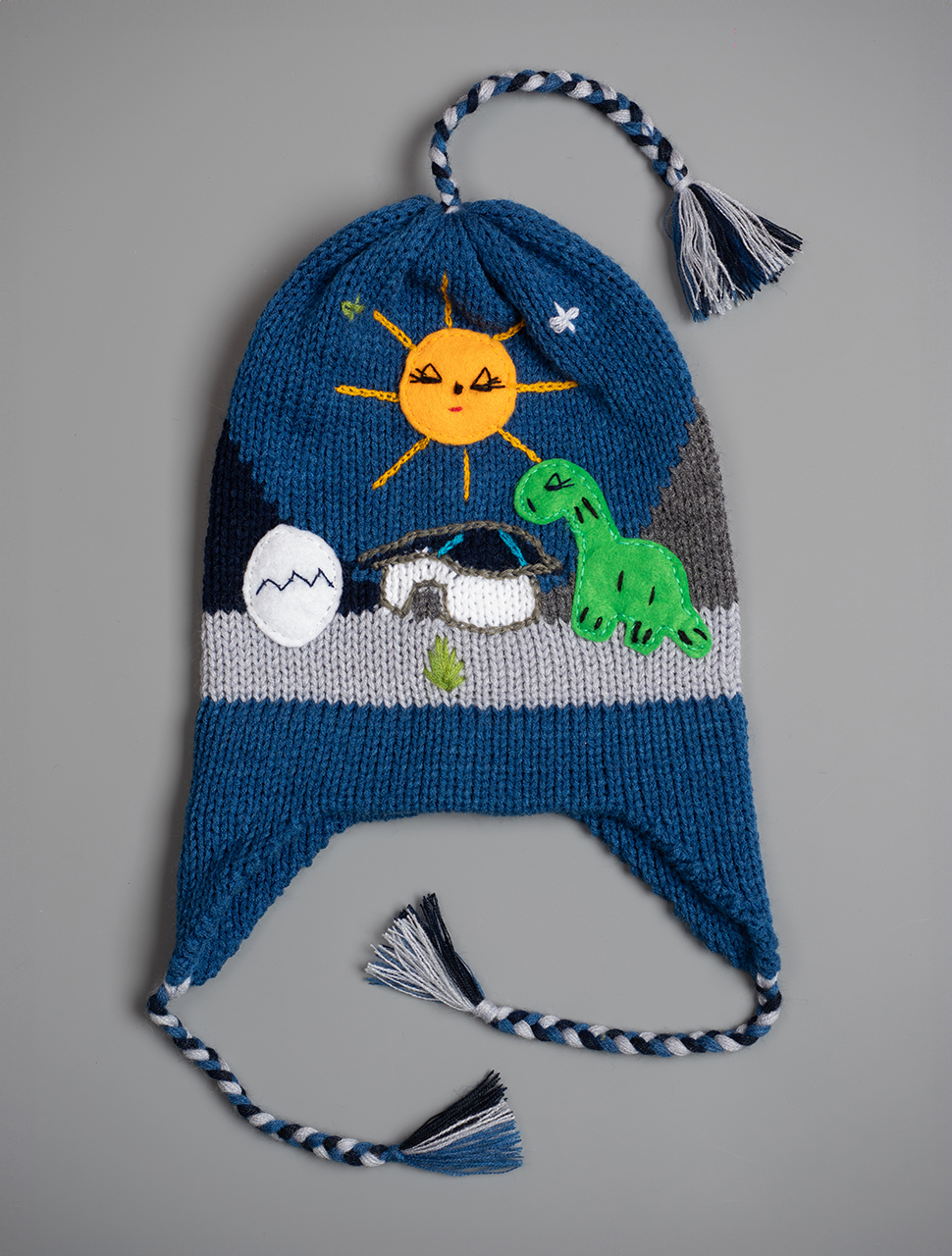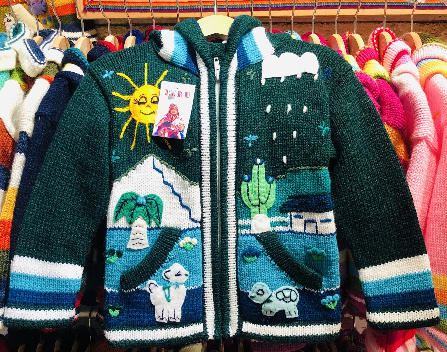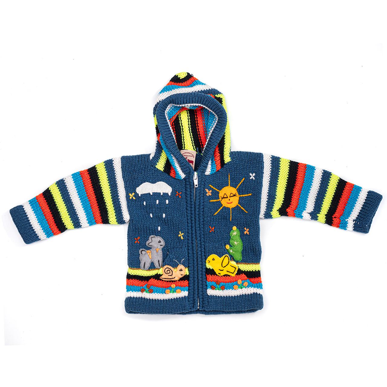 Peruvian children's winter hat with scenes from the Peruvian countryside both front and back. Every detail is hand embroidered and finished to create a 3-D effect. Suitable for children from 0 to 3 years.