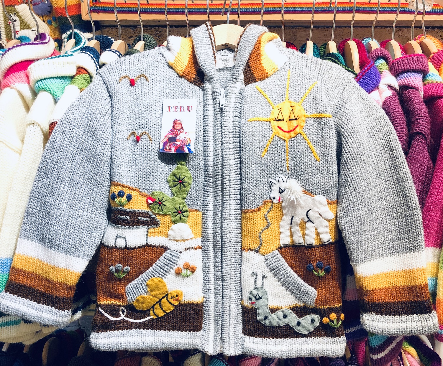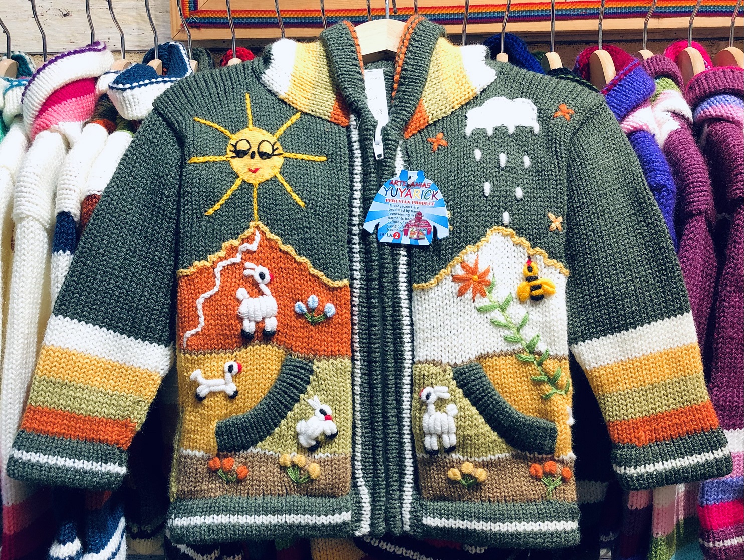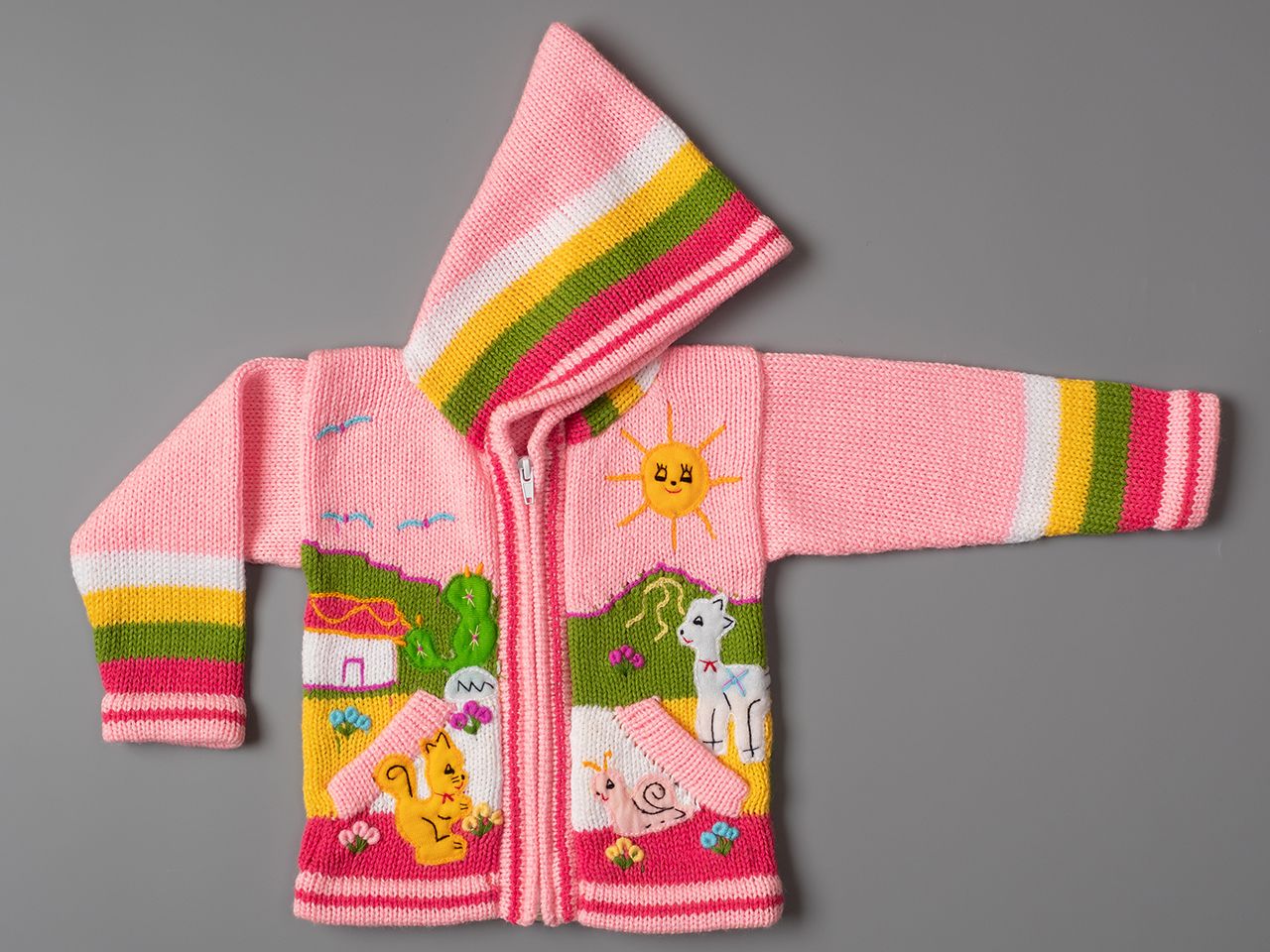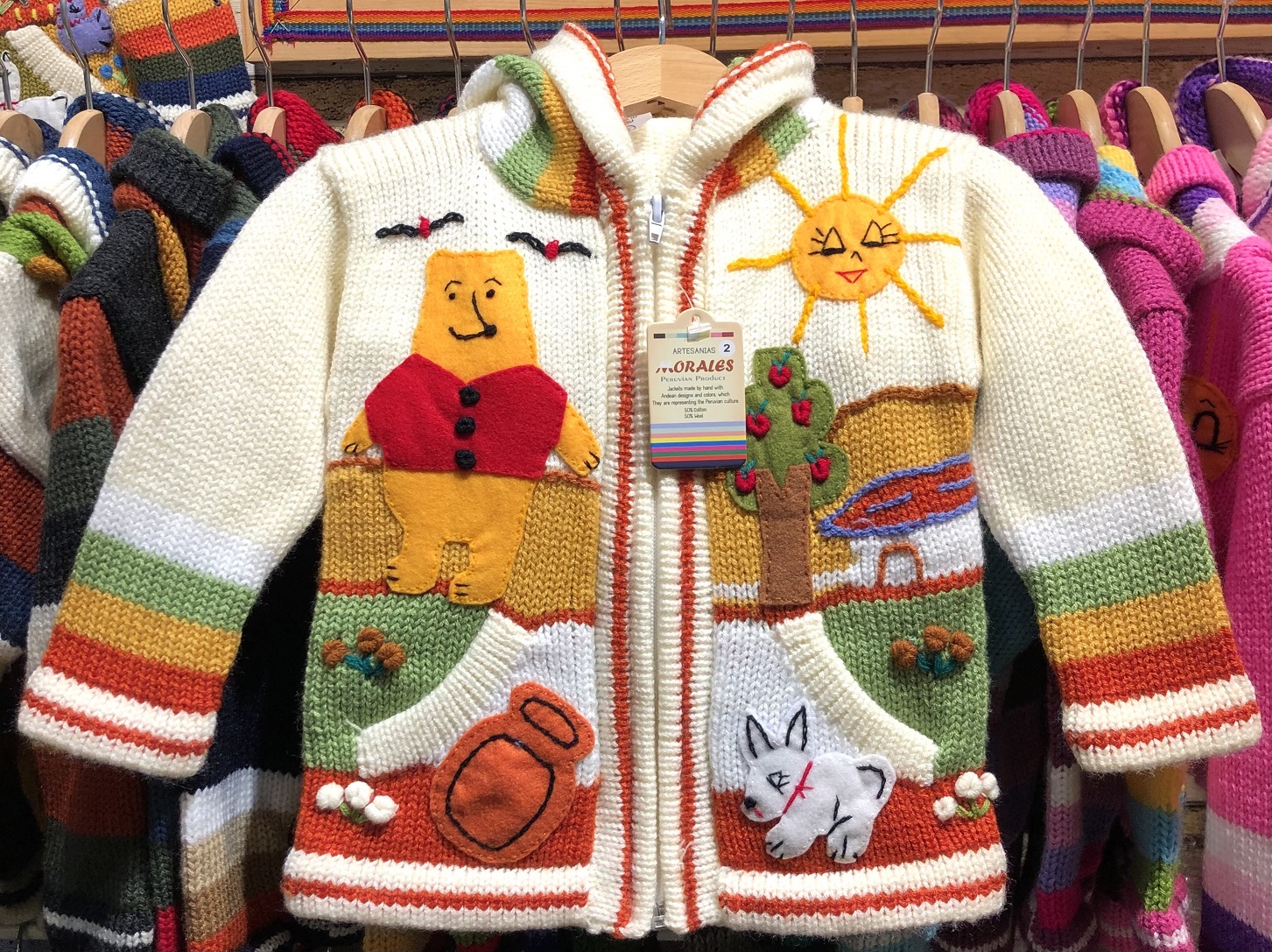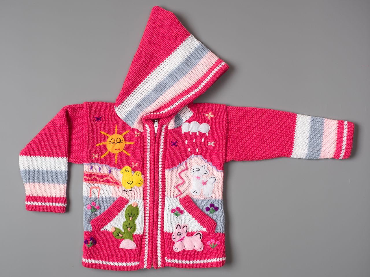 Peruvian children's winter hat with scenes from the Peruvian countryside both front and back. Every detail is hand embroidered and finished to create a 3-D effect. Suitable for children from 0 to 3 years.