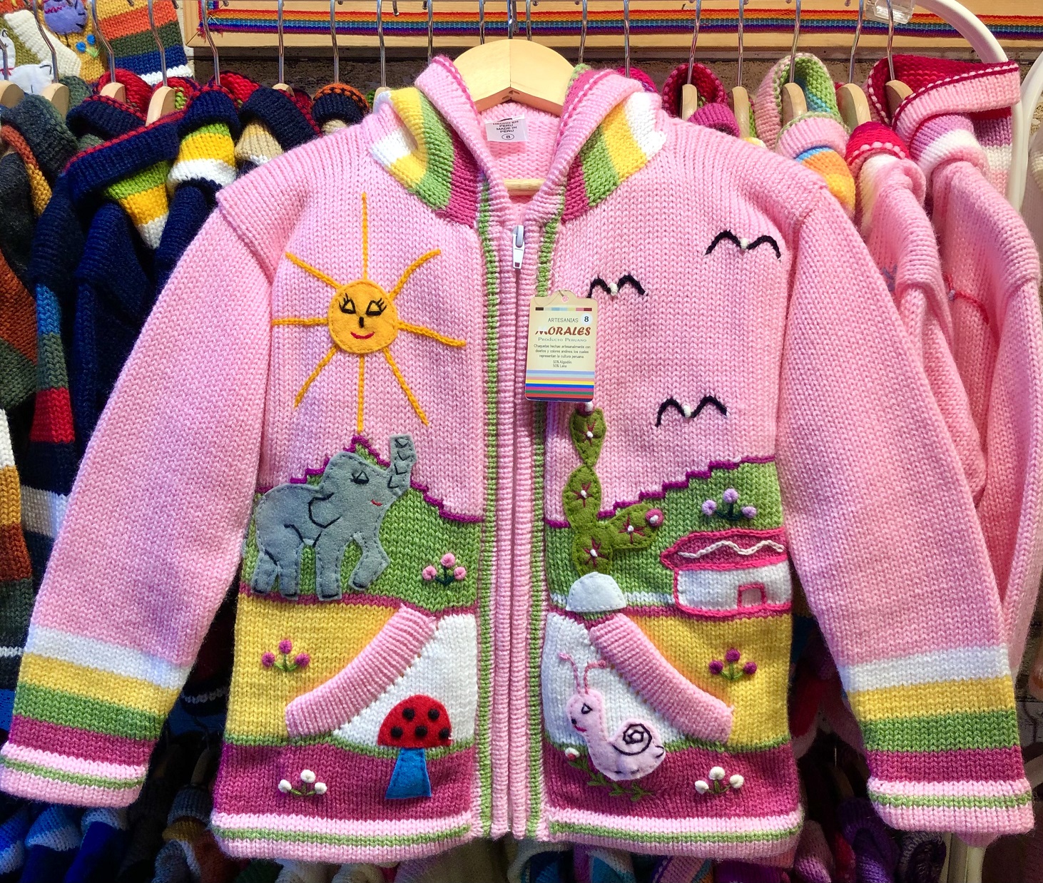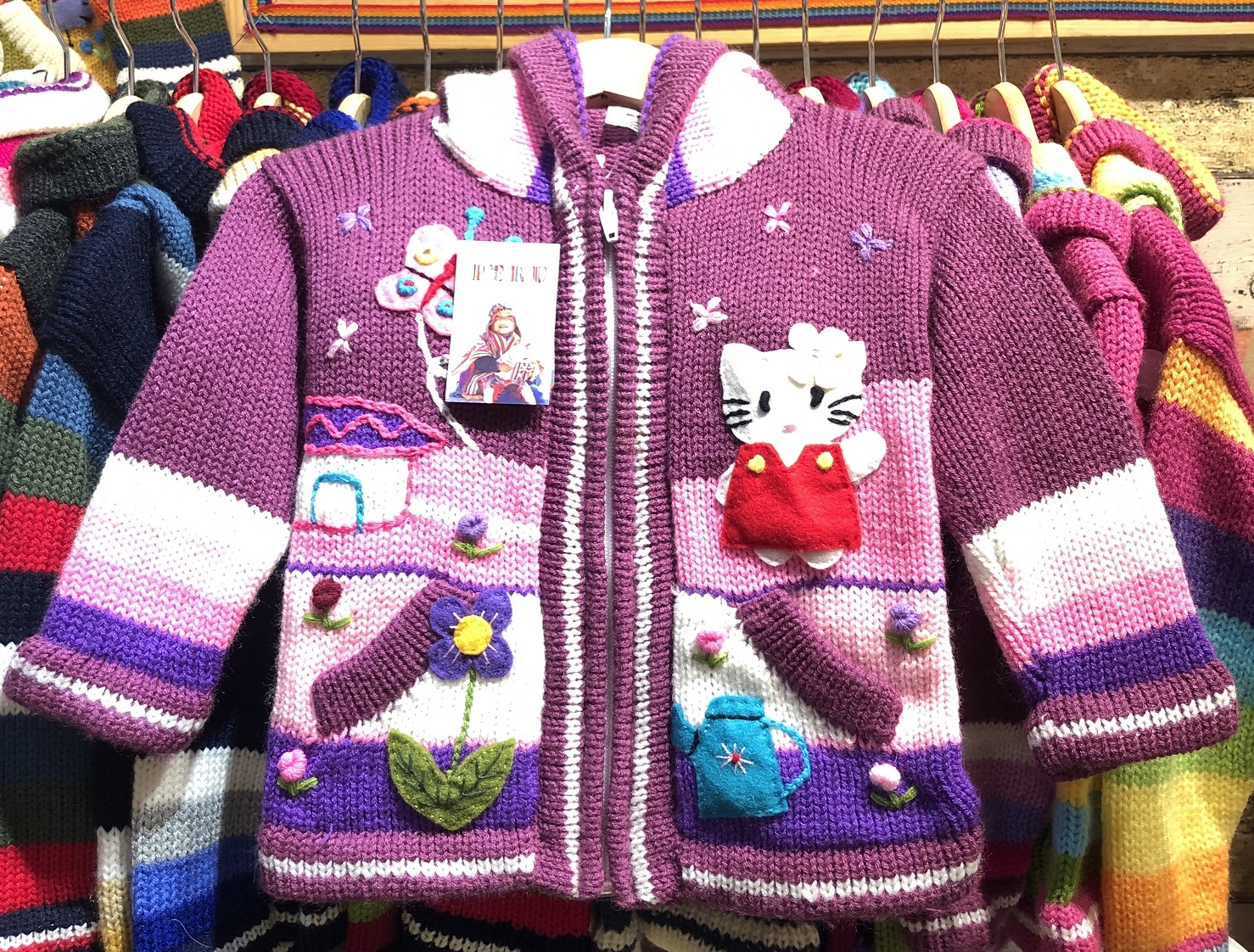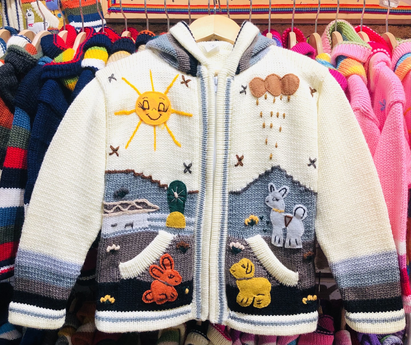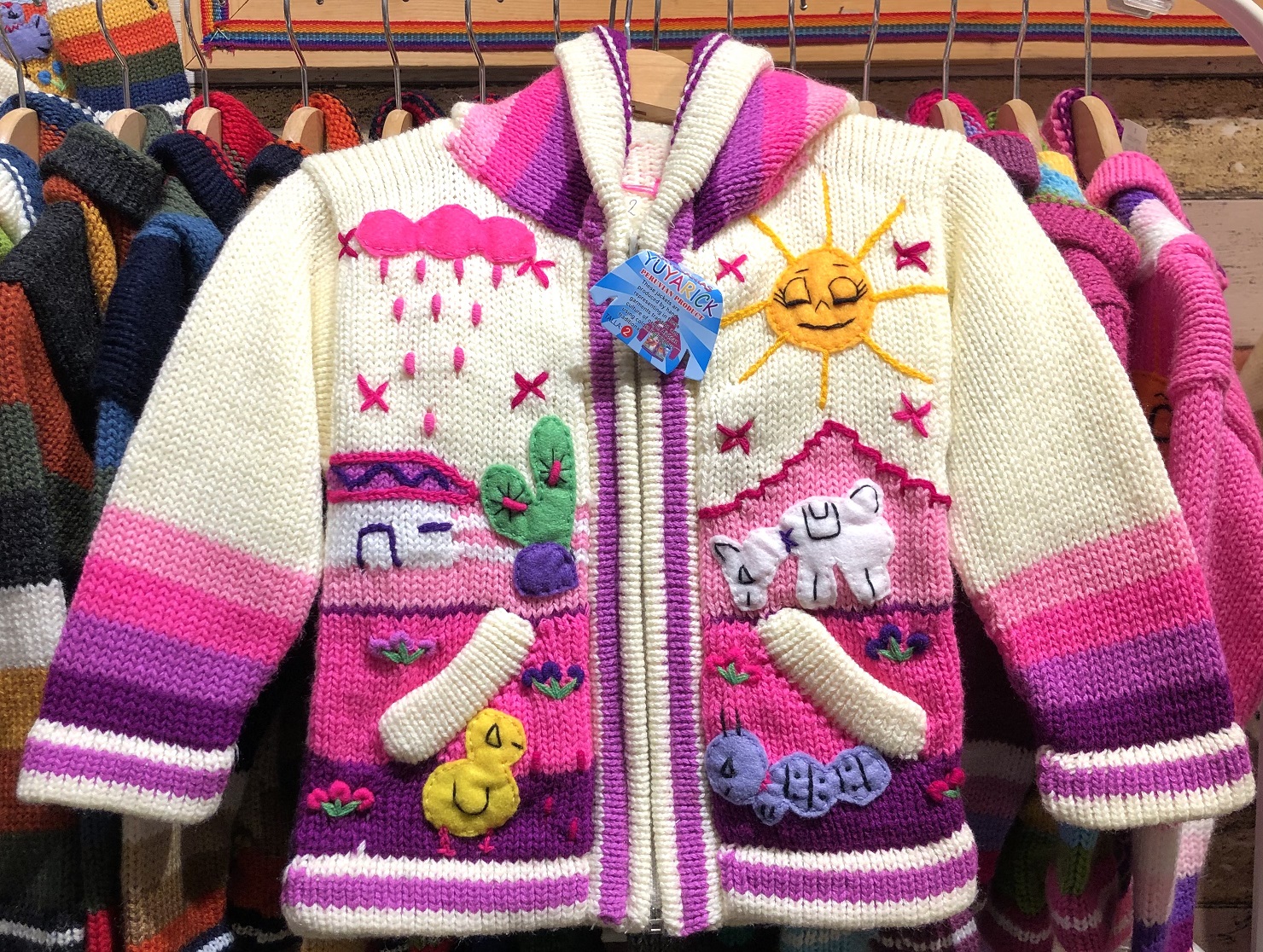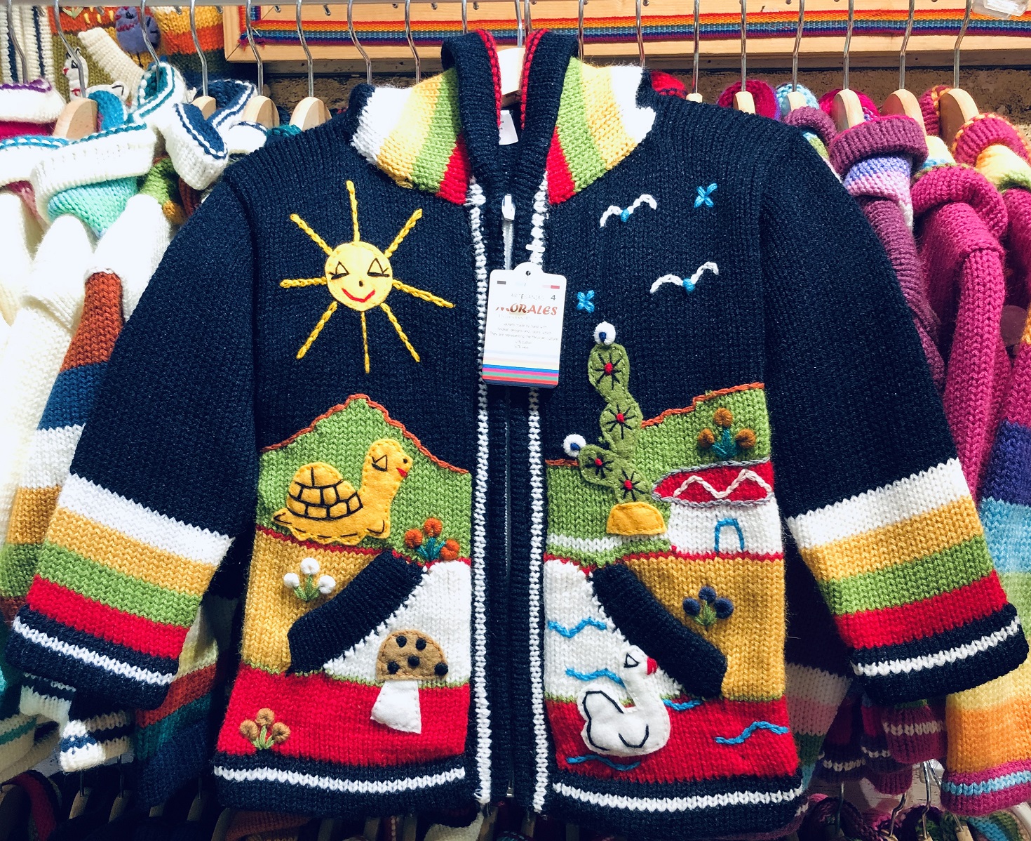 Peruvian children's winter hat with scenes from the Peruvian countryside both front and back. Every detail is hand embroidered and finished to create a 3-D effect. Suitable for children from 0 to 3 years.