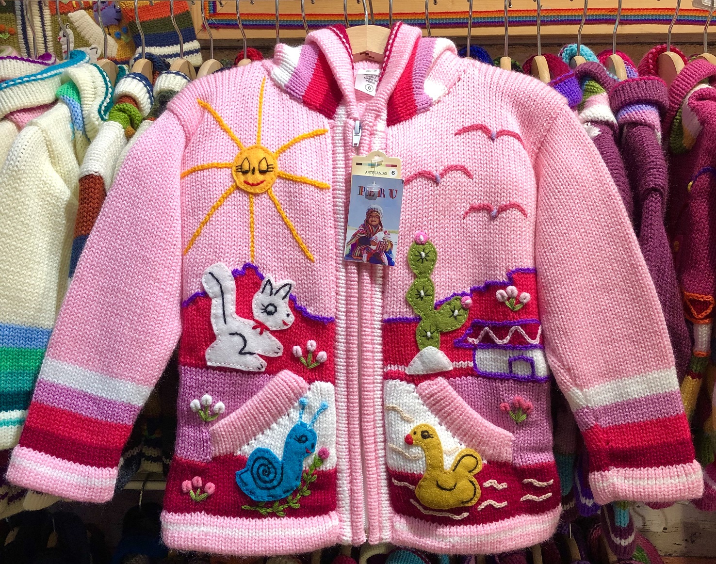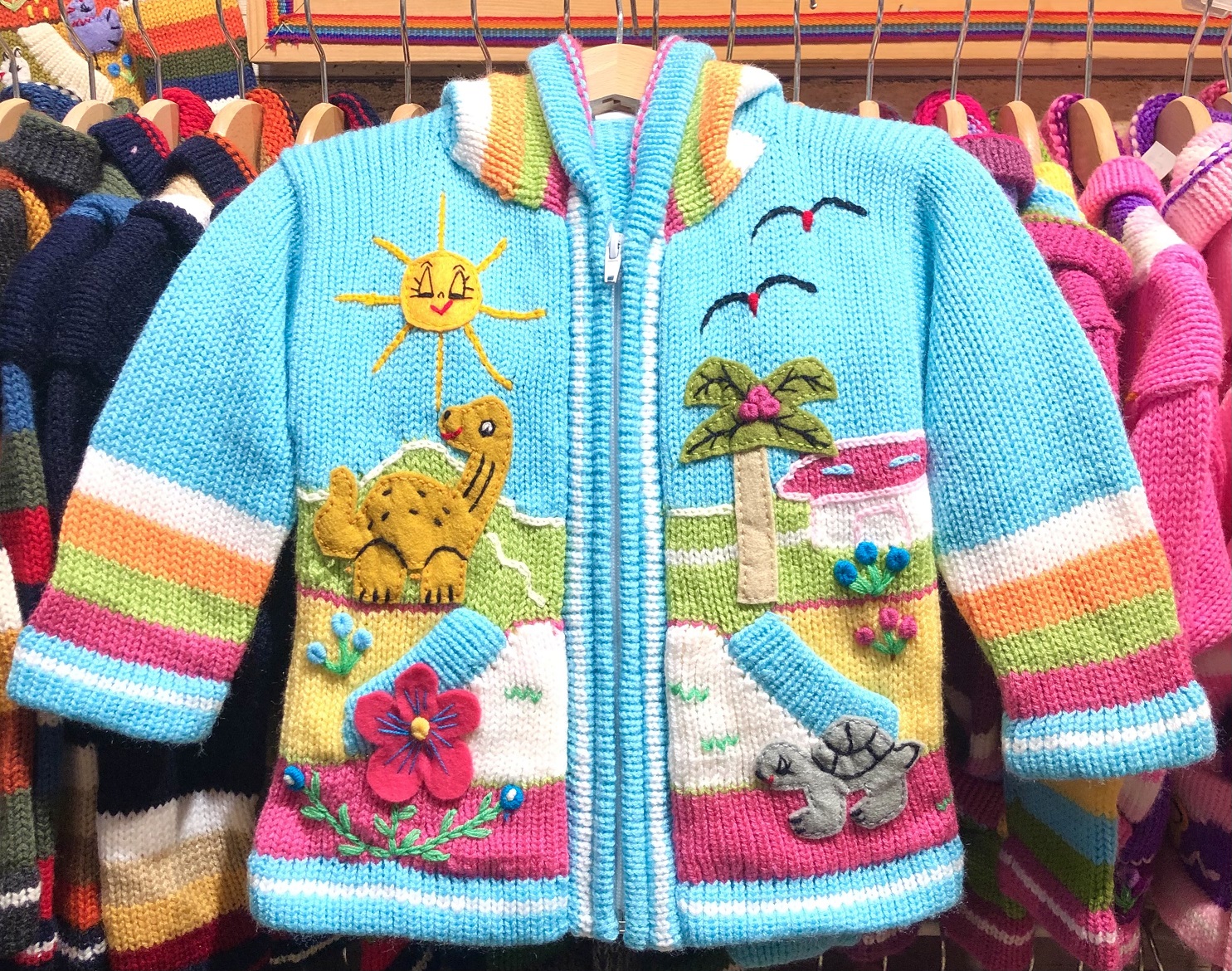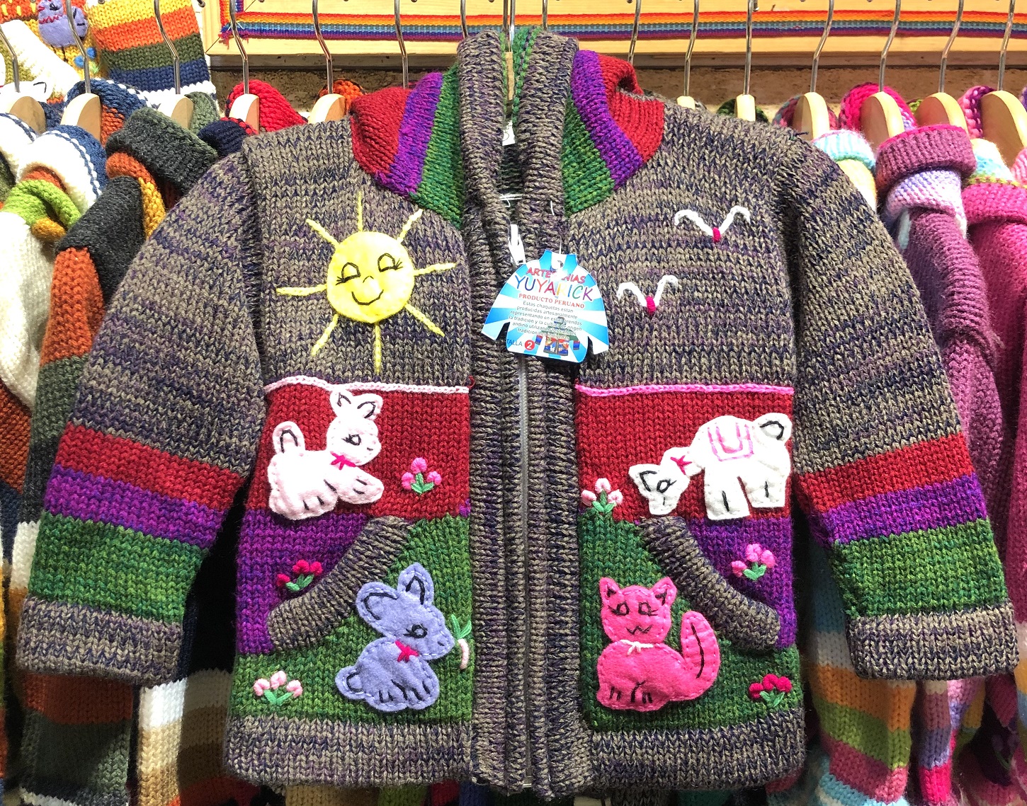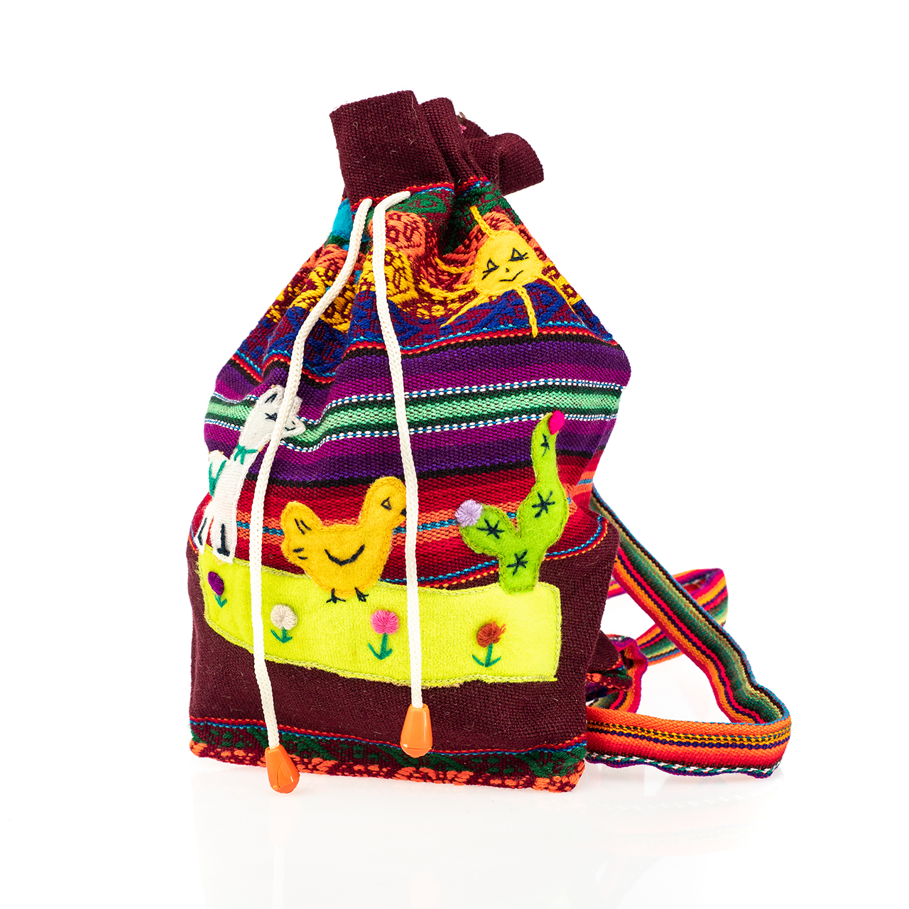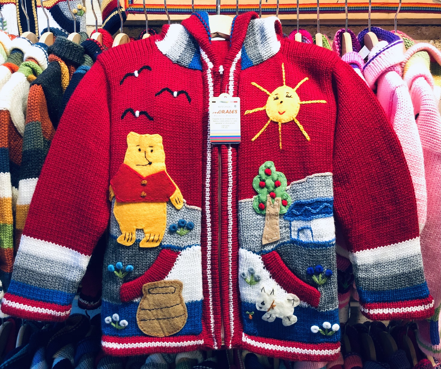 Peruvian children's winter hat with scenes from the Peruvian countryside both front and back. Every detail is hand embroidered and finished to create a 3-D effect. Suitable for children from 0 to 3 years.