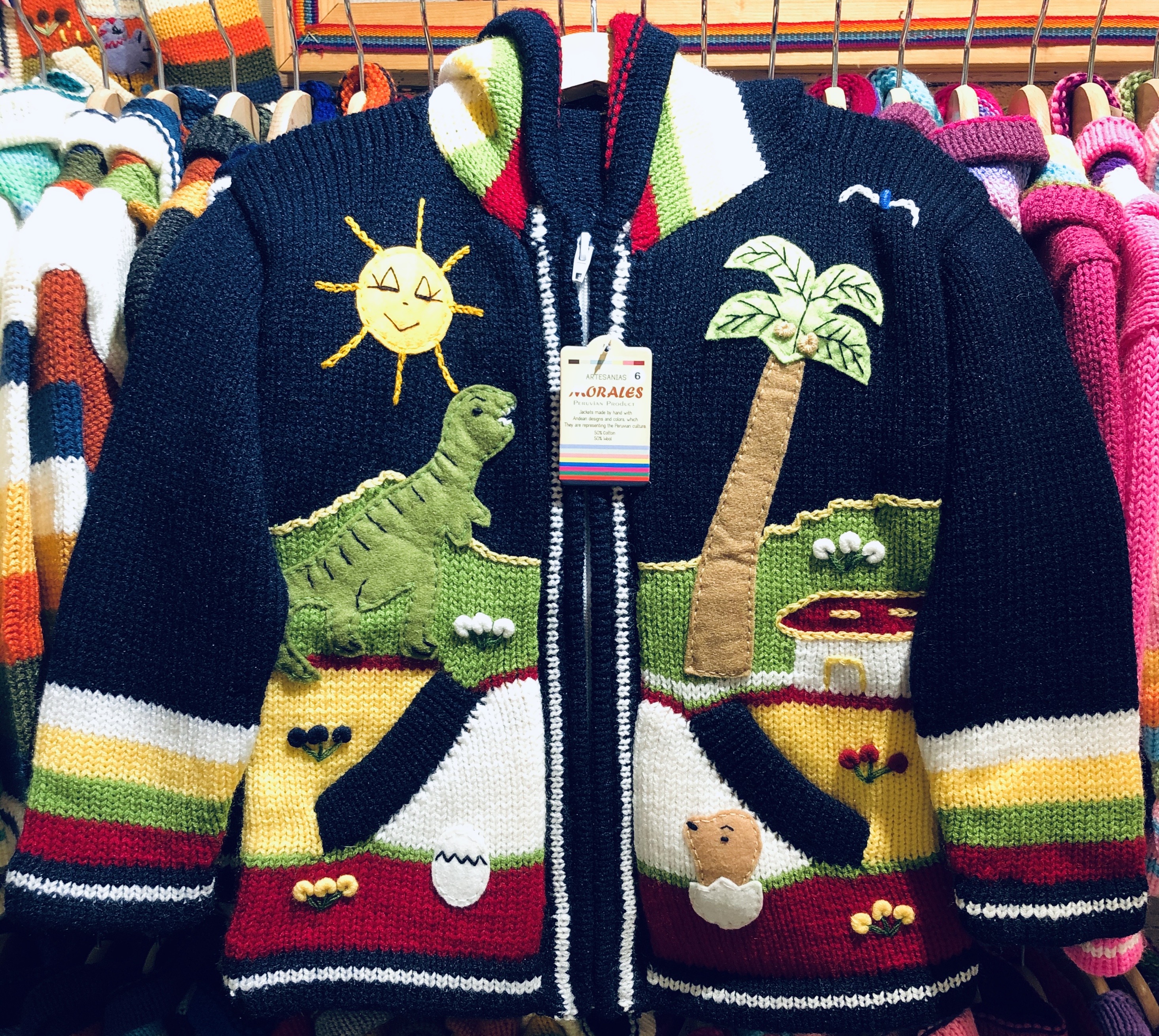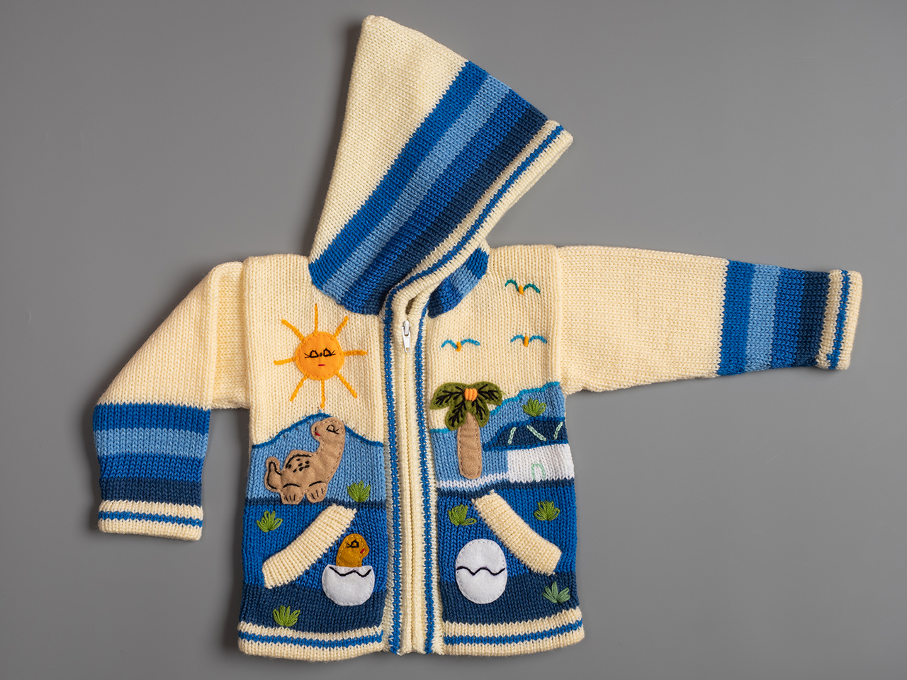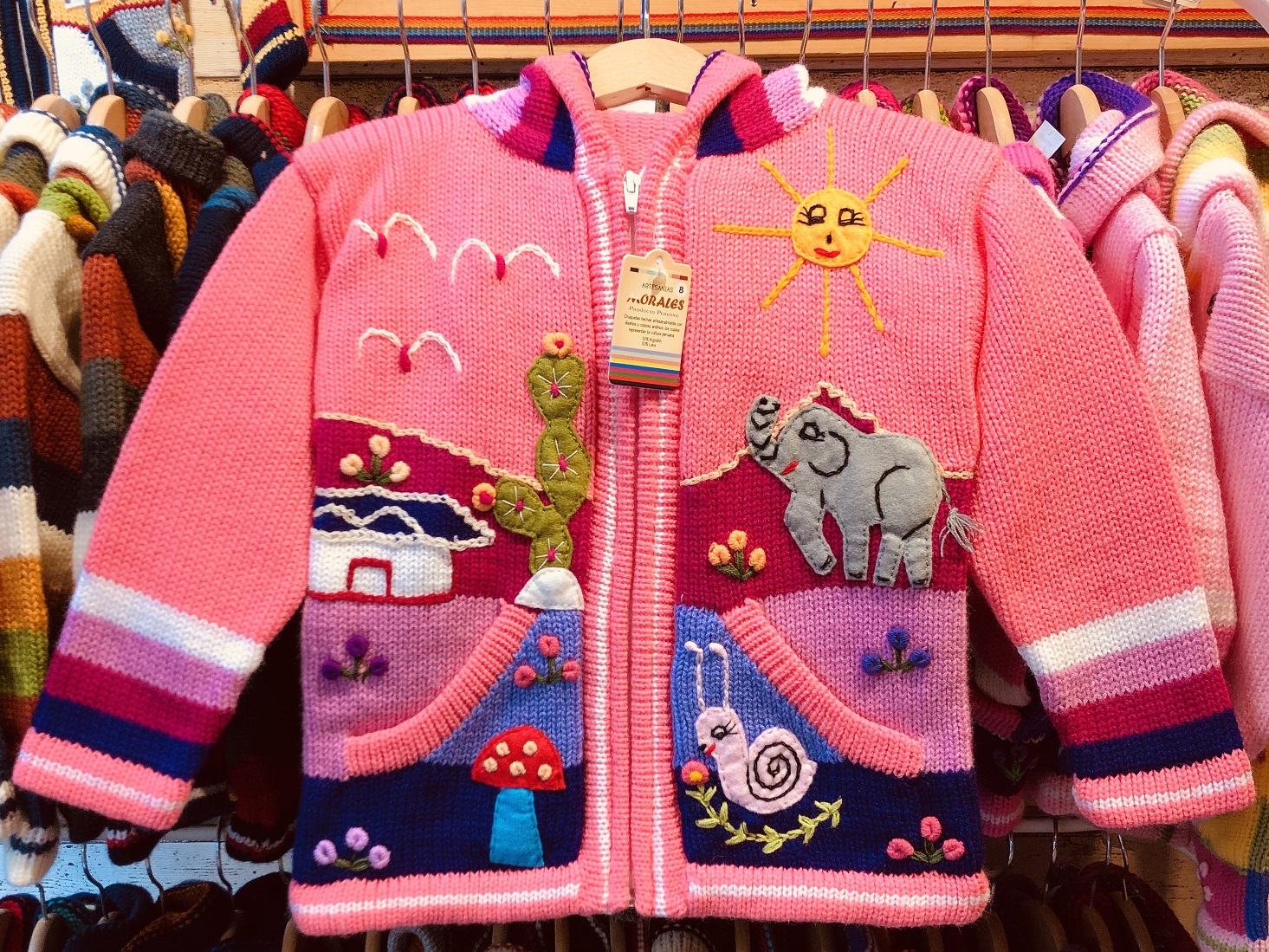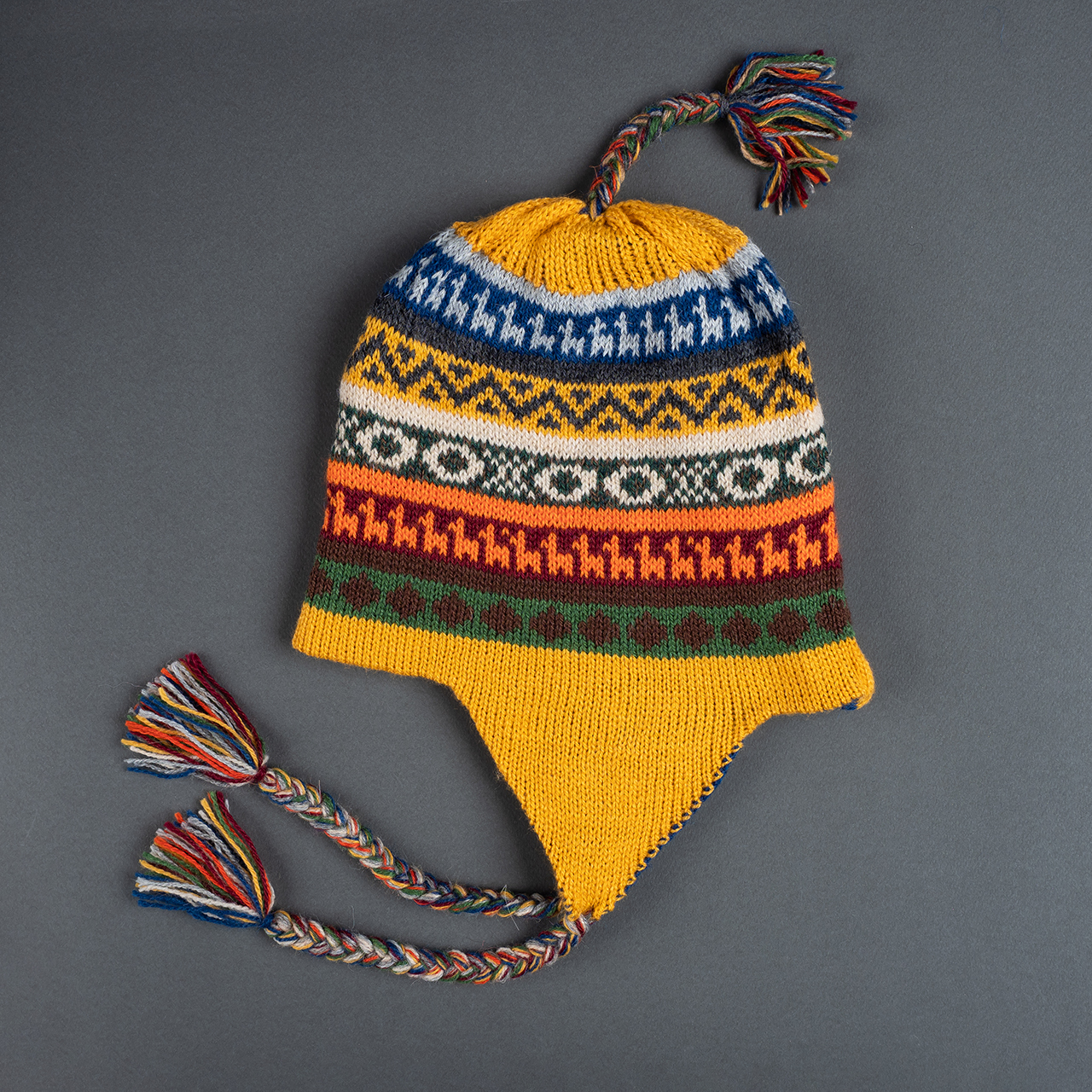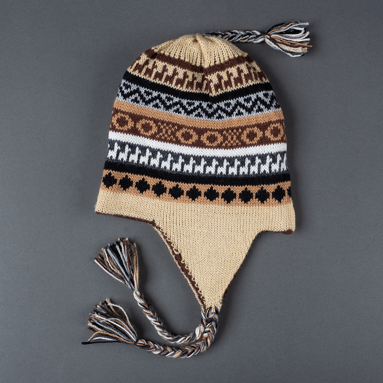 Peruvian children's winter hat with scenes from the Peruvian countryside both front and back. Every detail is hand embroidered and finished to create a 3-D effect. Suitable for children from 0 to 3 years.