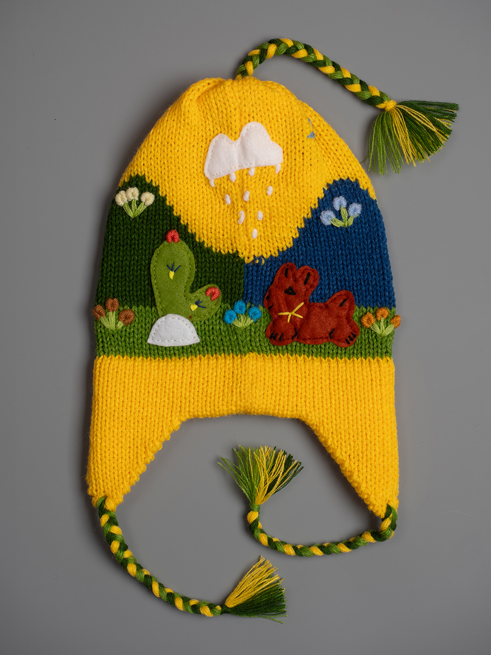 Детска шапка жълта 2 - 8 години 15 € Перуанска детска зимна шапка със сцени от андинската природа, както отпред, така и отзад. Всеки детайл е ръчно зашит и завършен, за да се създаде 3-D ефект. Подходяща за деца от 2 до 8 години. « producto anterior siguiente producto » Añadir a la cesta