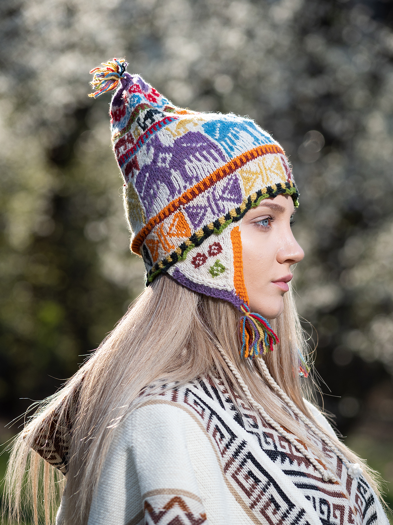Auténtico chullo tejido a mano con cinco palitos en lana de oveja. Тeñidos a base de plantas en diferentes colores y tonalidades. Son elaborados en la comunidad Chulloruwana Wasi, Sicuani, Cusco. Los colores representan la Montaña de Siete Colores cerca de Cusco.