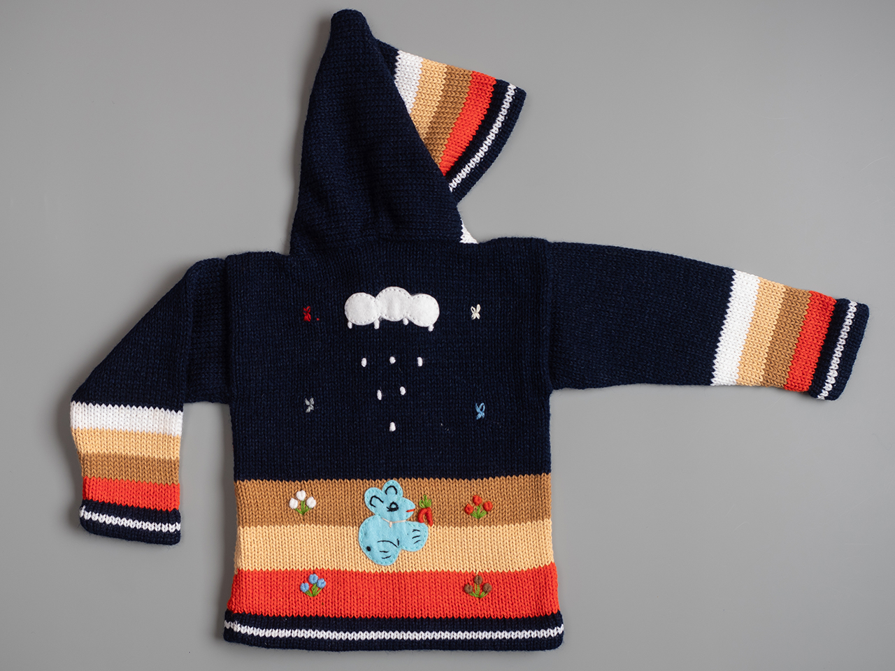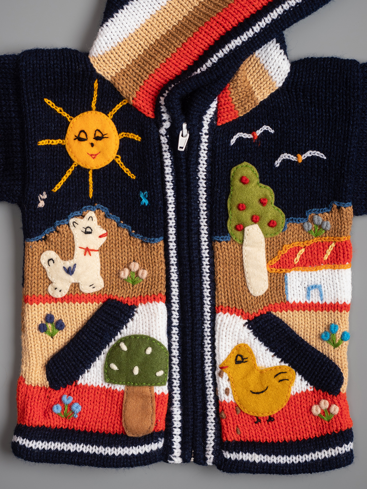 Conocidas en Perú como Chompas Arpilleras, las chaquetas son hechas a mano por artesanos de los Andes de las culturas nativas Quechua y Aymara. Representan escenas de la naturaleza peruana tanto por delante como por detrás de la prenda. El sol brilla en las montañas y las llamas y las gallinas se alimentan en las faldas de las colinas. Cada detalle está bordado a mano y acabado para crear un efecto tridimensional. Podemos ofrecerle una amplia gama de colores para niños y niñas, así como una selección de tallas de 0 a 7 años.