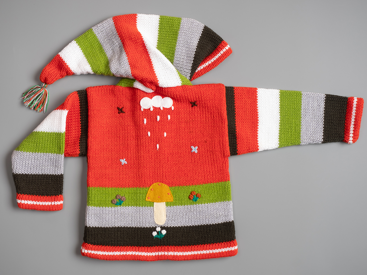 Conocidas en Perú como Chompas Arpilleras, las chaquetas son hechas a mano por artesanos de los Andes de las culturas nativas Quechua y Aymara. Representan escenas de la naturaleza peruana tanto por delante como por detrás de la prenda. El sol brilla en las montañas y las llamas y las gallinas se alimentan en las faldas de las colinas. Cada detalle está bordado a mano y acabado para crear un efecto tridimensional. Podemos ofrecerle una amplia gama de colores para niños y niñas, así como una selección de tallas de 0 a 7 años.