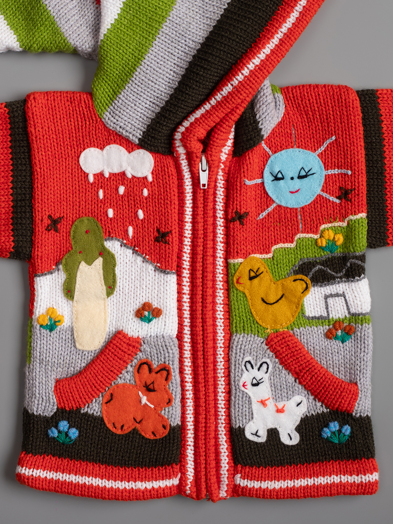 Conocidas en Perú como Chompas Arpilleras, las chaquetas son hechas a mano por artesanos de los Andes de las culturas nativas Quechua y Aymara. Representan escenas de la naturaleza peruana tanto por delante como por detrás de la prenda. El sol brilla en las montañas y las llamas y las gallinas se alimentan en las faldas de las colinas. Cada detalle está bordado a mano y acabado para crear un efecto tridimensional. Podemos ofrecerle una amplia gama de colores para niños y niñas, así como una selección de tallas de 0 a 7 años.